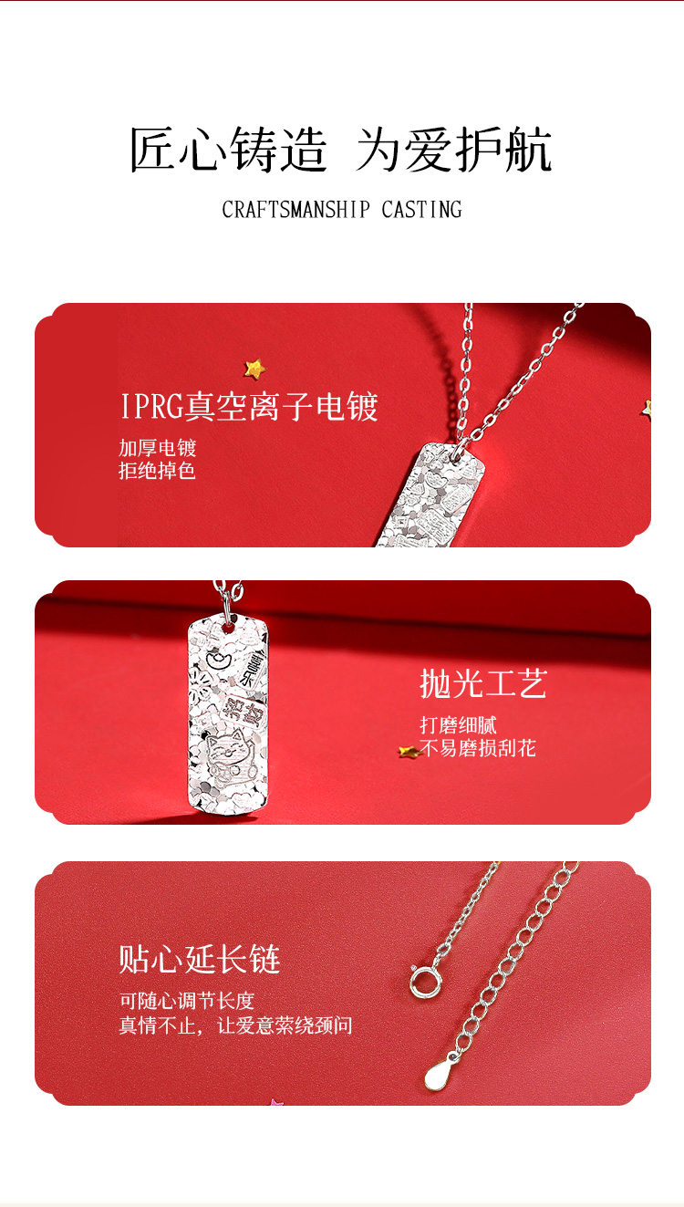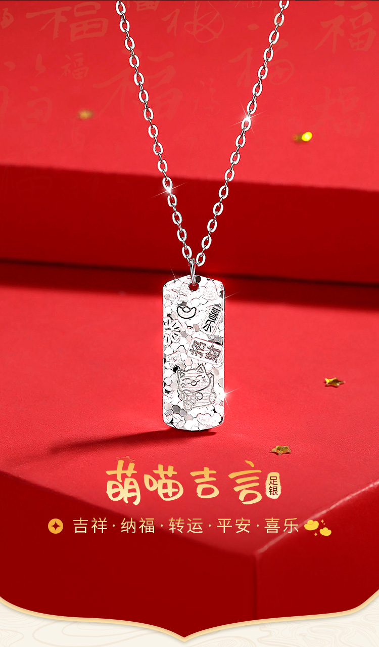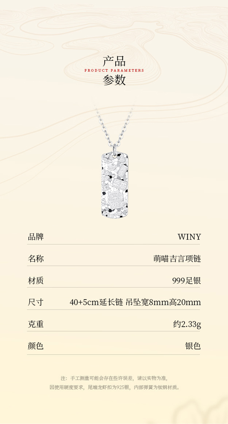 Winy 足银 999 萌喵聚财项链 银色长牌吊坠含喜乐招财纹 配证书足银饰品女款