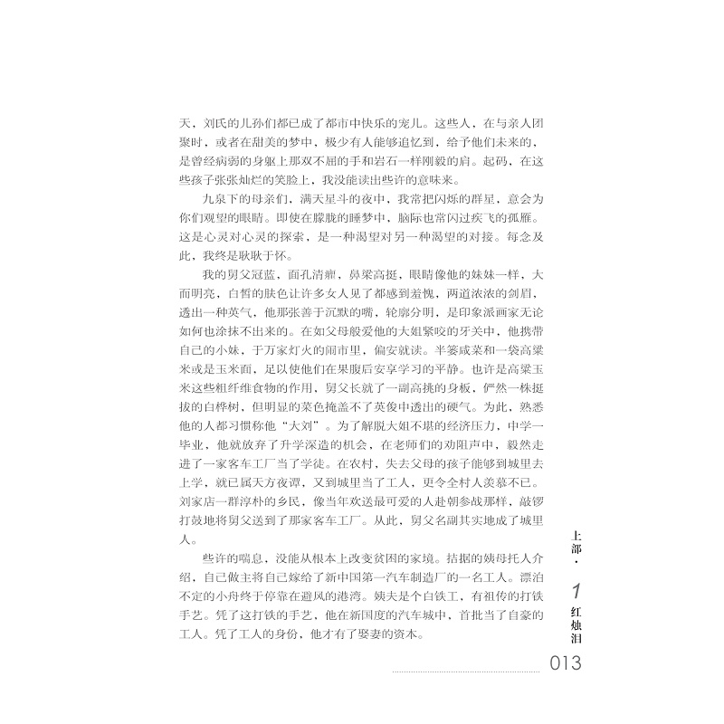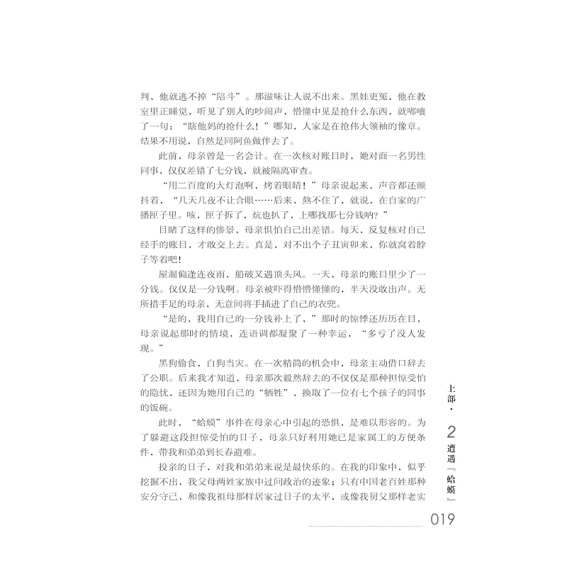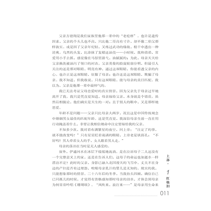 与其说这是一部小说,不如说它是一部艺术散文。作者在文字上倾注的真情,散文式的三维立体的叙述方式,为读者提供了一个解读人物和情节的二度空间。作者并不想在形式上创造什么,只想让读者在阅读中产生共鸣,更加喜欢用这种方式叙述的故事和塑造的人物。 众多人物的爱情、生活,理想、追求,为读者描述了一幅幅生动有趣的画面,或充满理想和热情,或渴望灵魂的宁静,或以自己的方式与命运抗争,或以善良的心期待着幸福,无论结果是悲剧还是喜剧,都会以令人震撼的真实描写、栩栩如生的人物形象、清新而不失幽默的文笔使读者感动。 本书的细节描写极具人性美,如两性心态的展示、人蜂之战的惨烈、人狼共舞的悲壮、生命的坚韧和脆弱、生活的苦涩和凄美、爱的迷惘和性的荒诞等,在特定的环境下表现得淋漓尽致。 作品以散文式的笔法,时空交错的场景描写,少年的视角和浓郁的抒情色彩再现了历史的真实,读罢,令人深思回味。