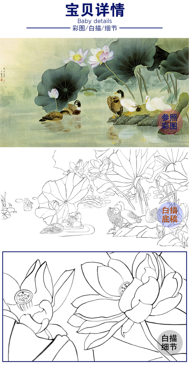 周中耀横幅工笔花鸟白描底稿-荷花鸭子荷塘-清凉世界FV09