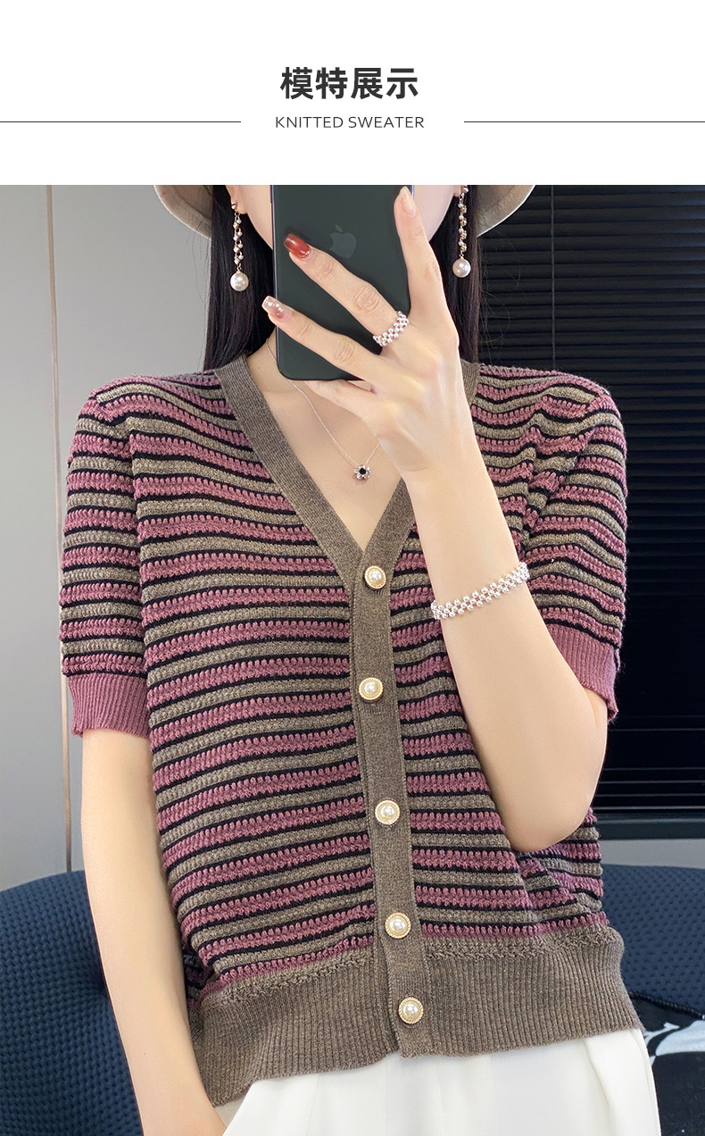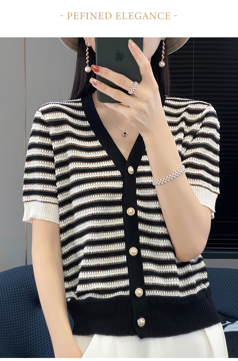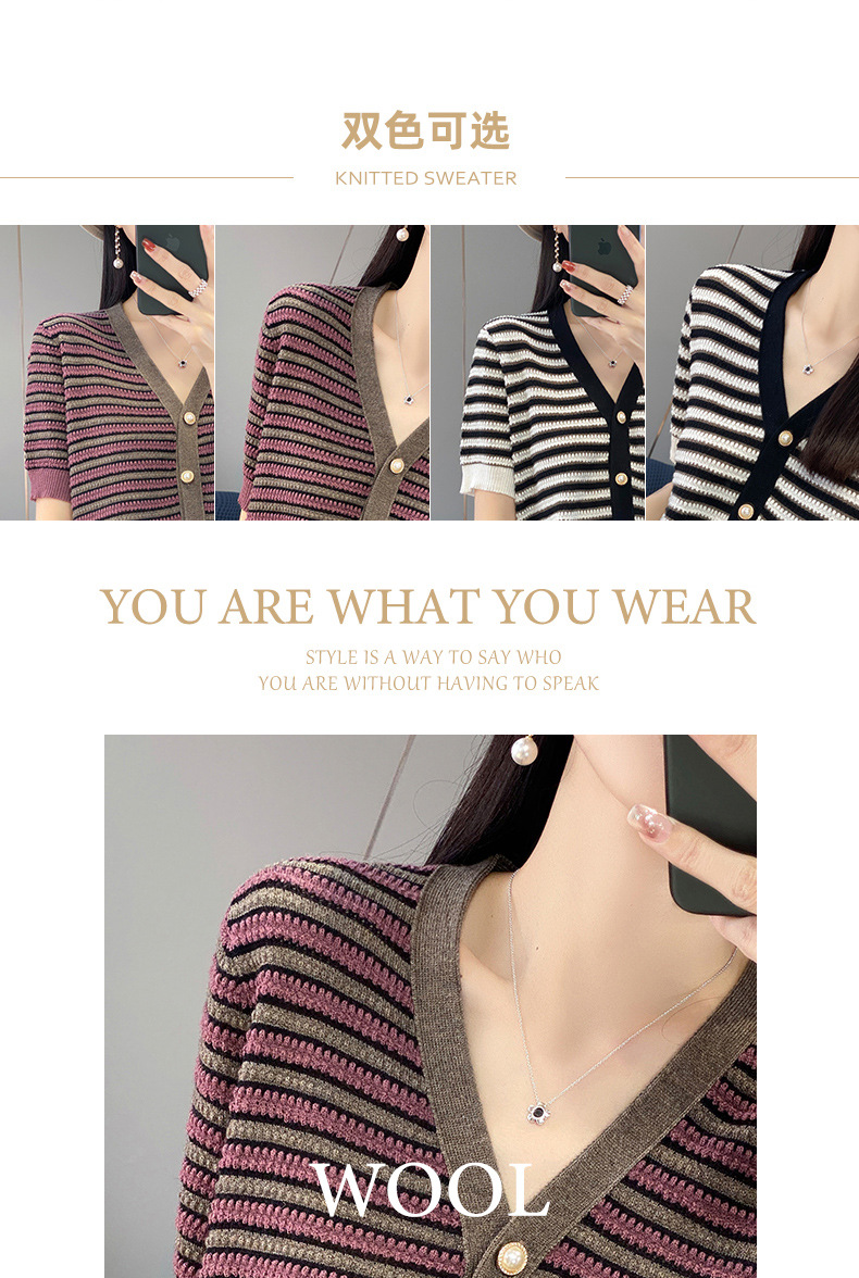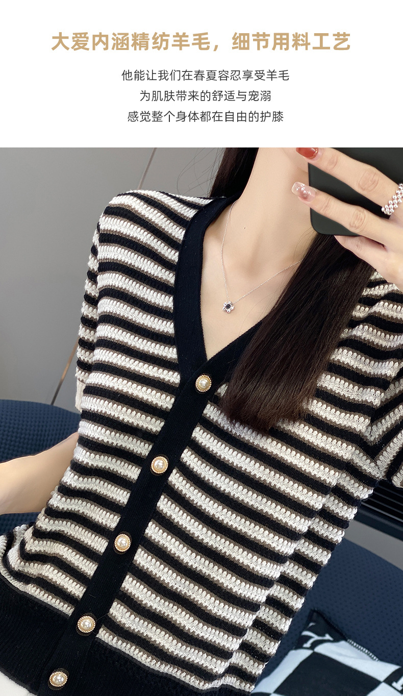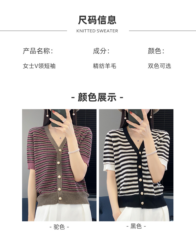 QHJY-JYA023185春夏中袖V领针织开衫上衣美丽诺羊毛修身薄款短袖打底衫女