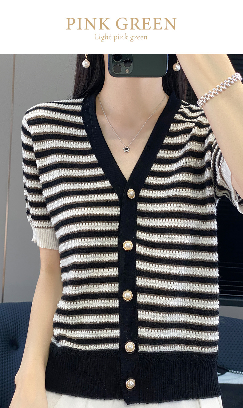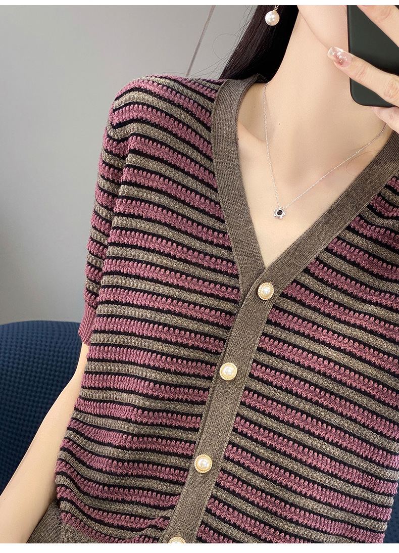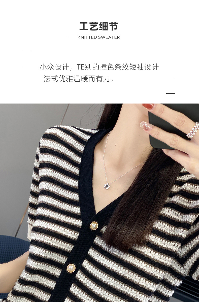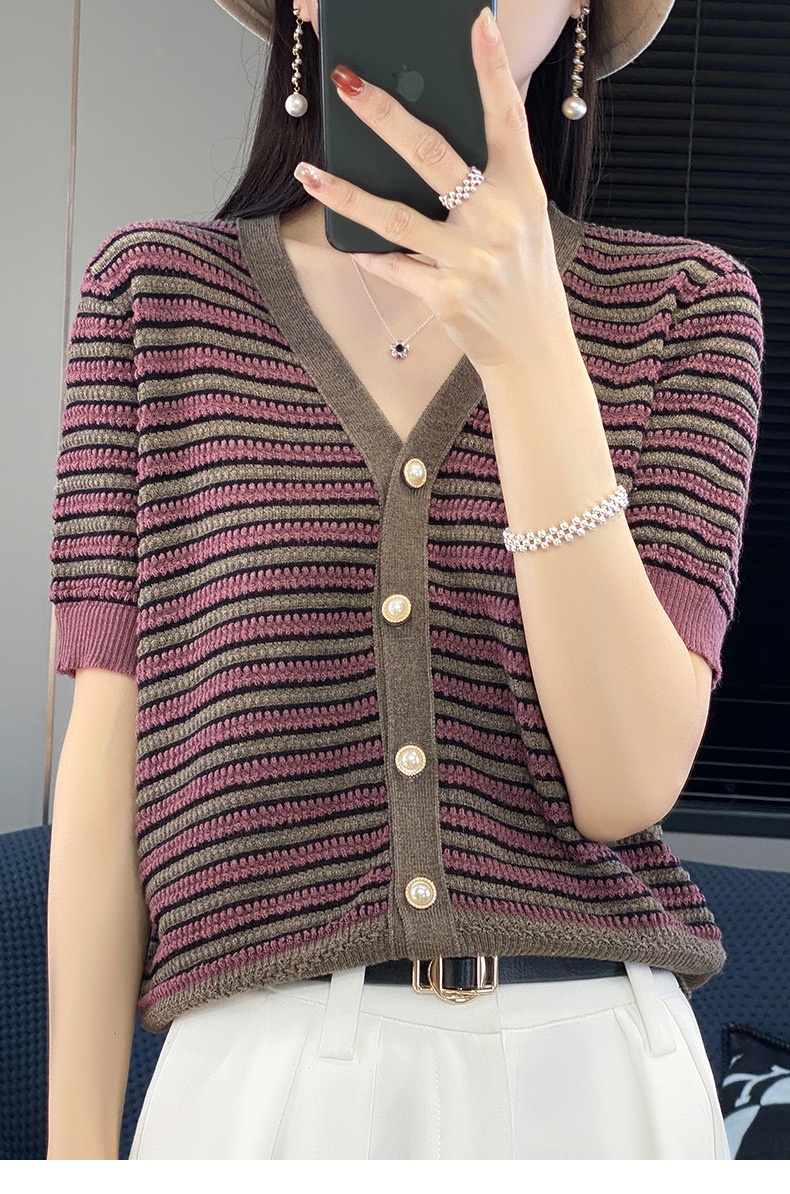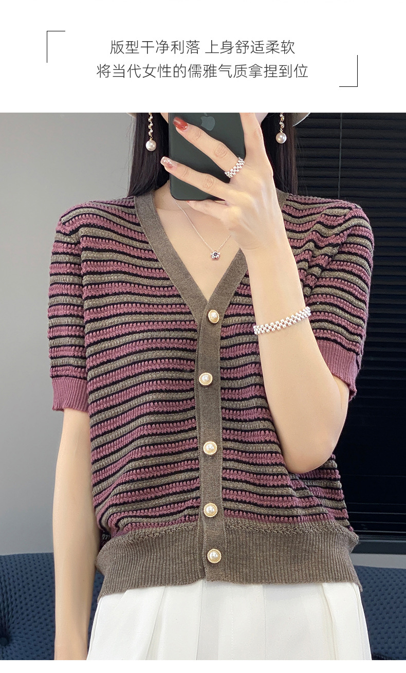 QHJY-JYA023185春夏中袖V领针织开衫上衣美丽诺羊毛修身薄款短袖打底衫女