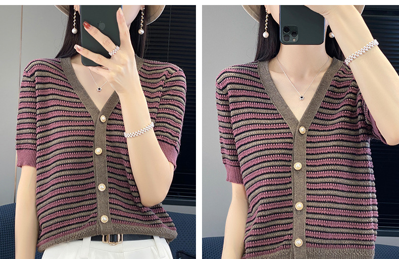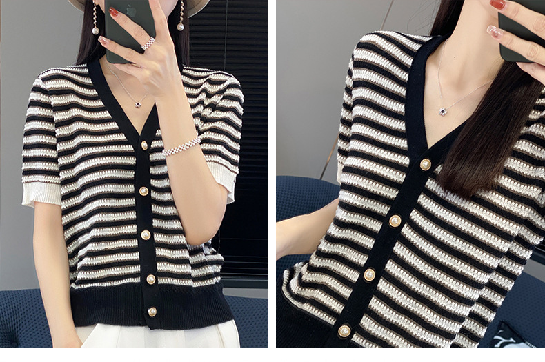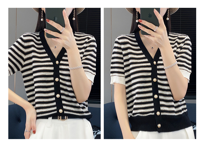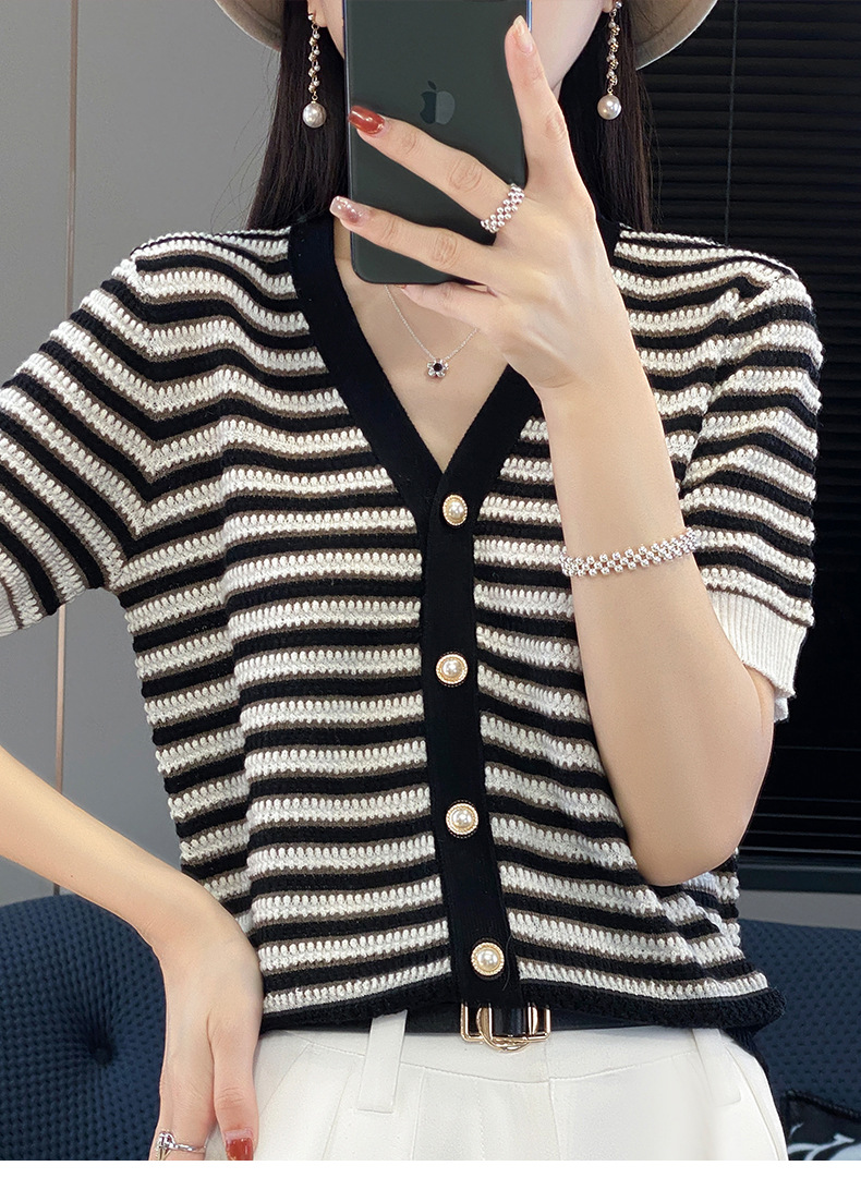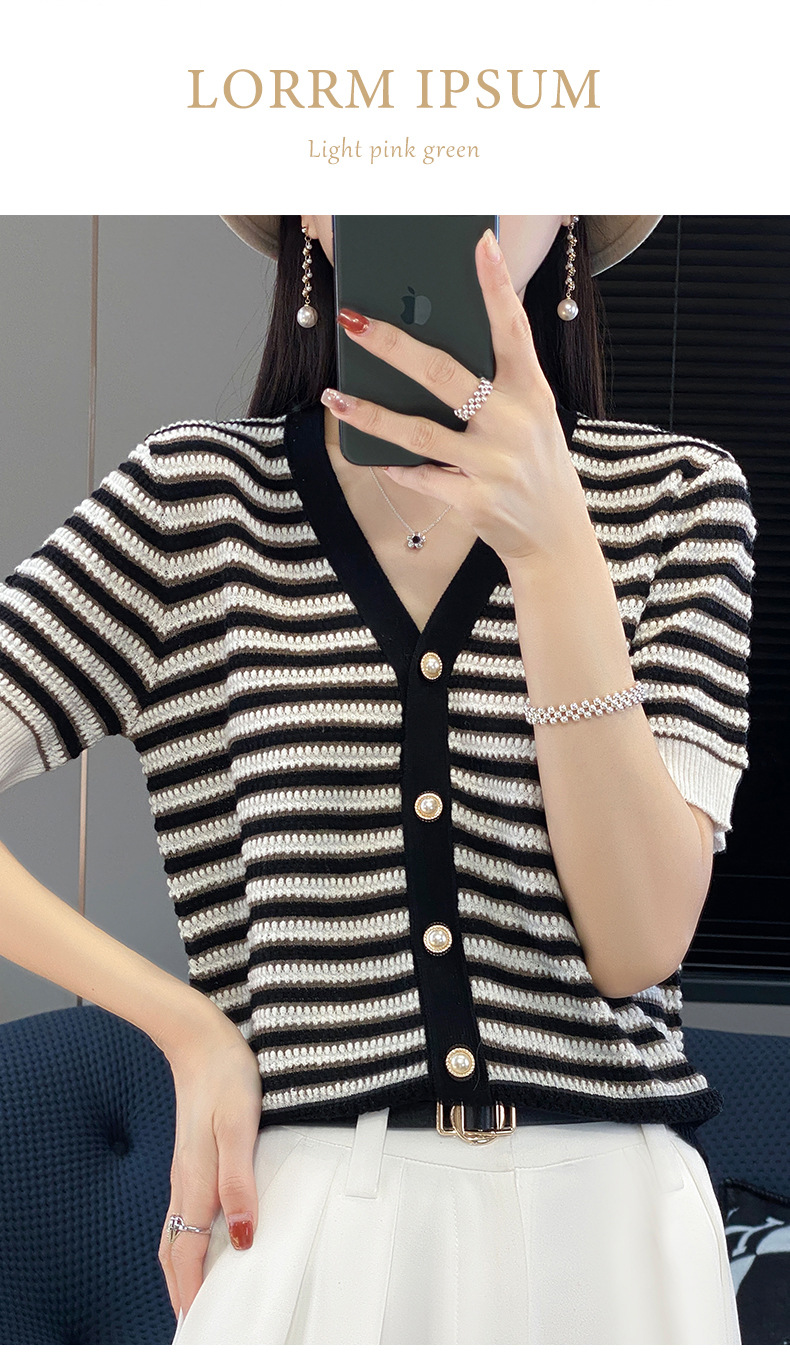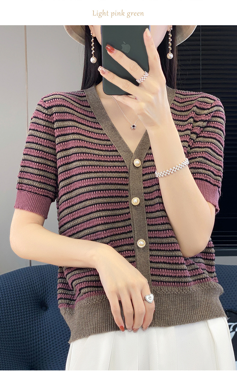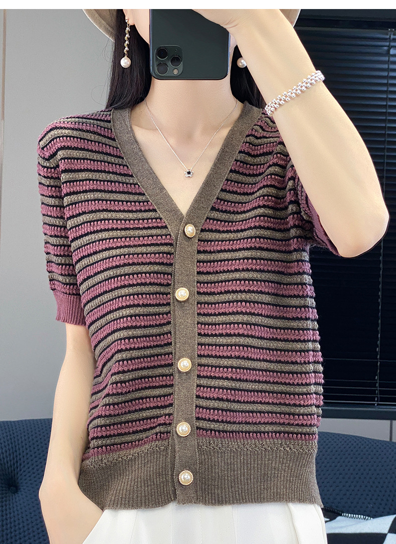 QHJY-JYA023185春夏中袖V领针织开衫上衣美丽诺羊毛修身薄款短袖打底衫女