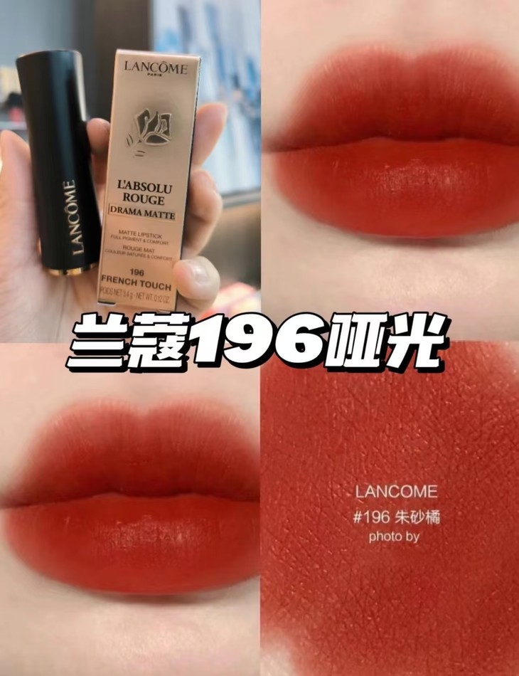 👑兰蔻小蛮腰菁纯哑光唇膏#196 💋全新升级哑光质地,高级丝绒雾面!! 🍊#196朱砂橘色,便橘调喔~,秋冬经典色🍂。 😍薄涂很日常,厚涂比较让人感觉惊艳 💃饱和度高,一秒提气色,且显白不挑皮,多种场合都能驾驭。 🙅颜色炸眼却不荧光,还带有点淡淡的玫瑰花香。 🌸花瓣膏头切割,很好勾勒唇形💄#196绝绝子,值得买💖