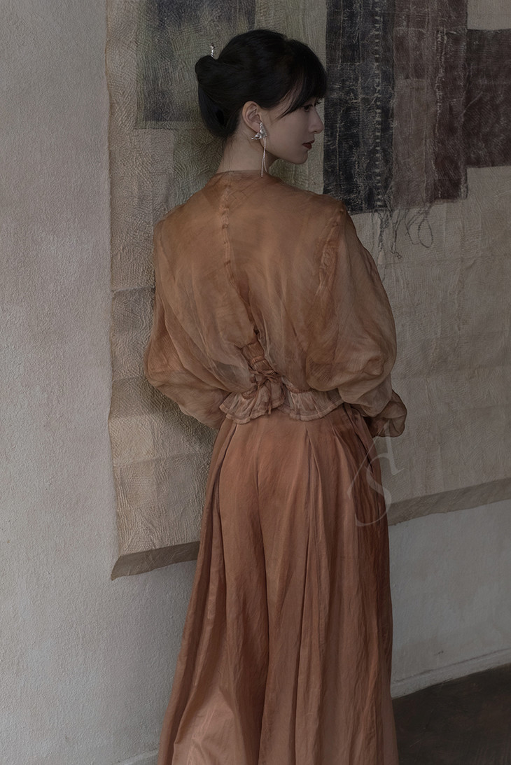 腰间的暗褶巧妙地修饰了腿部线条,又形成宽阔的下摆,行走间更添灵秀之气。采用穿着透气的桑蚕丝及棉混织,更富垂坠感与飘逸感,同时保留了面料裁剪的毛边,自然而浪漫。现有天然柿染色及豆绿色两色可选,采用天然的植物染色工艺,饱含多变的面料纹理,呈色更为温润。