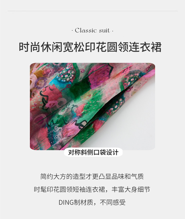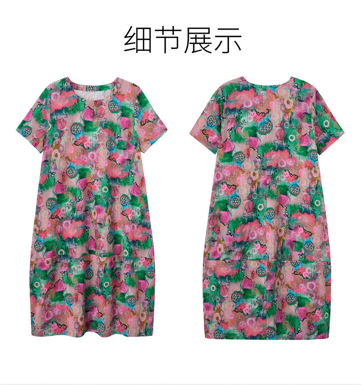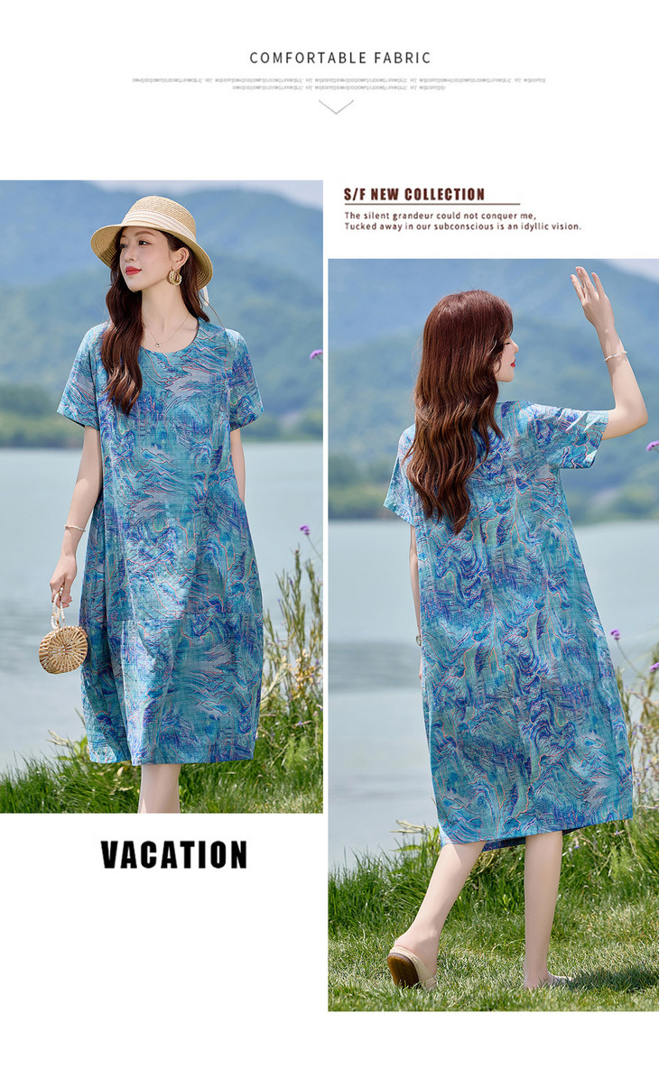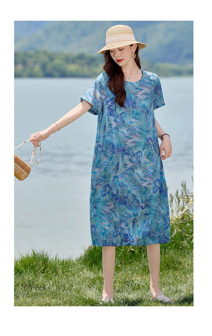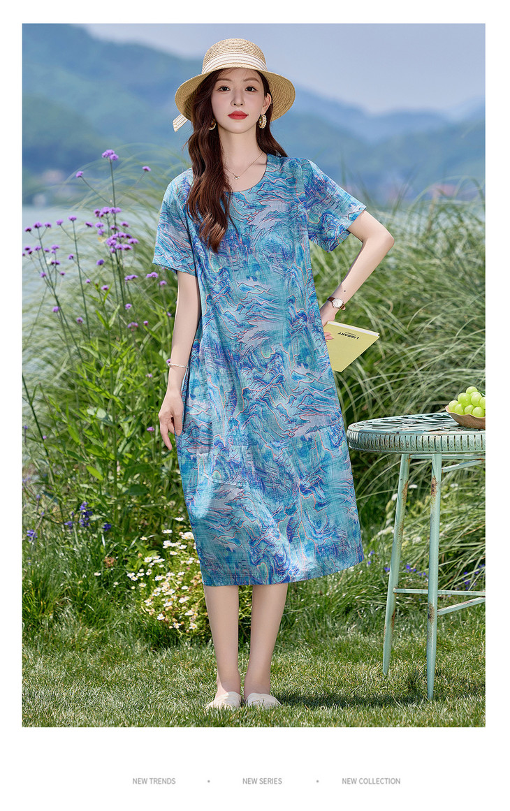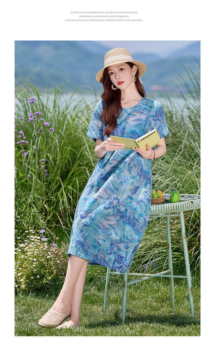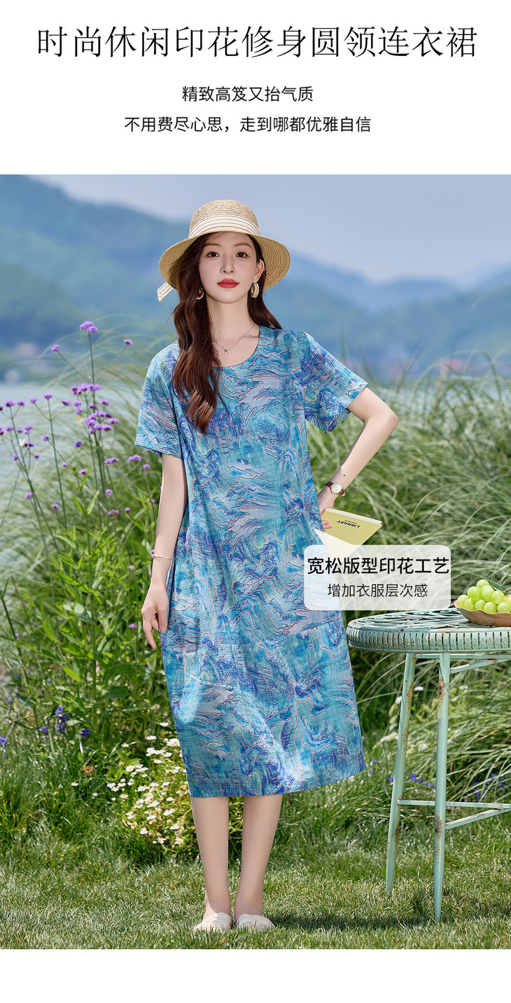 时尚印花圆领棉麻连衣裙,舒适休闲宽松显瘦裙子HR-NYMYZ307
