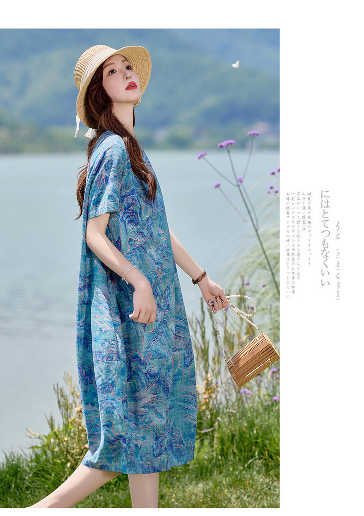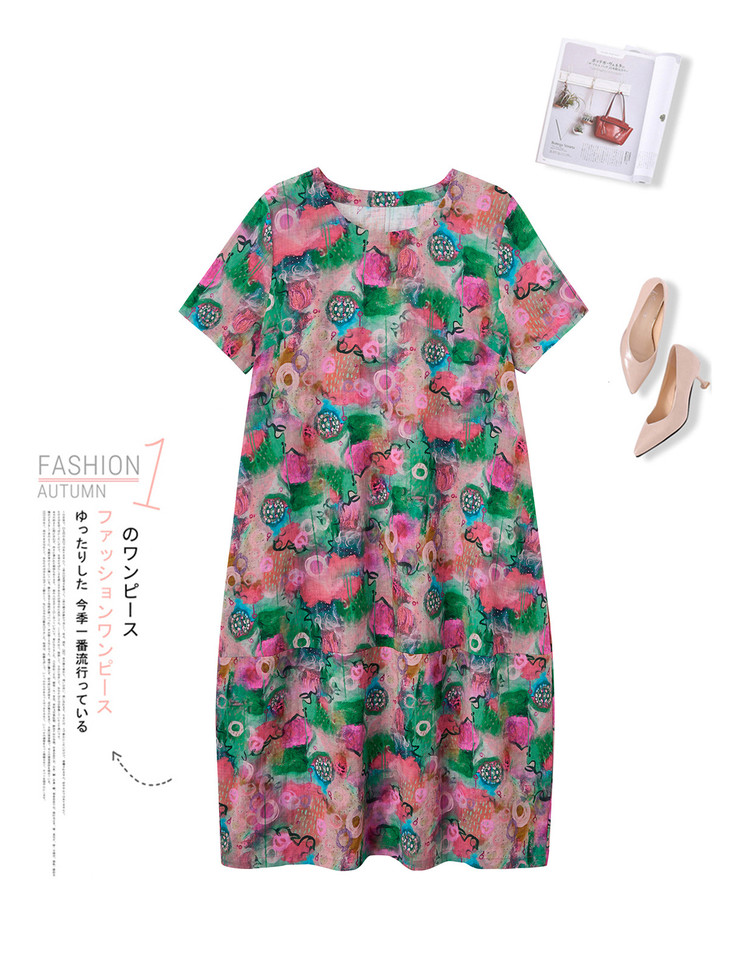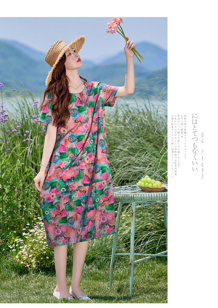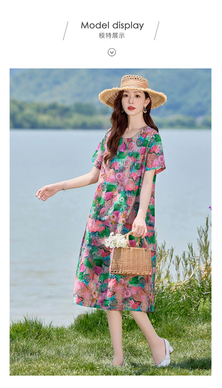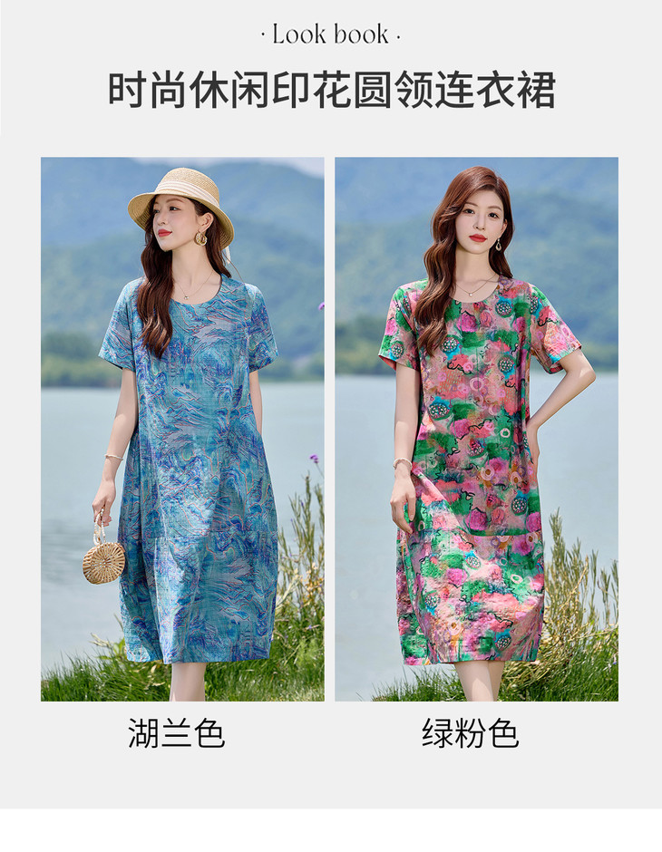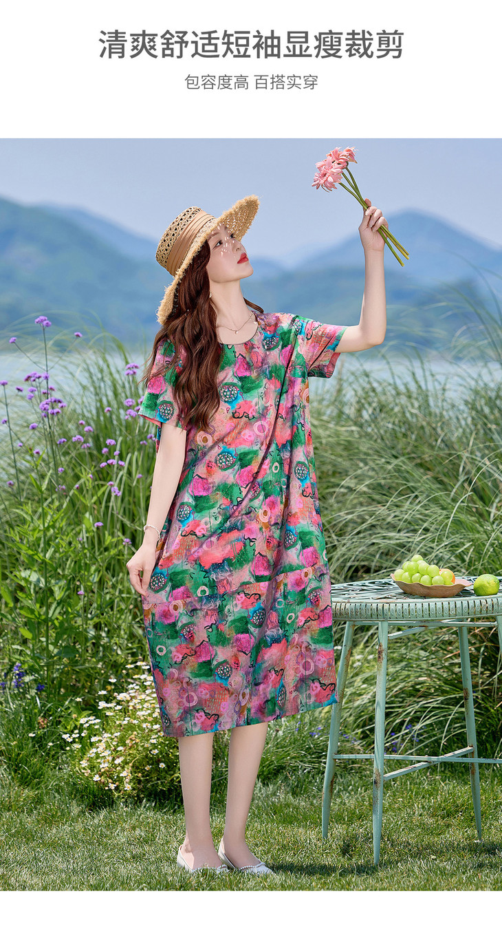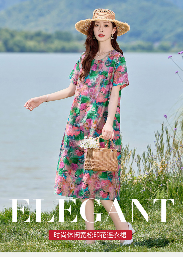 时尚印花圆领棉麻连衣裙,舒适休闲宽松显瘦裙子HR-NYMYZ307