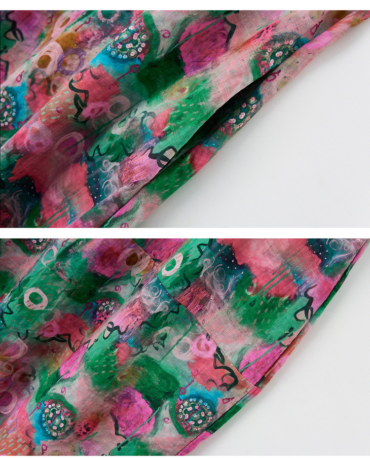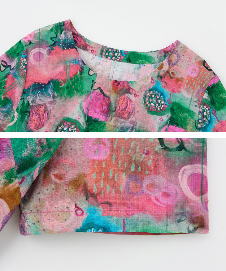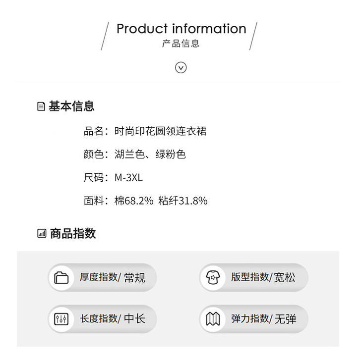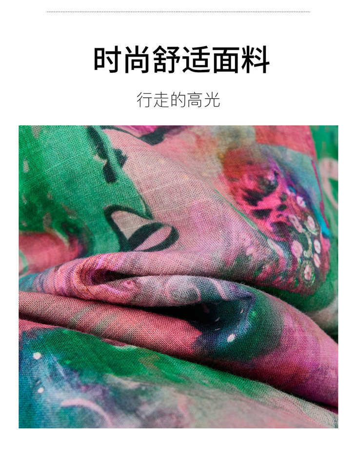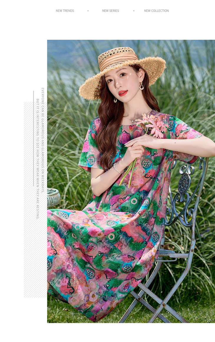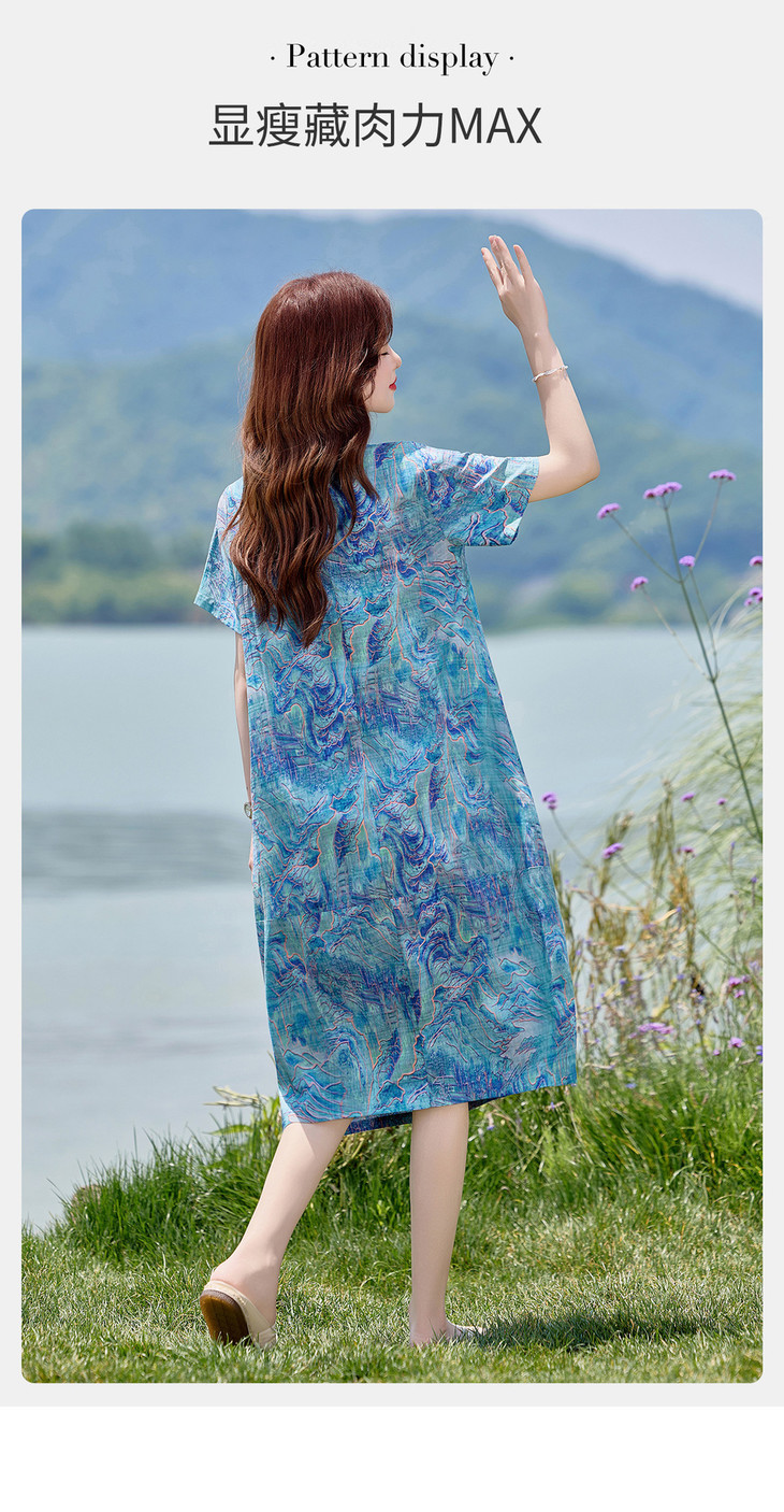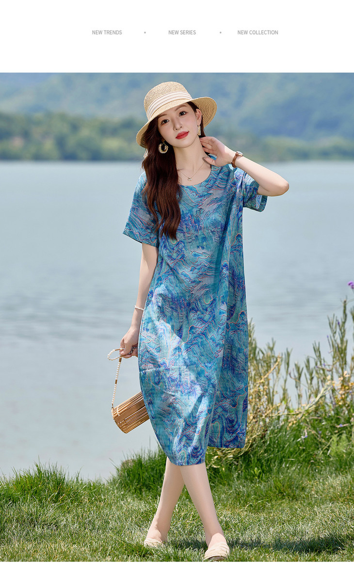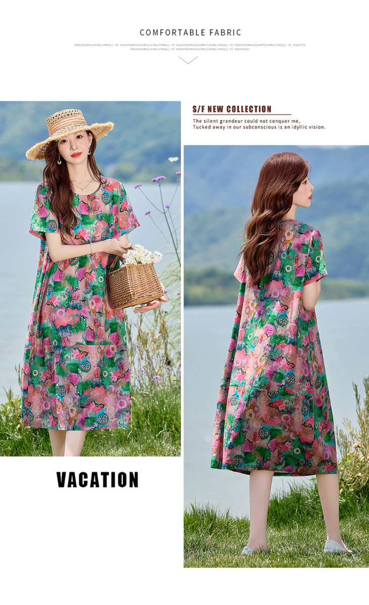 时尚印花圆领棉麻连衣裙,舒适休闲宽松显瘦裙子HR-NYMYZ307