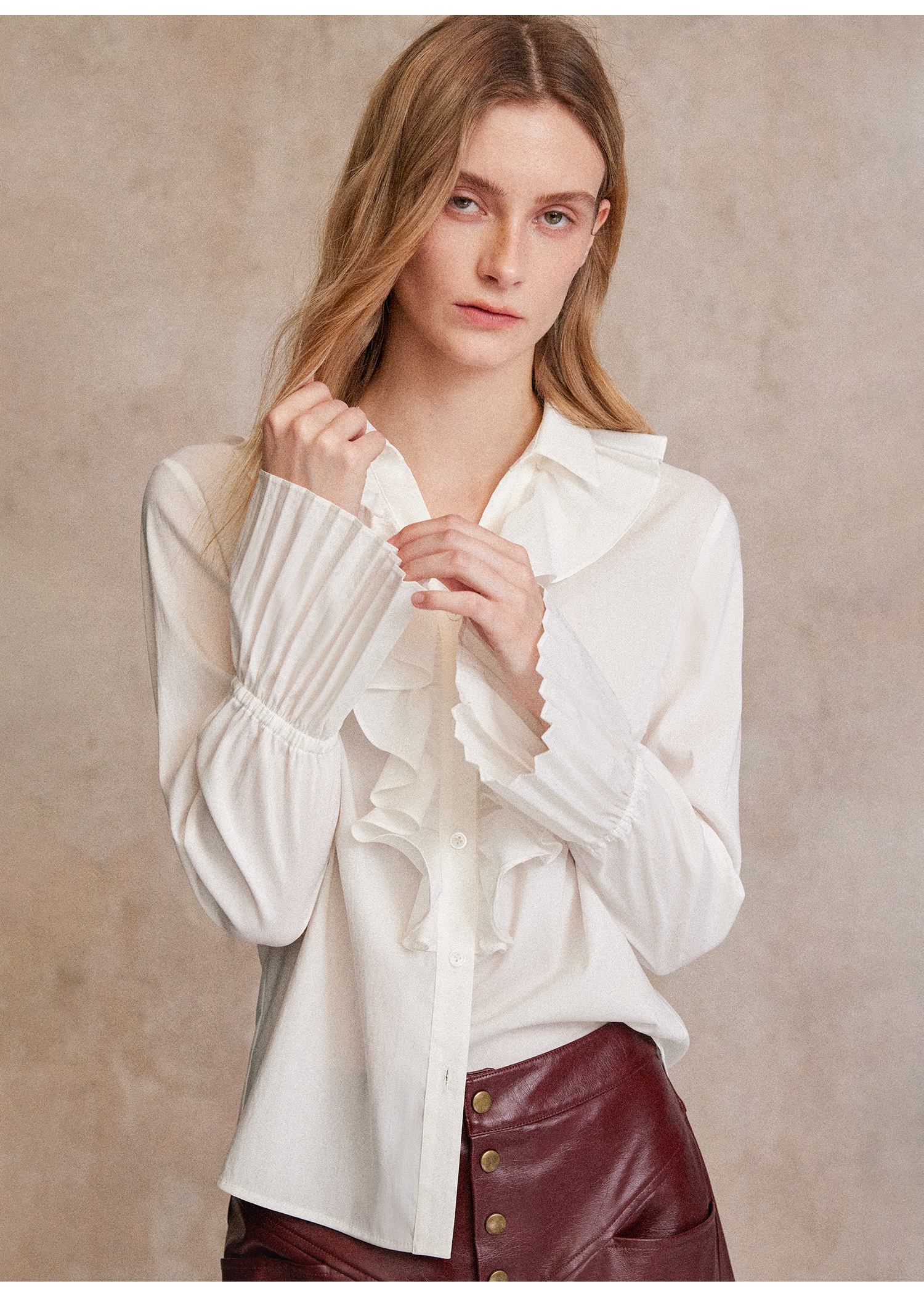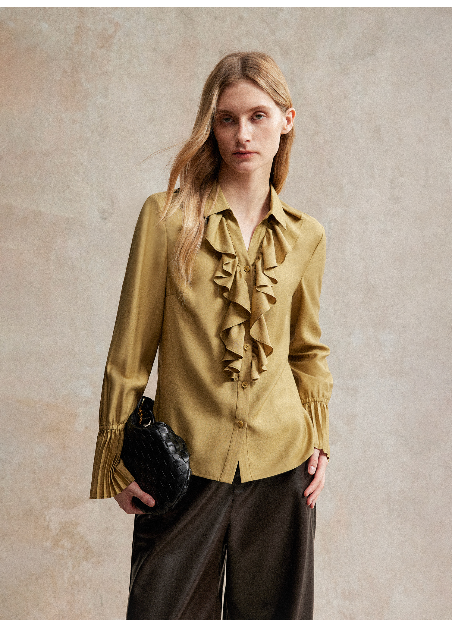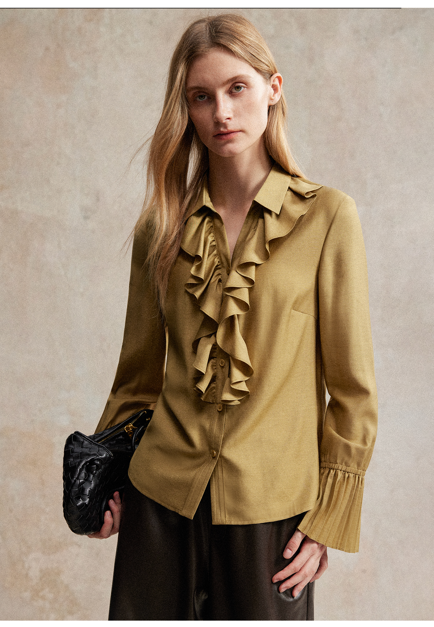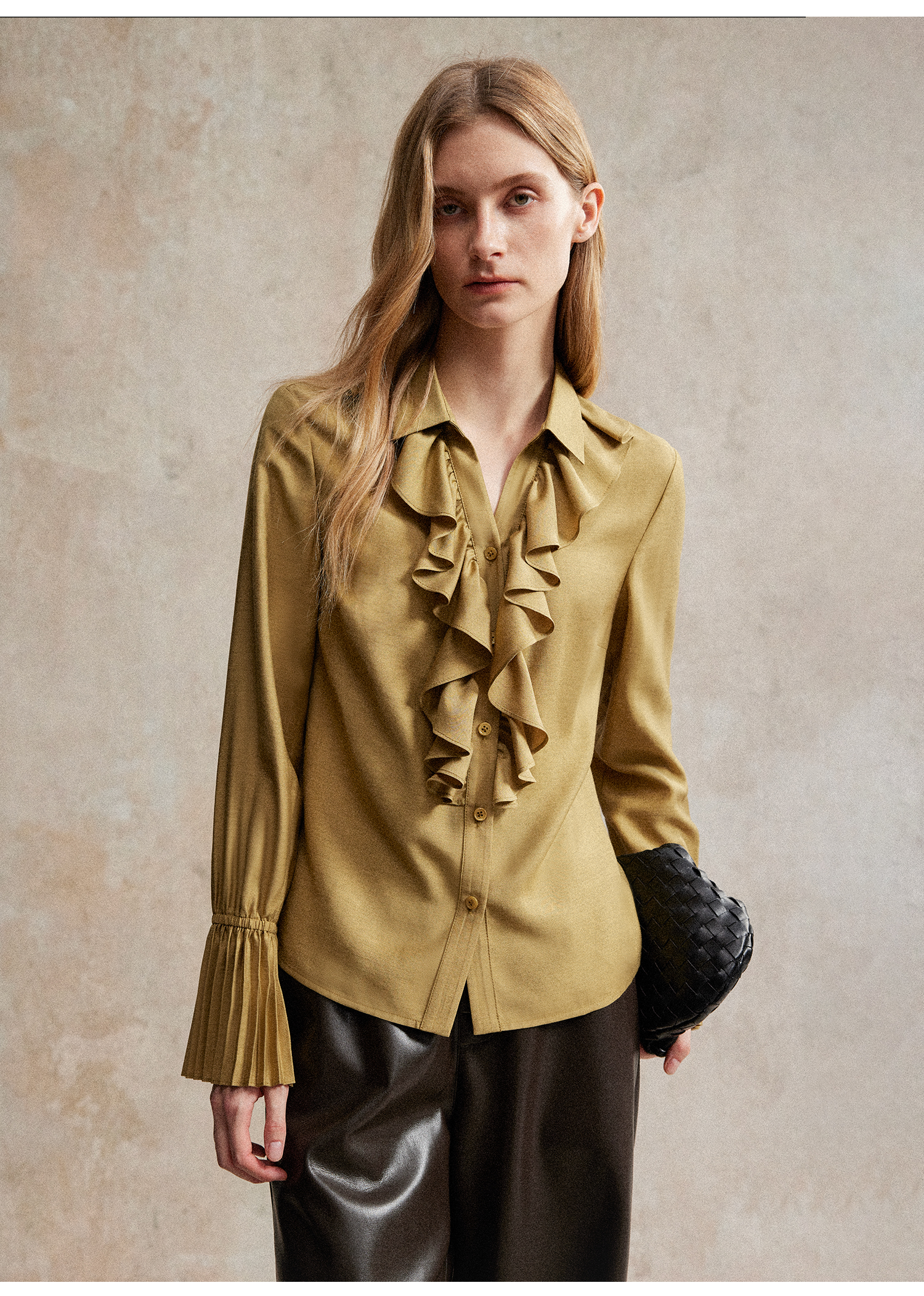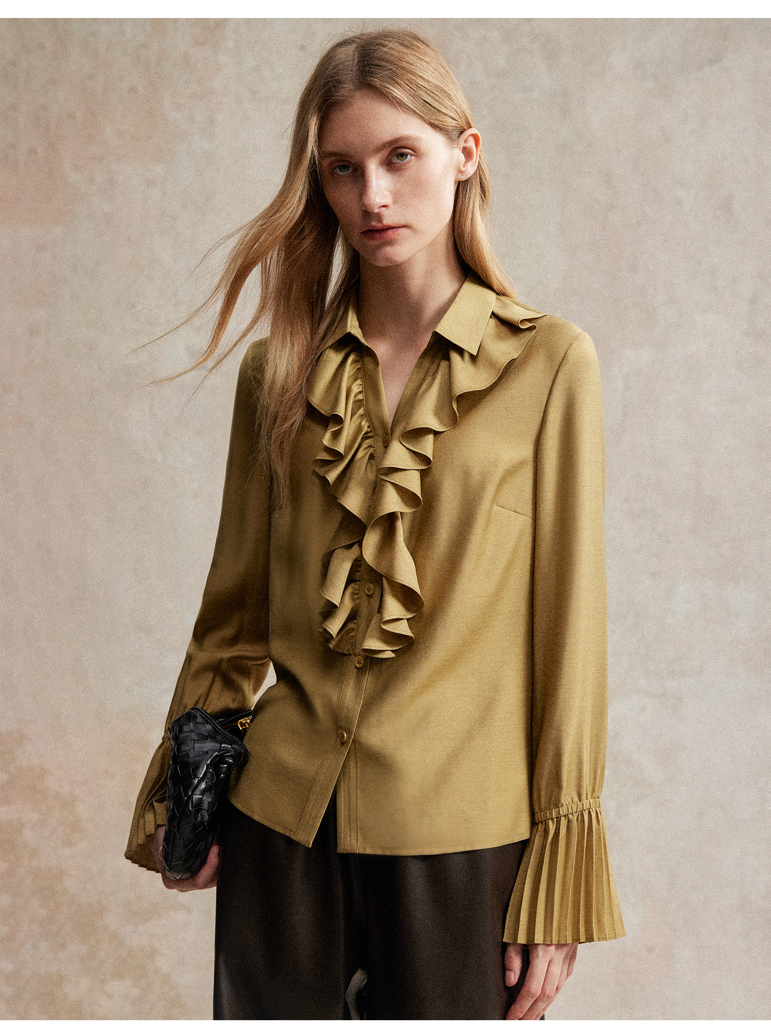 人丝羊毛法式浪漫木耳边重工压褶喇叭袖收腰复古衬衫
