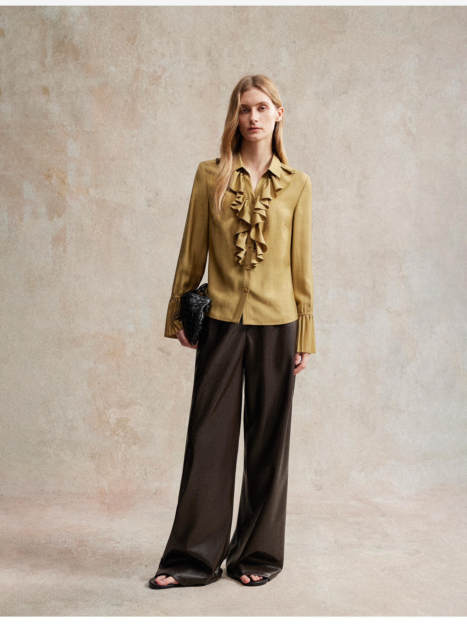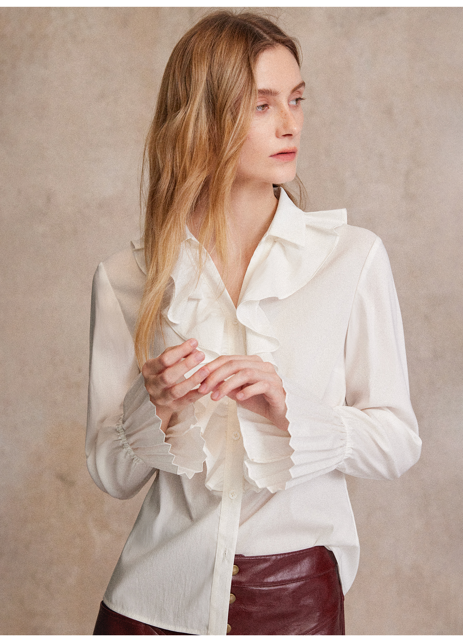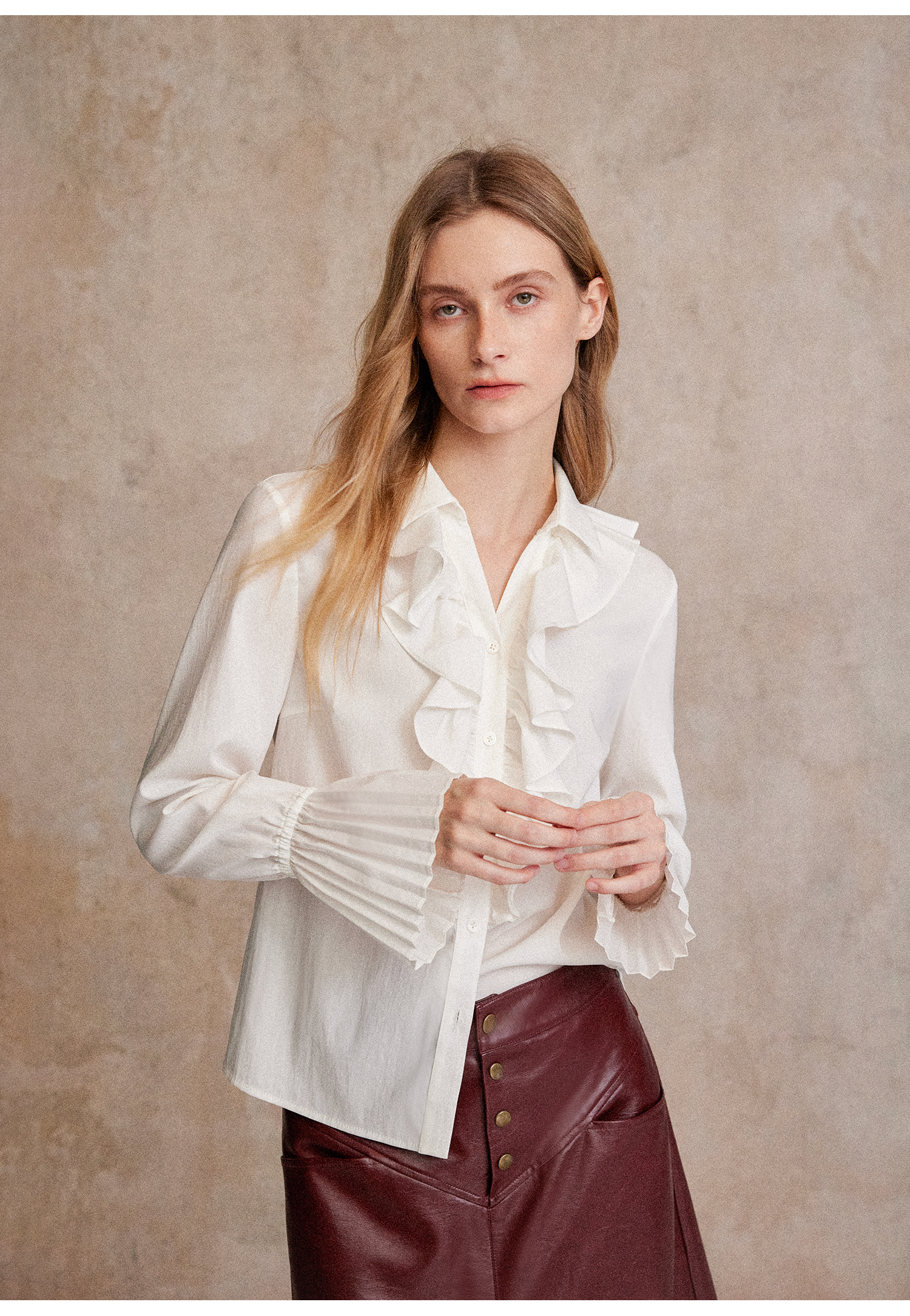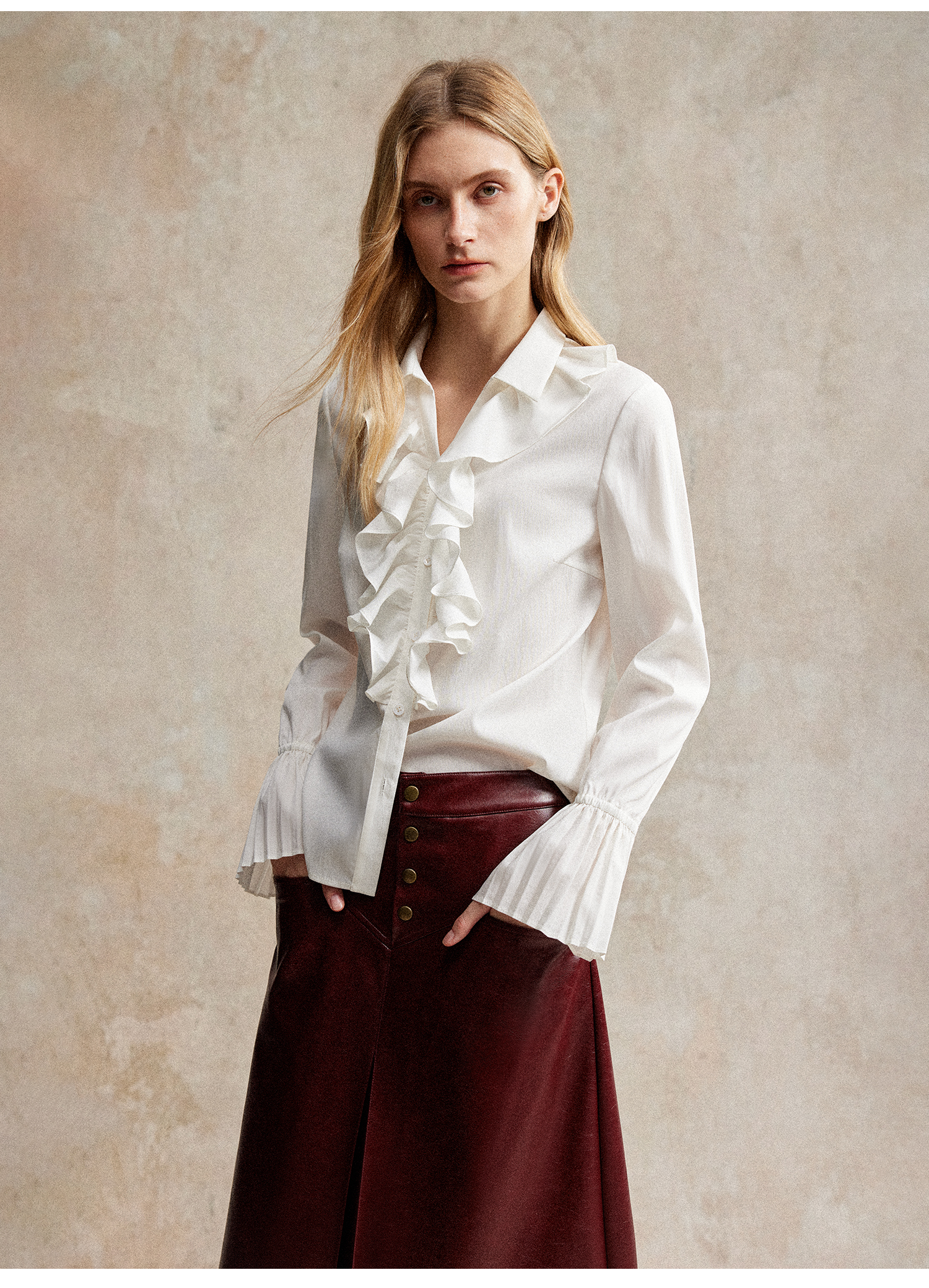 人丝羊毛法式浪漫木耳边重工压褶喇叭袖收腰复古衬衫