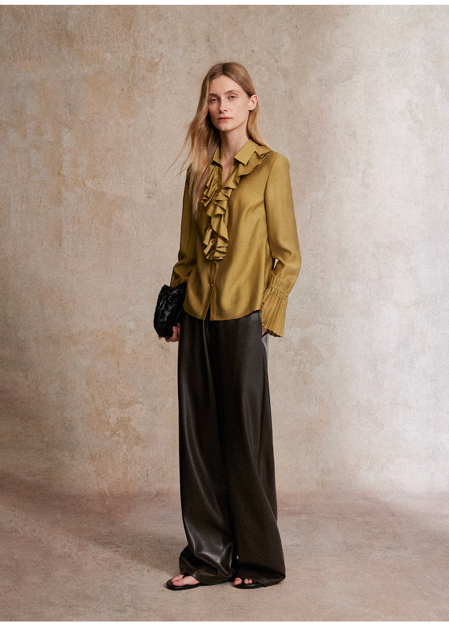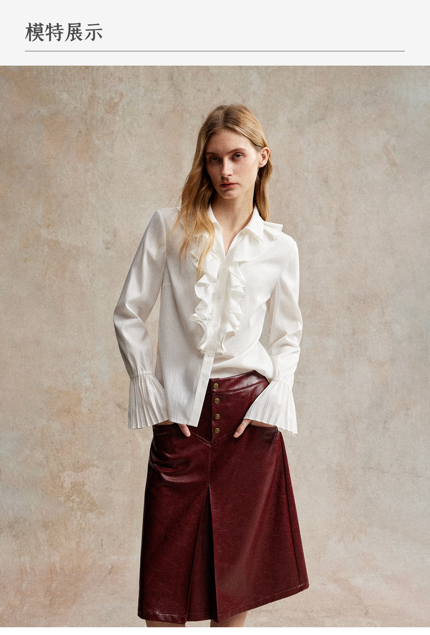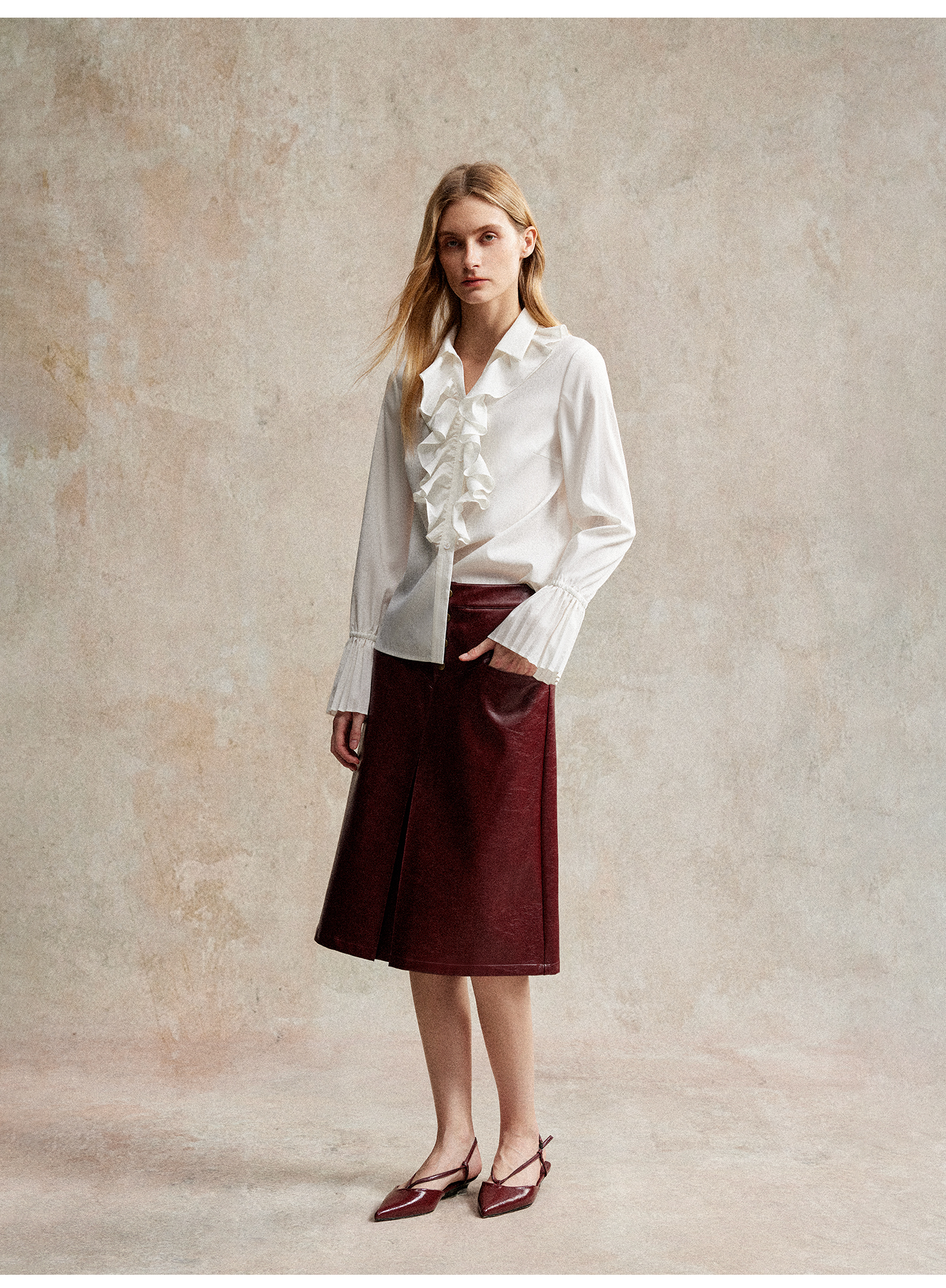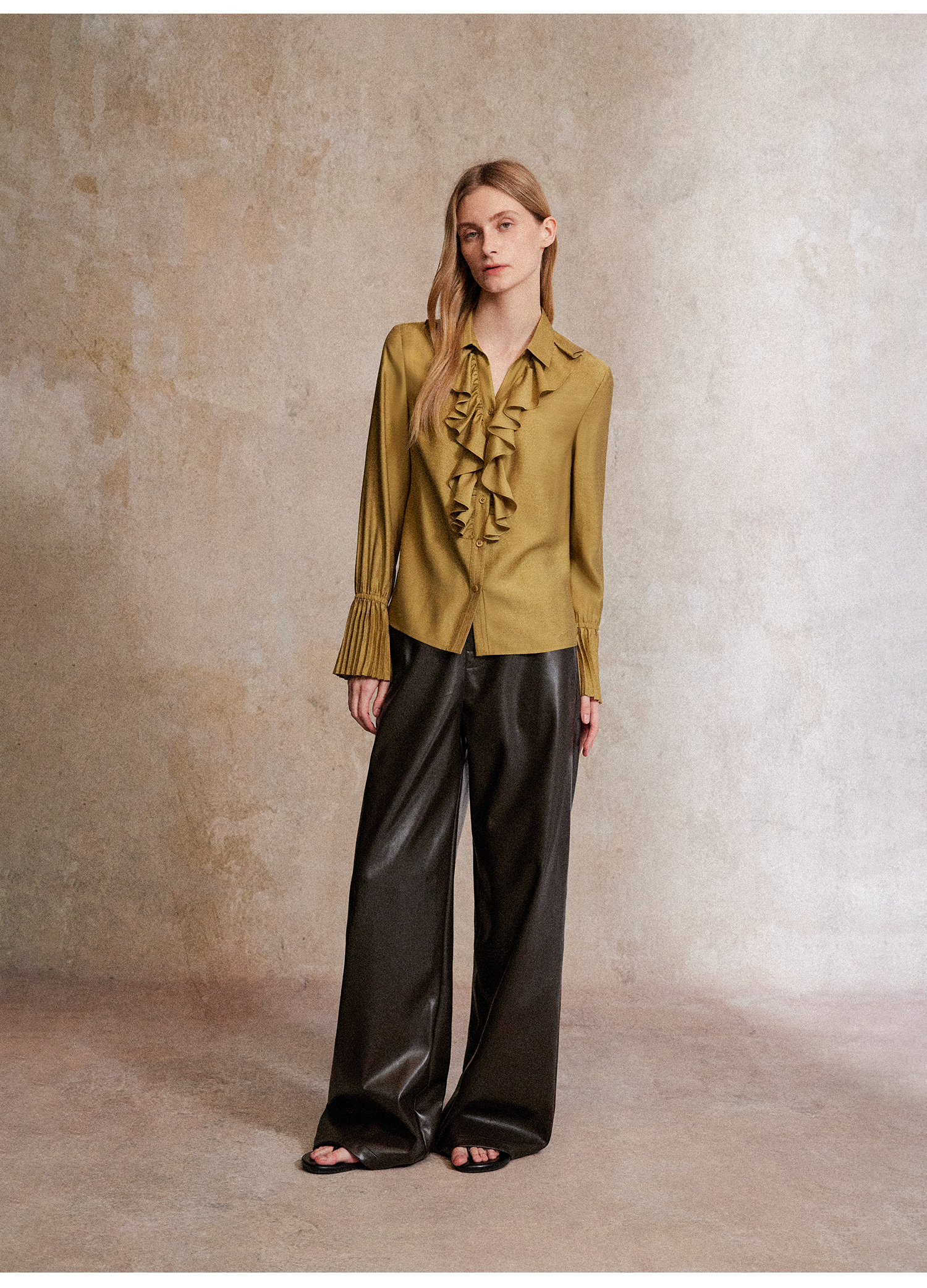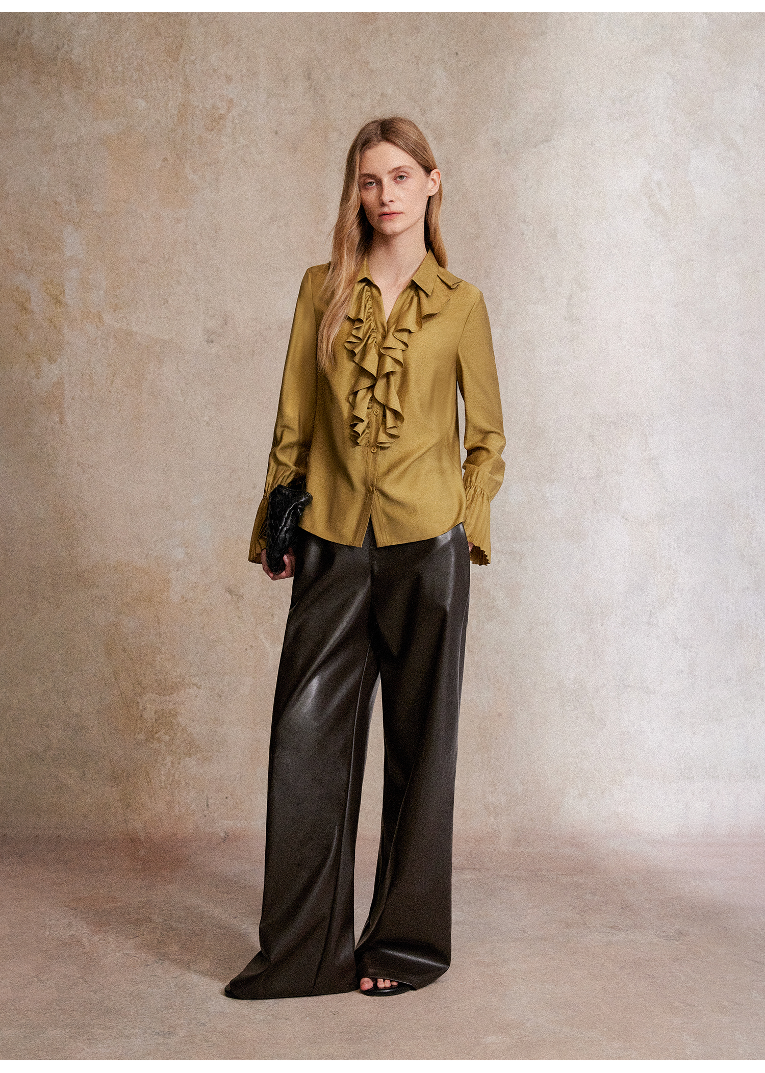 人丝羊毛法式浪漫木耳边重工压褶喇叭袖收腰复古衬衫