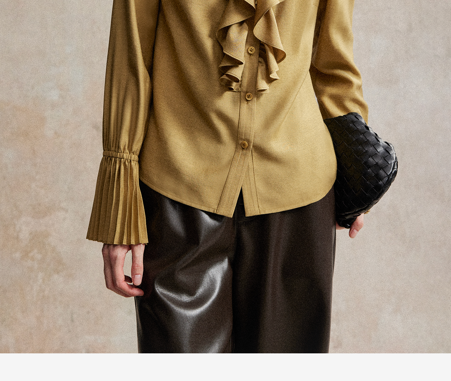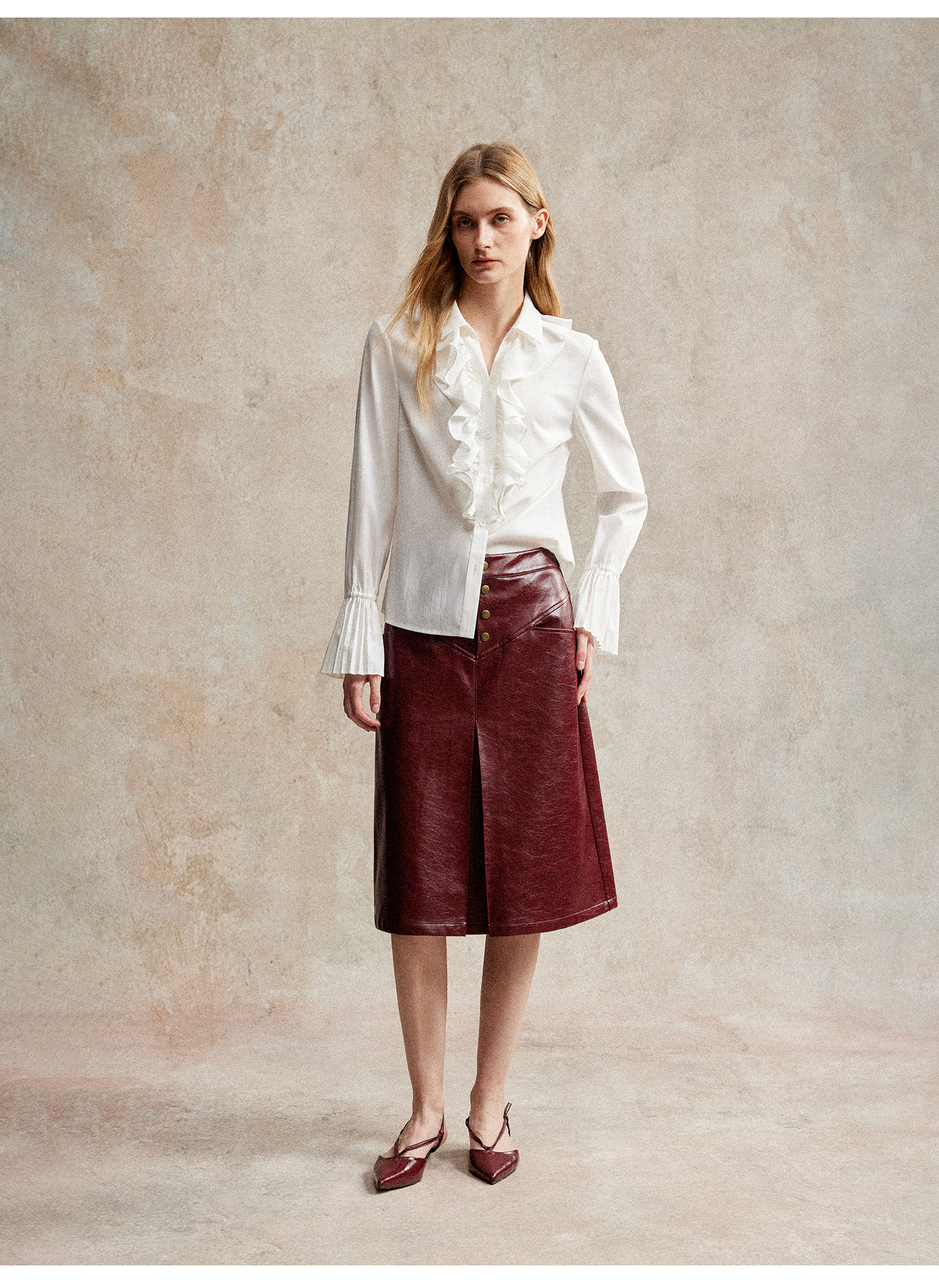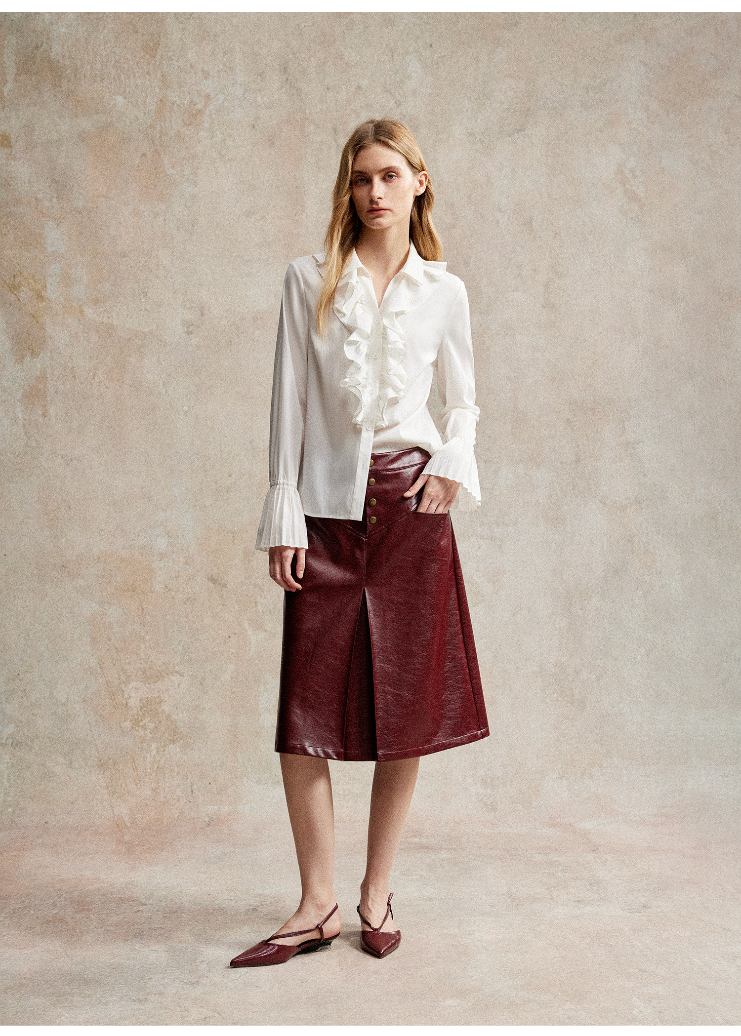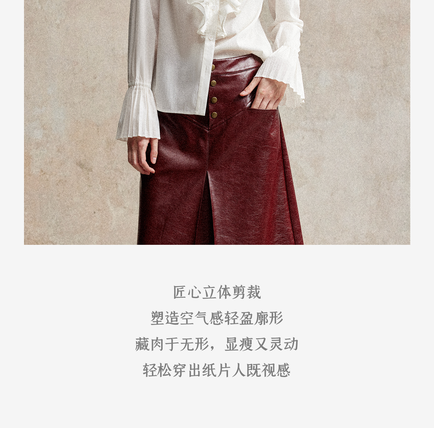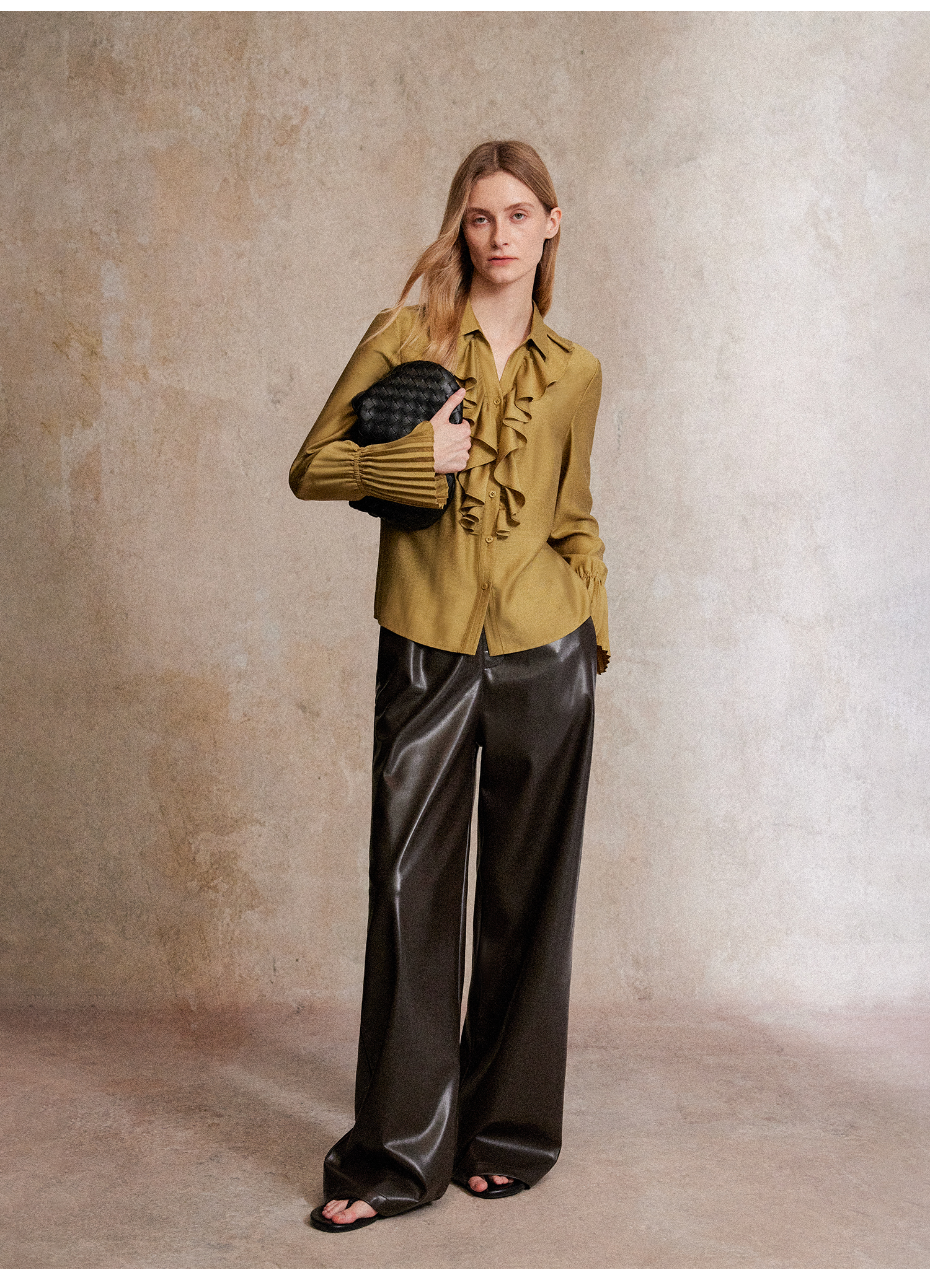 人丝羊毛法式浪漫木耳边重工压褶喇叭袖收腰复古衬衫