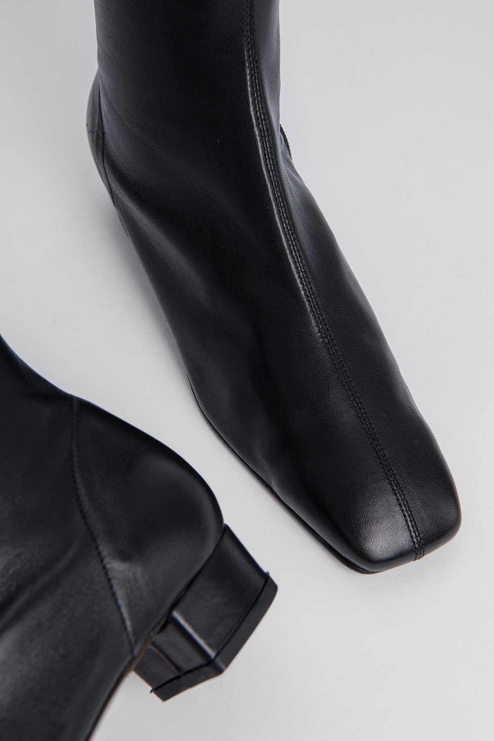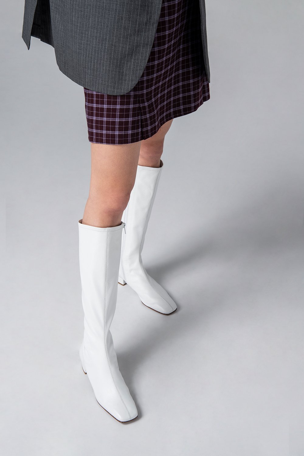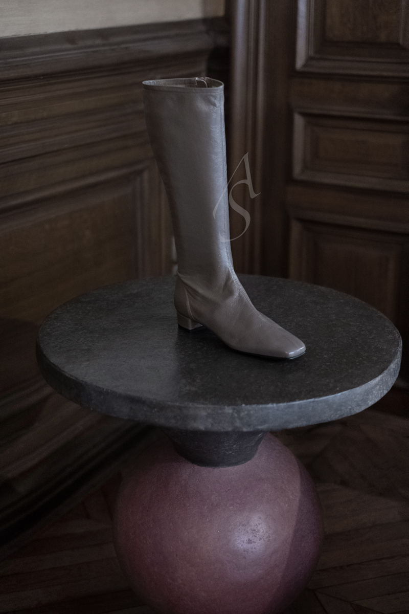 选用细密柔软的牛皮制作,方形鞋头与中线相衬,更具洗练的现代感,同时巧妙地修饰踝部与腿部的线条。现有卡其色、白色,裸色和黑色可选。