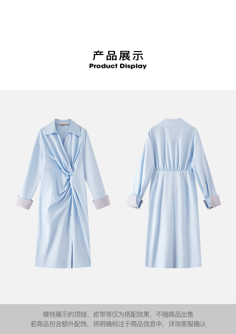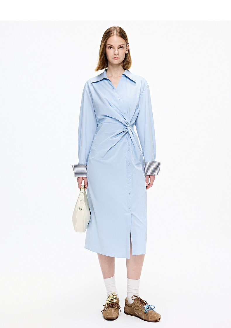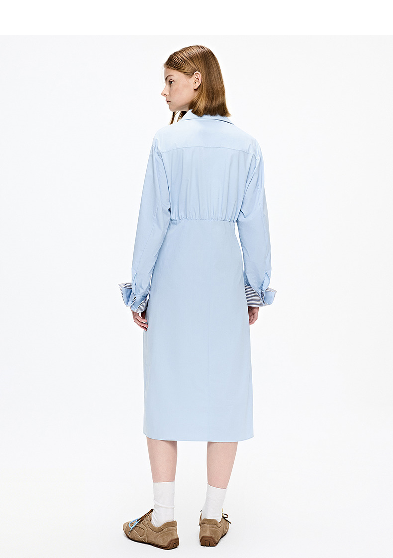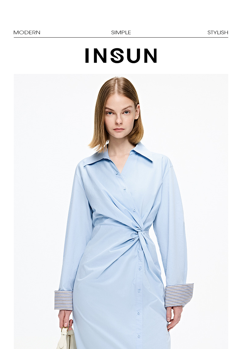 INSUN恩裳衬衫领褶皱收腰高支棉长袖连衣裙