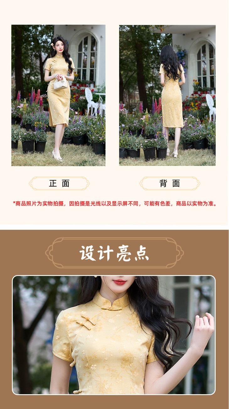 新中式黄色中长款小个子气质丝麻旗袍JLM6166 商品图3