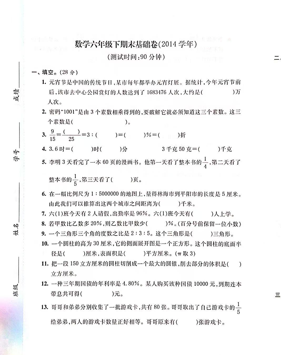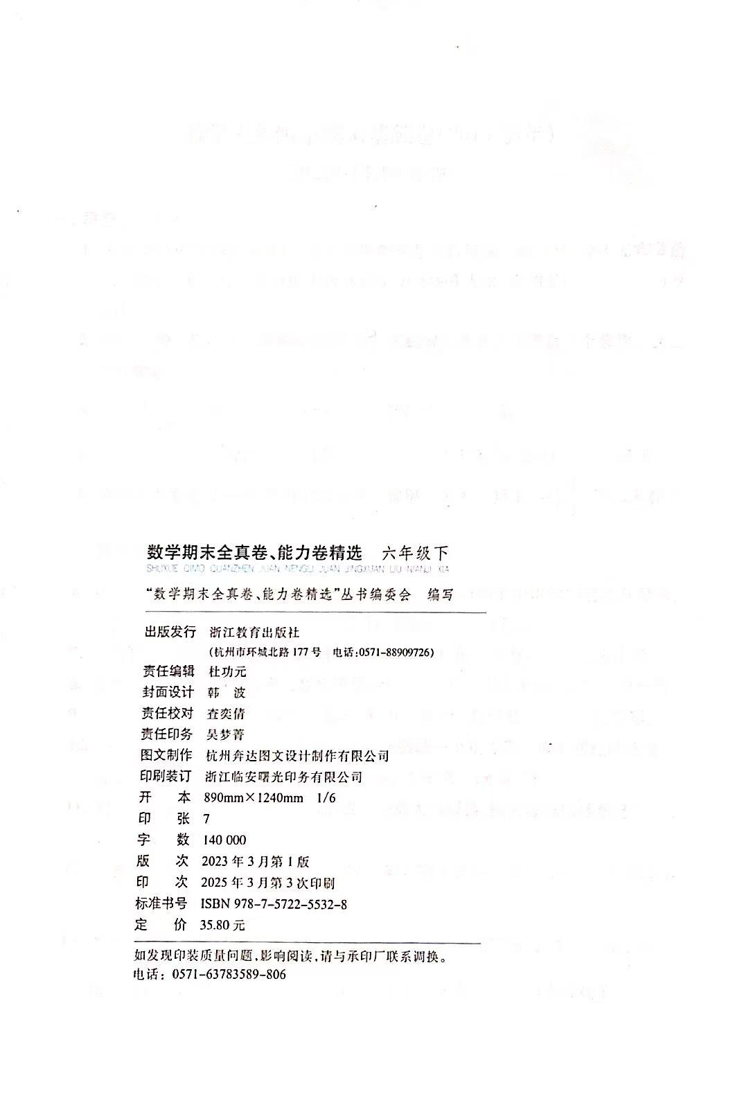 2025小学数学期末全真卷、能力卷精选六年级下册(浙教版)张天孝主编