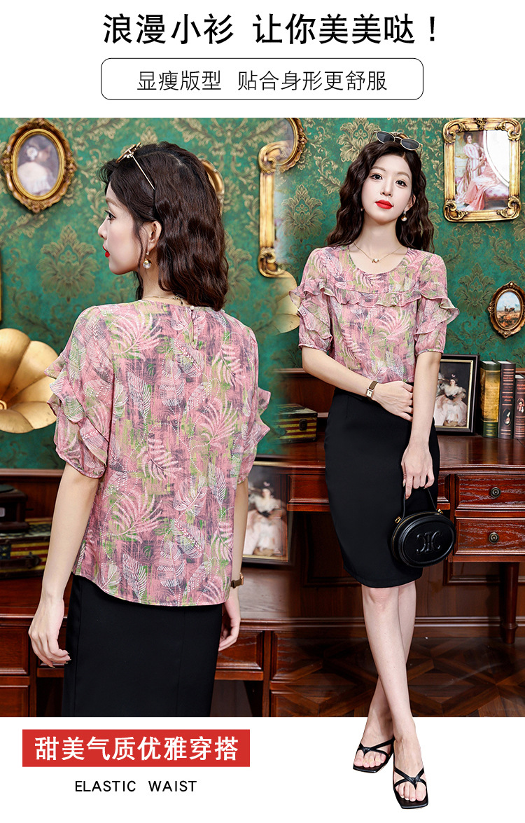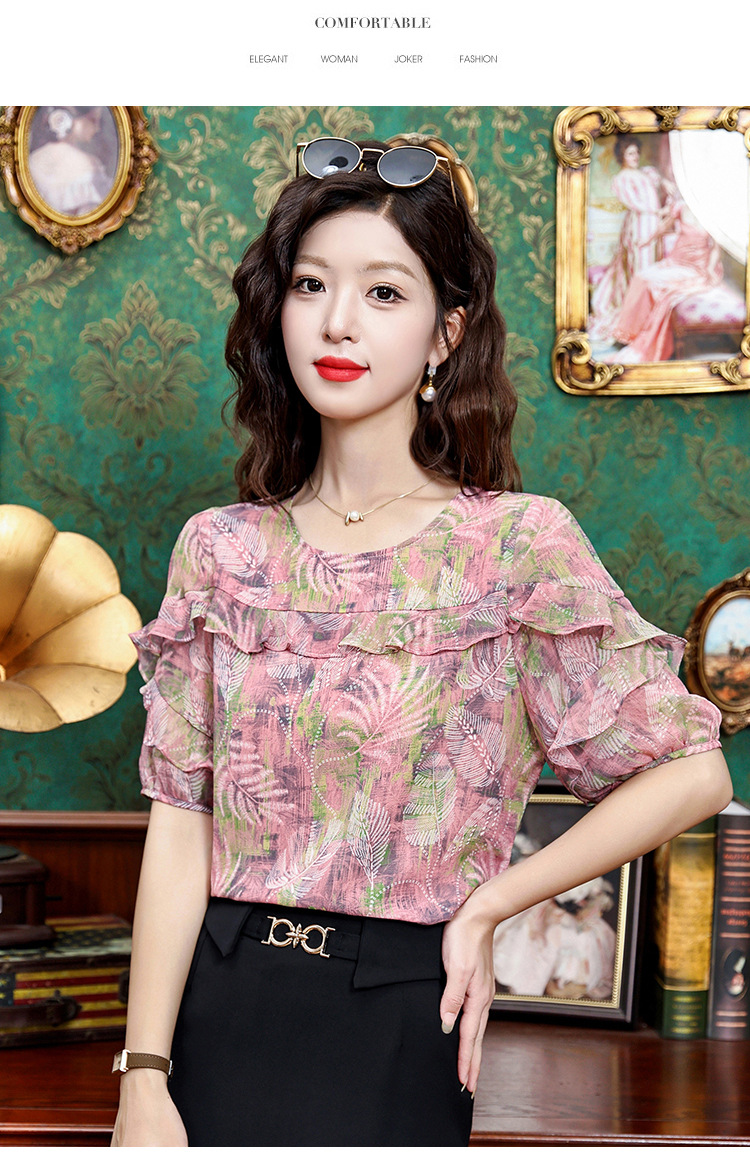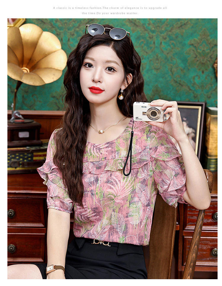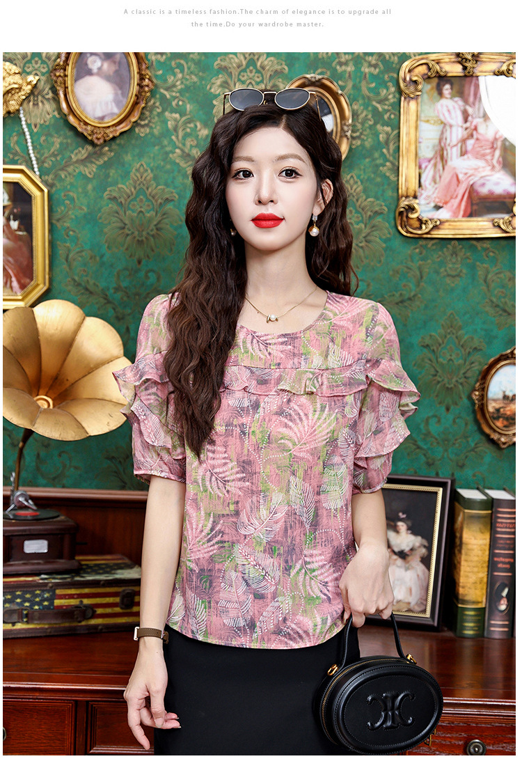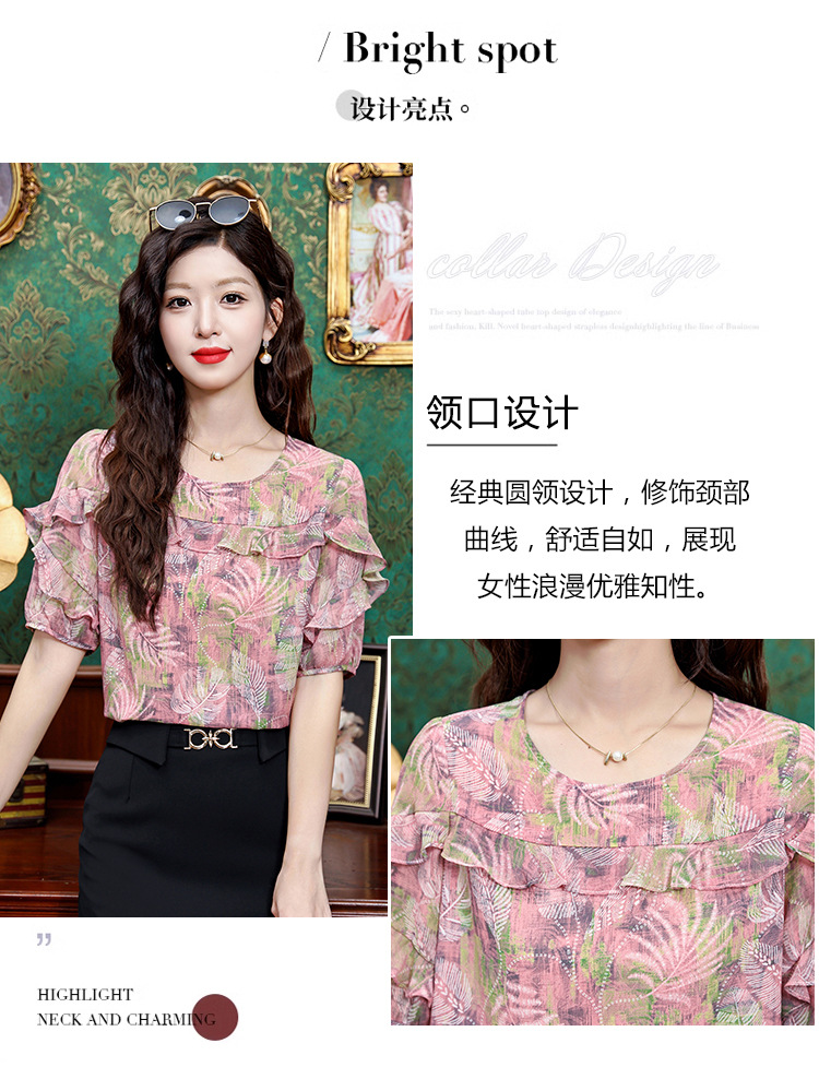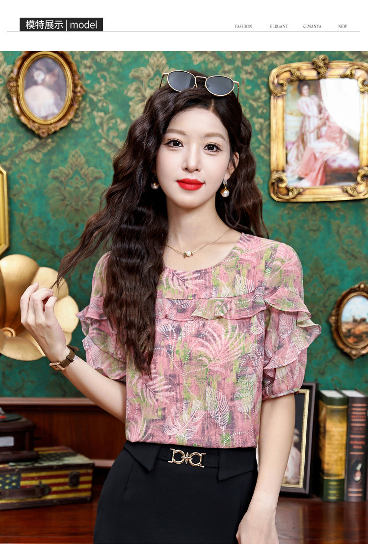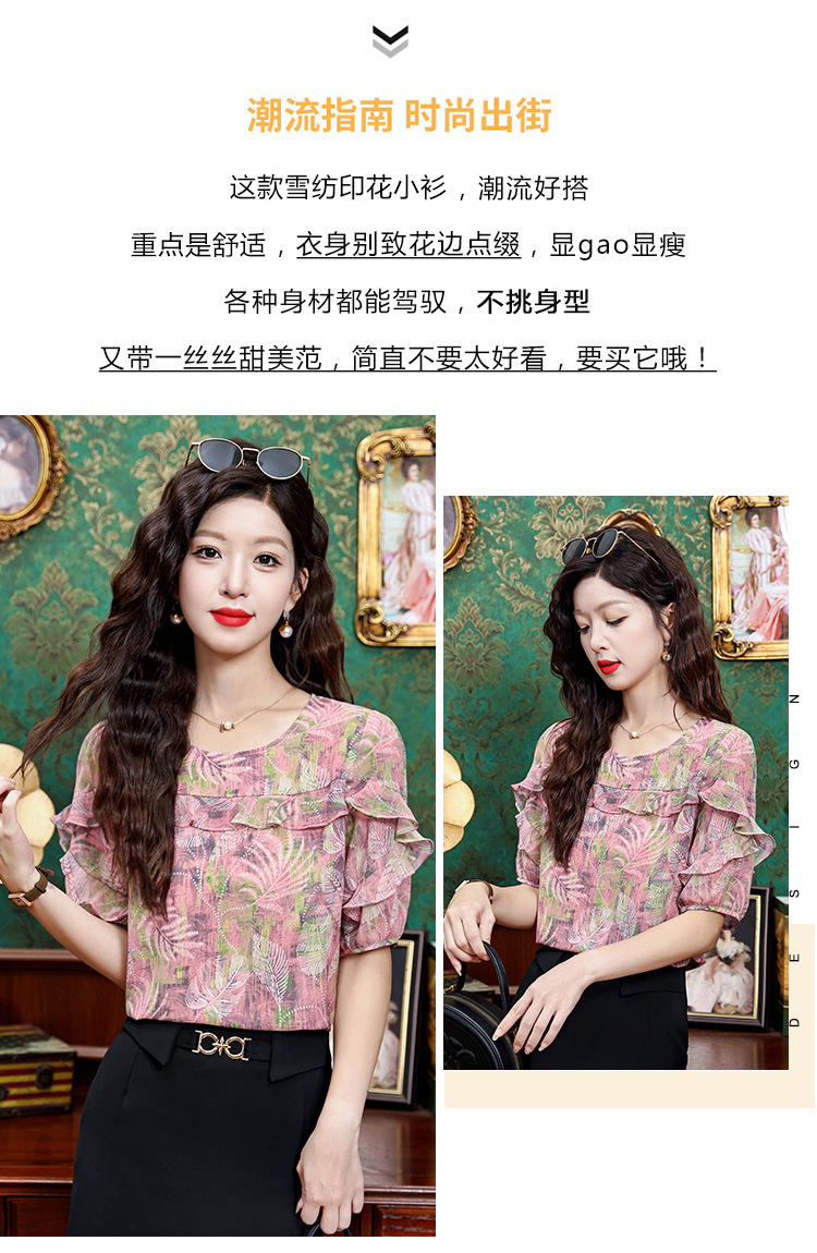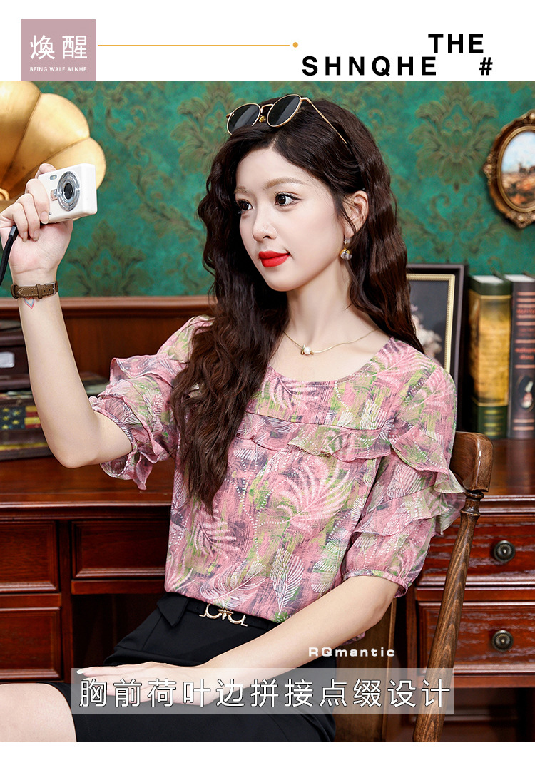 KQL323H11812025夏季新款圆领荷叶边印花雪纺衫上衣洋气时尚百搭衬衫女