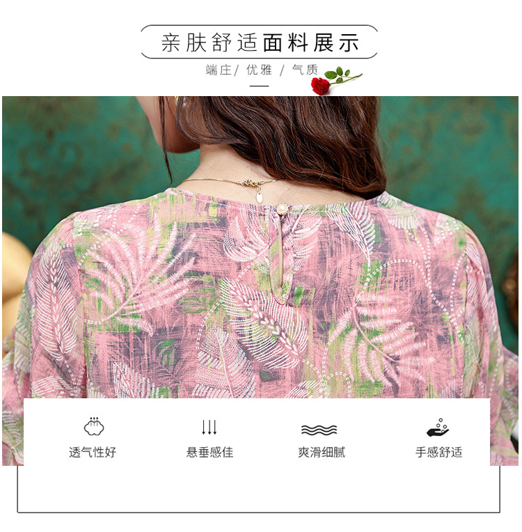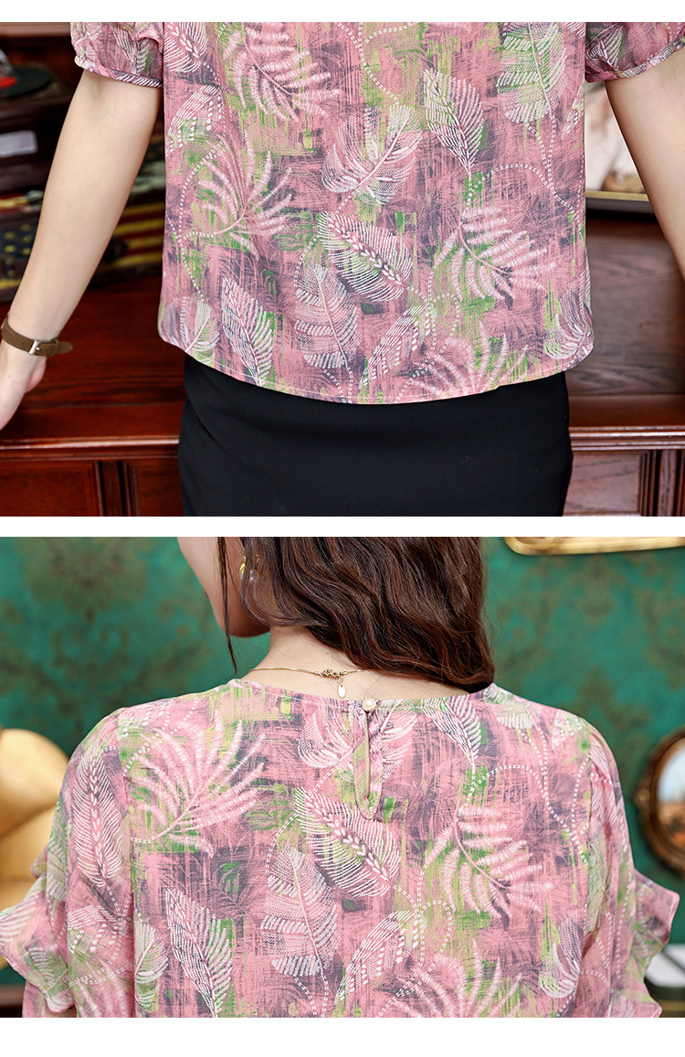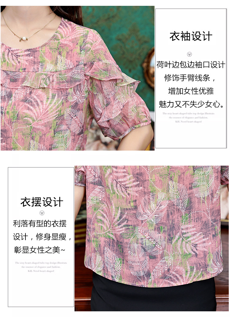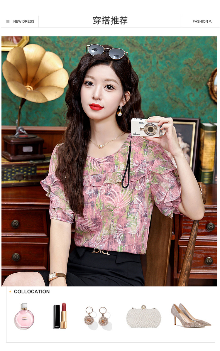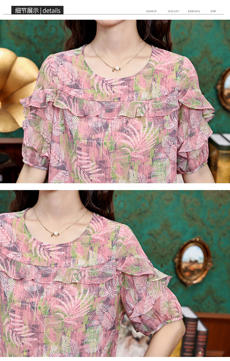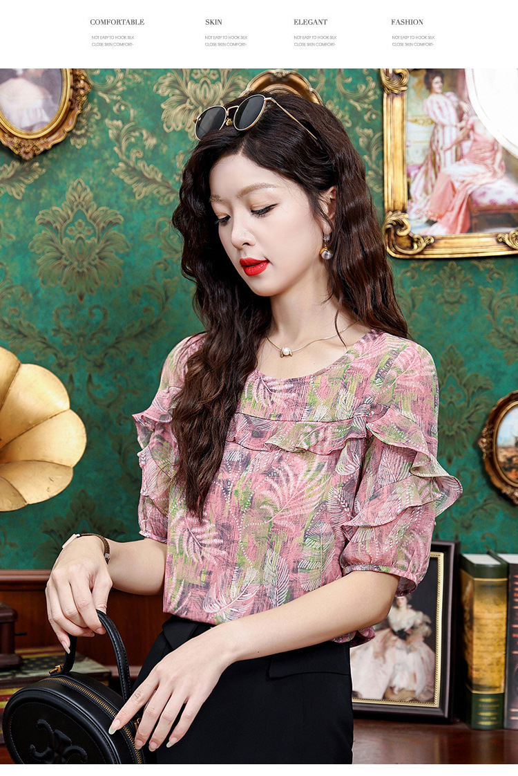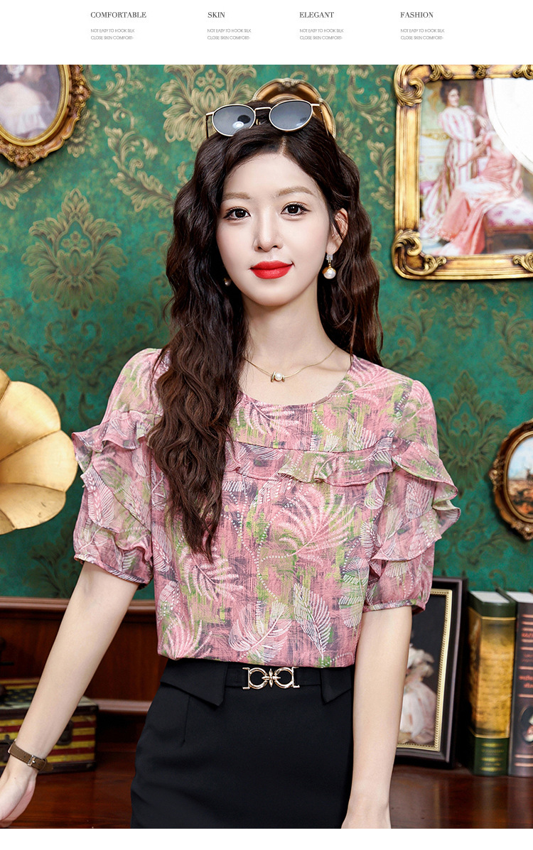 KQL323H11812025夏季新款圆领荷叶边印花雪纺衫上衣洋气时尚百搭衬衫女