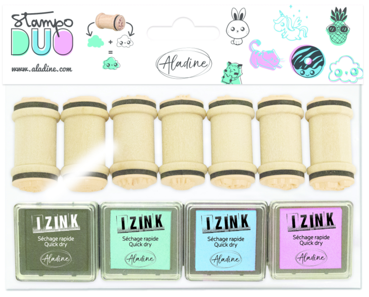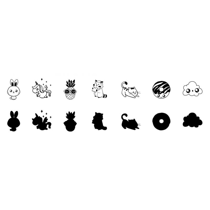 可爱系主题配有4个印台,7个印章,每个印章有2面。1面背景图,1面细节图案。重叠使用