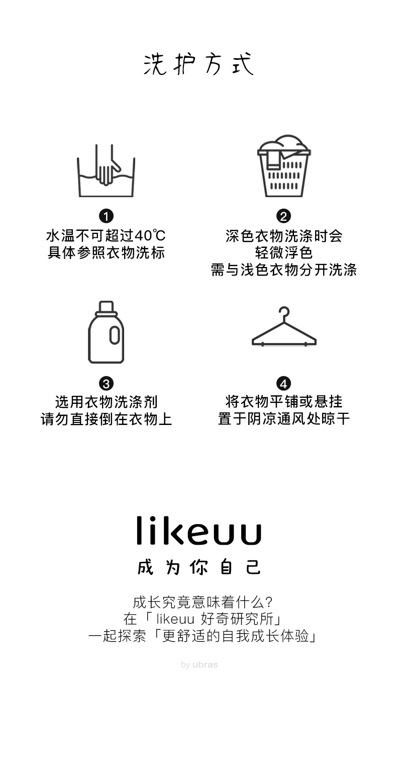- likeuu是专注于为6~15岁的青少年创造柔软、无束缚的成长体验,以好奇心为灵感的成长发育期贴身衣物品牌。likeuu的产品覆盖内衣、内裤、保暖衣、家居服、运动等品类。