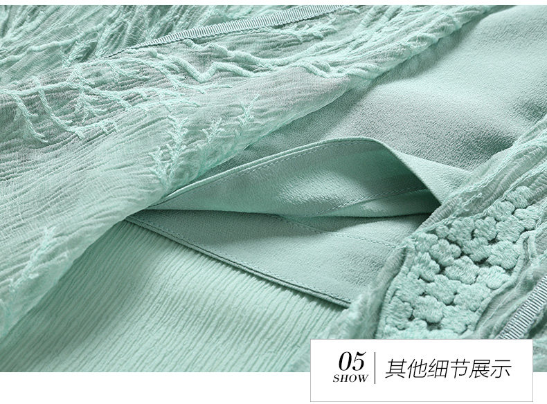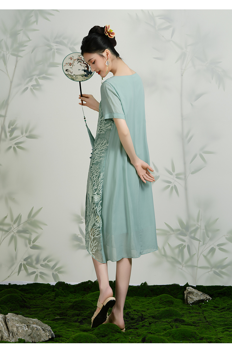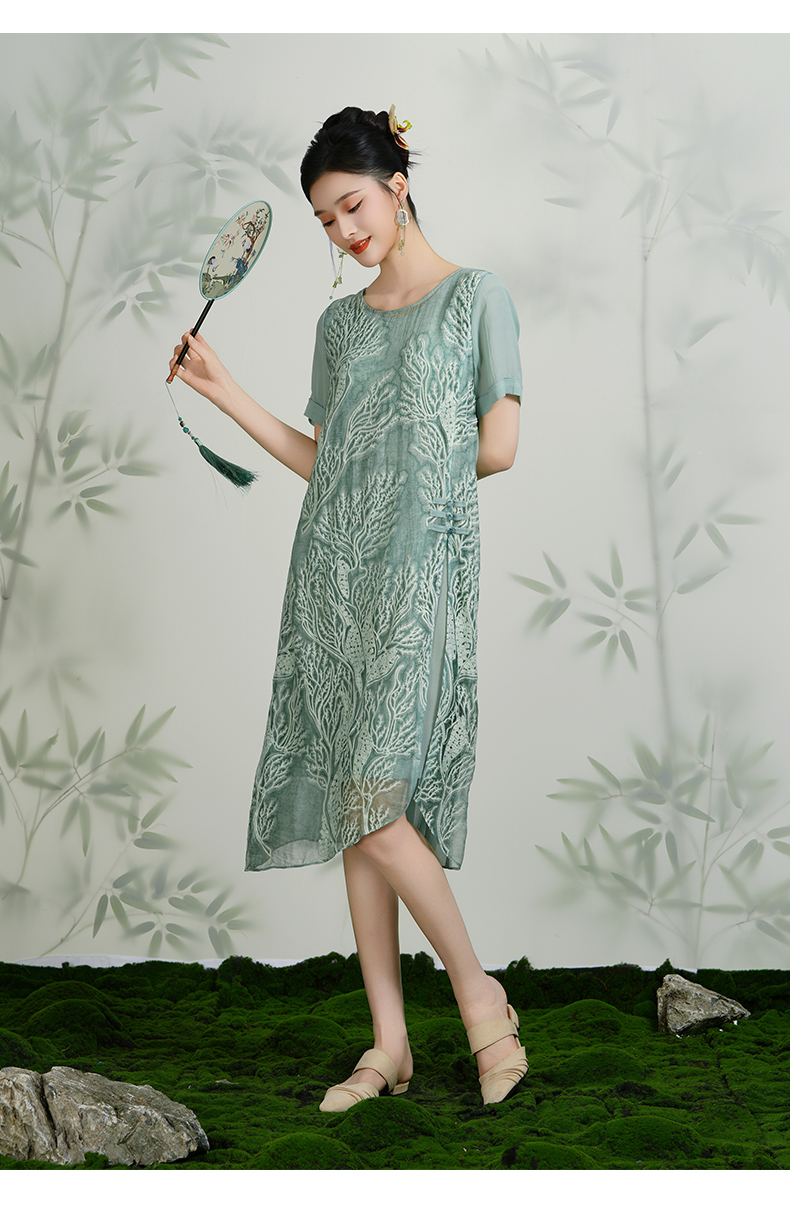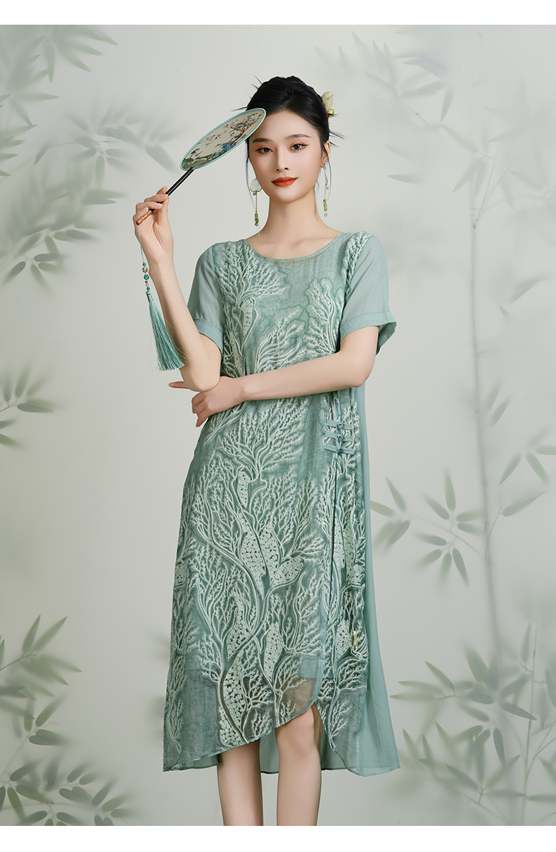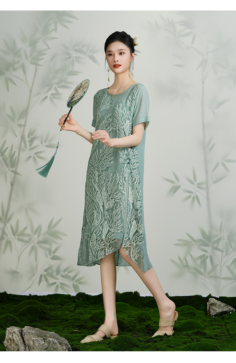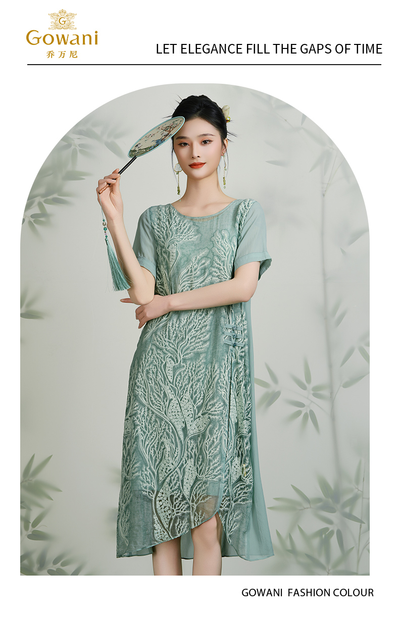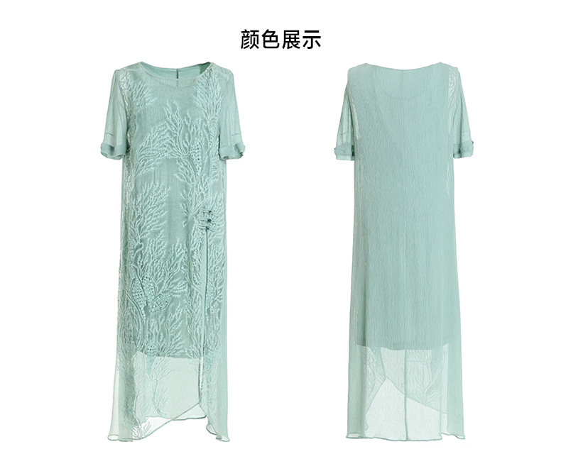 乔万尼真丝桑蚕丝连衣裙女夏装宽松气质开叉绣花真丝裙子EN2E628
