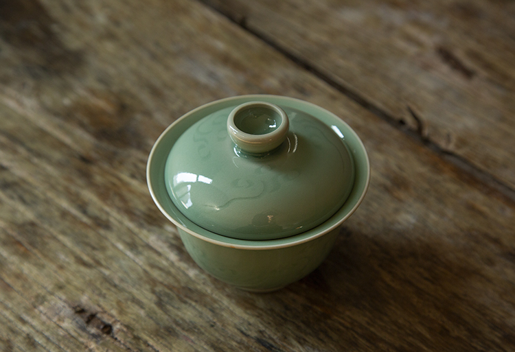 温厚的釉水堆积使梅子青云纹盖碗更显曼妙灵动,