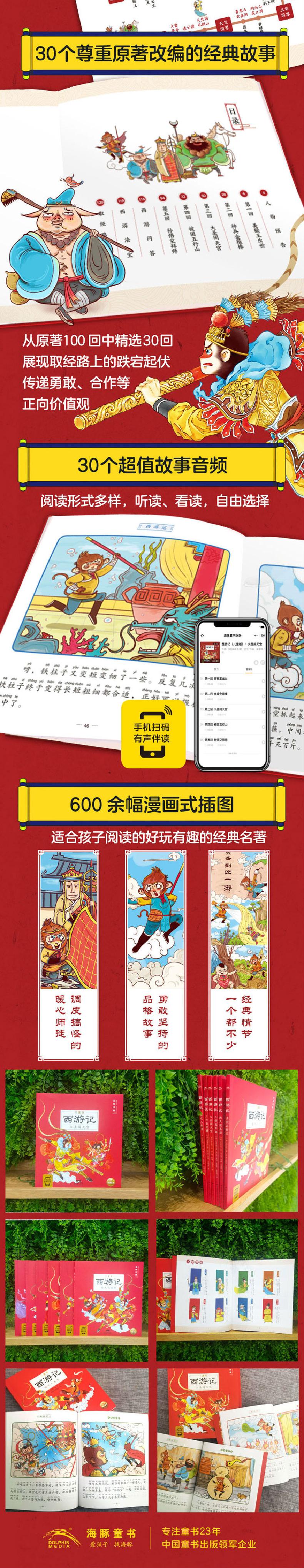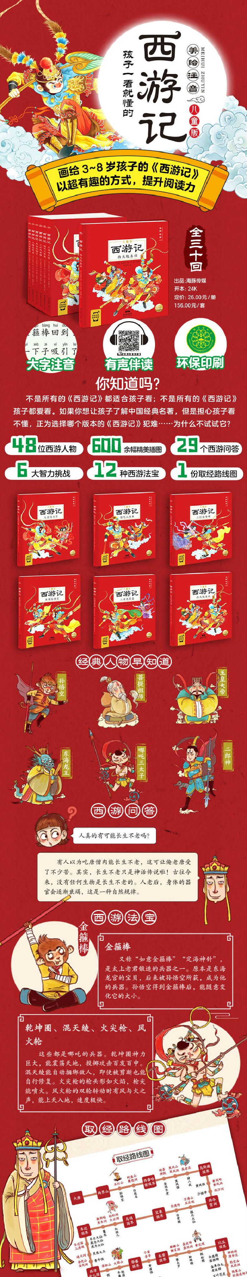 《西游记》(儿童版)作为专门为3-8岁孩子量身打造的注音版名著启蒙读物,旨在为孩子打开国学学习之门,让孩子摆脱对文学巨著的畏难情绪,轻轻松松爱上名著。全书从原著100回中选取家喻户晓的30回情节,根据3-8岁儿童的阅读水平和思维特点进行合理改编,去除血腥、暴力情节,专注传递正向精神,帮助孩子轻松养成勇敢、协作、坚持等优秀品质;600多张漫画式插图,浓郁的中国韵味加上夸张的表情、搞笑的动作,生动再现跌宕起伏、扣人心弦的情节,给孩子留下名著并不枯燥、晦涩的良好印象;每册文前人物预告、文后“西游问答”“西游法宝”“取经路线图”版块,帮助孩子厘清故事脉络,积累西游知识点;随书附赠30个故事的音频,搞怪的角色配音,带你认识不一样的唐僧师徒。孩子模仿语调,不知不觉提升语言表达能力,故事听着听着就会讲啦!