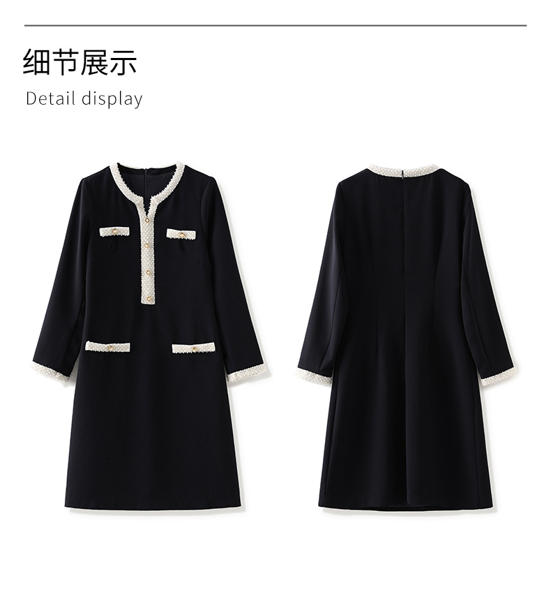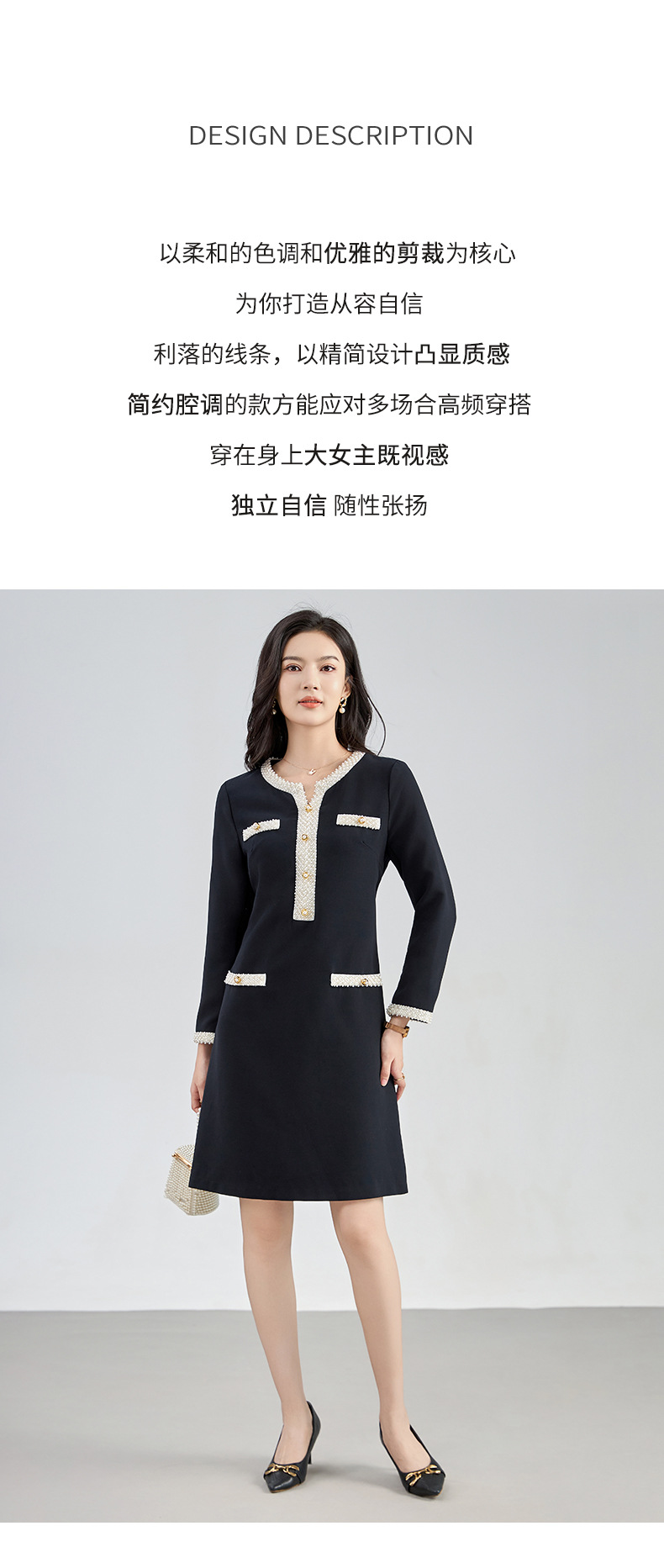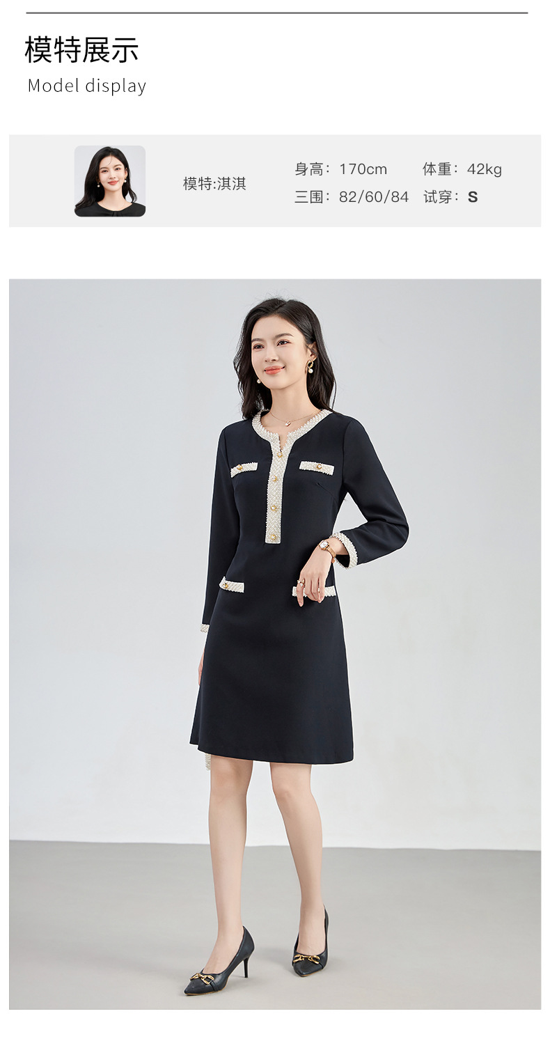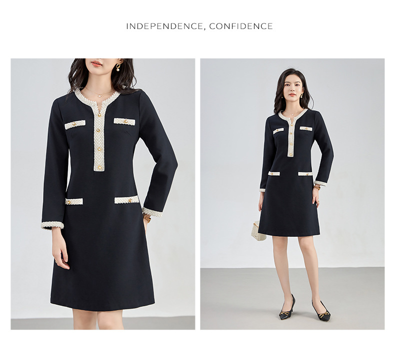 【高货wl】全新升级【铂金会员321/天猫429/差价108】(05156) 洛诗琳气质小香长袖连衣裙新款气质钉珠撞色V领显瘦A字裙