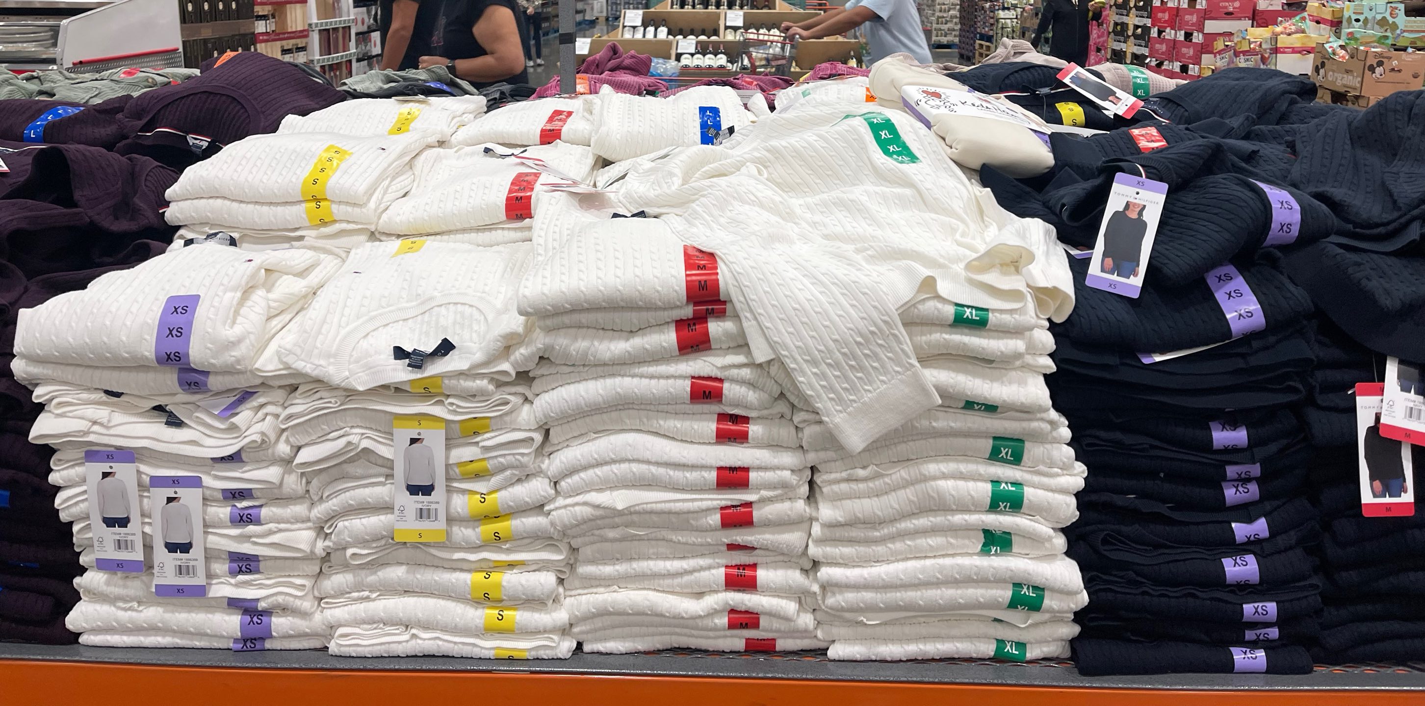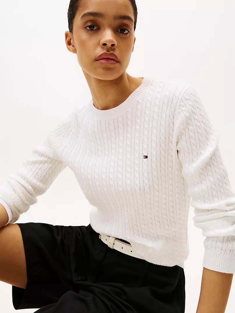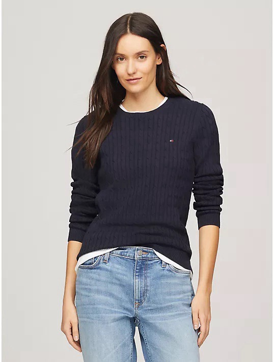 Tommy女士100%纯棉麻花毛线衣,圆领款超美,手感舒服,二个颜色都好看,藏青色显瘦百搭,白色靓丽大方!这种麻花毛衣我有好几个颜色怎么穿都可以。胸口处有tommy经典标志 ,这件单穿也贴身舒服,柔软亲肤,搭配衬衣更是很棒,请正常选择尺码,这件不用穿太贴身,很适合各种裤子呀A字裙也很好