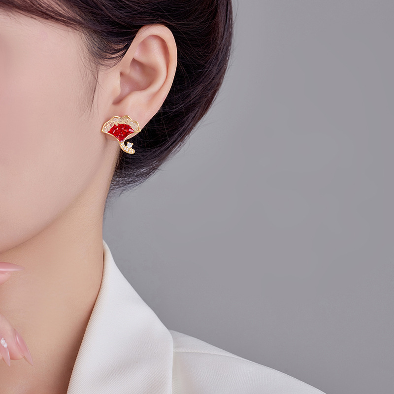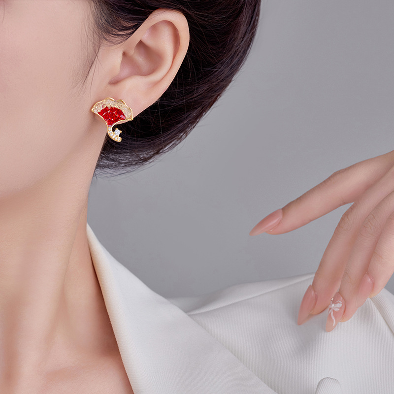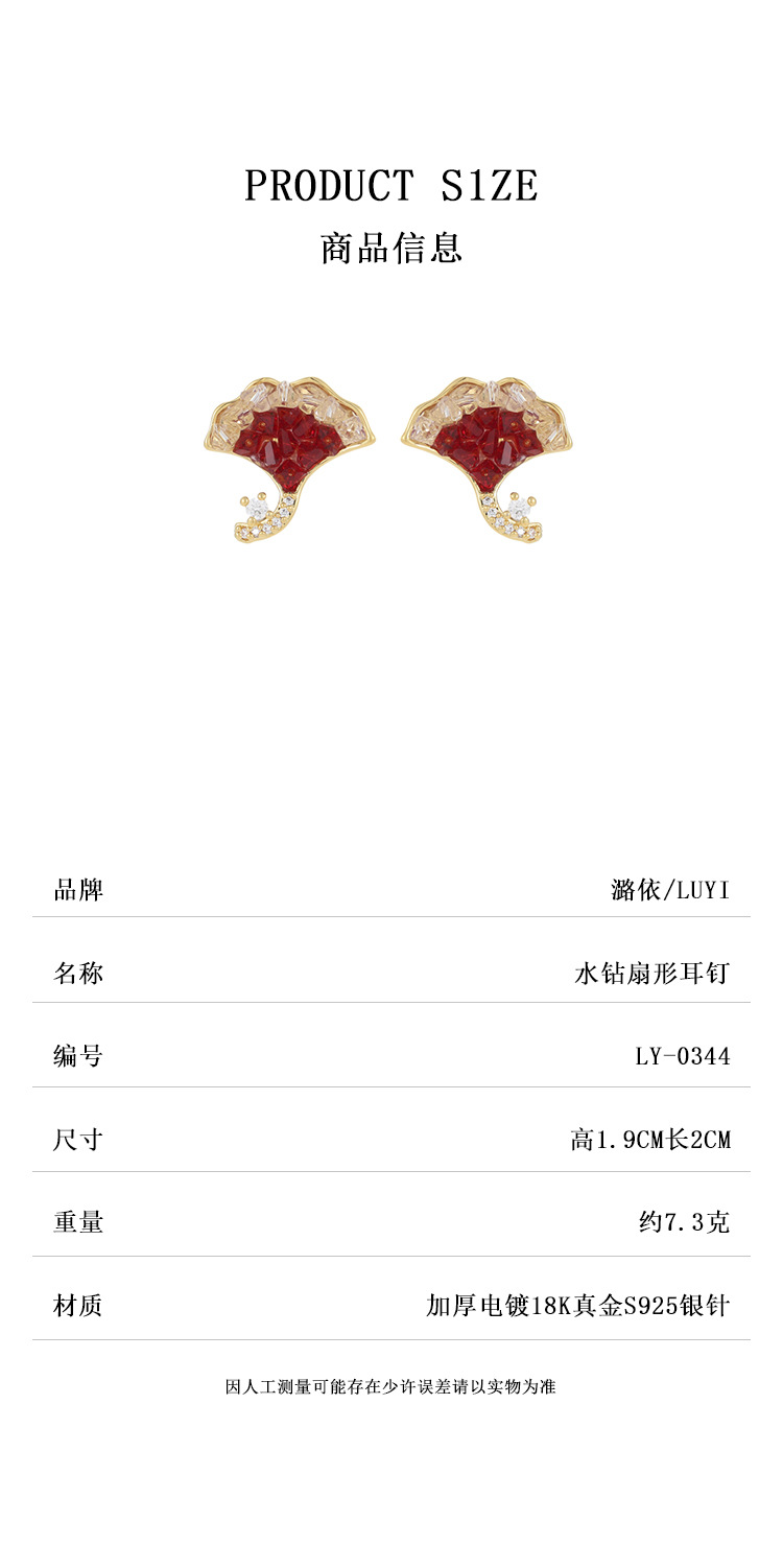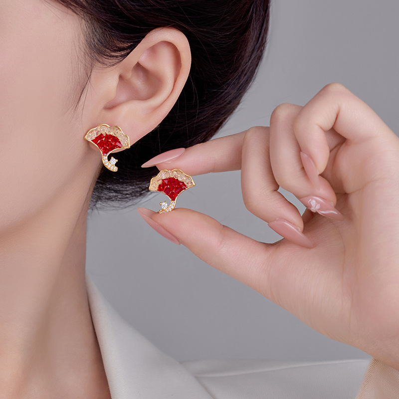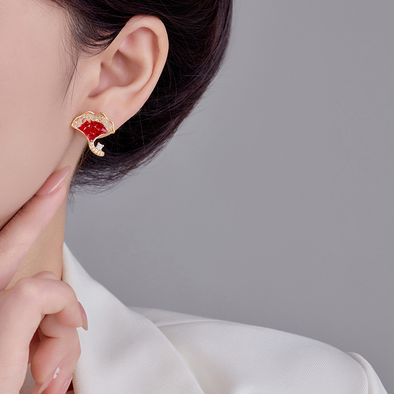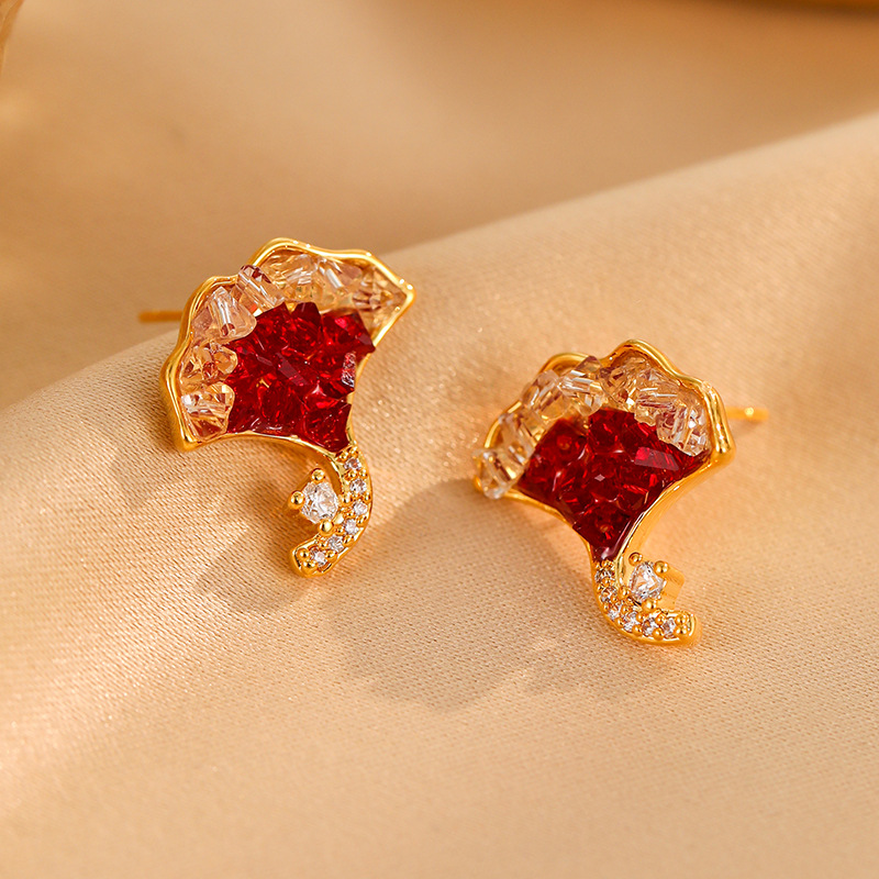 雀说新款轻奢精致银杏叶水晶耳钉秋冬百搭红色显白时尚高级感耳环耳饰AL0344