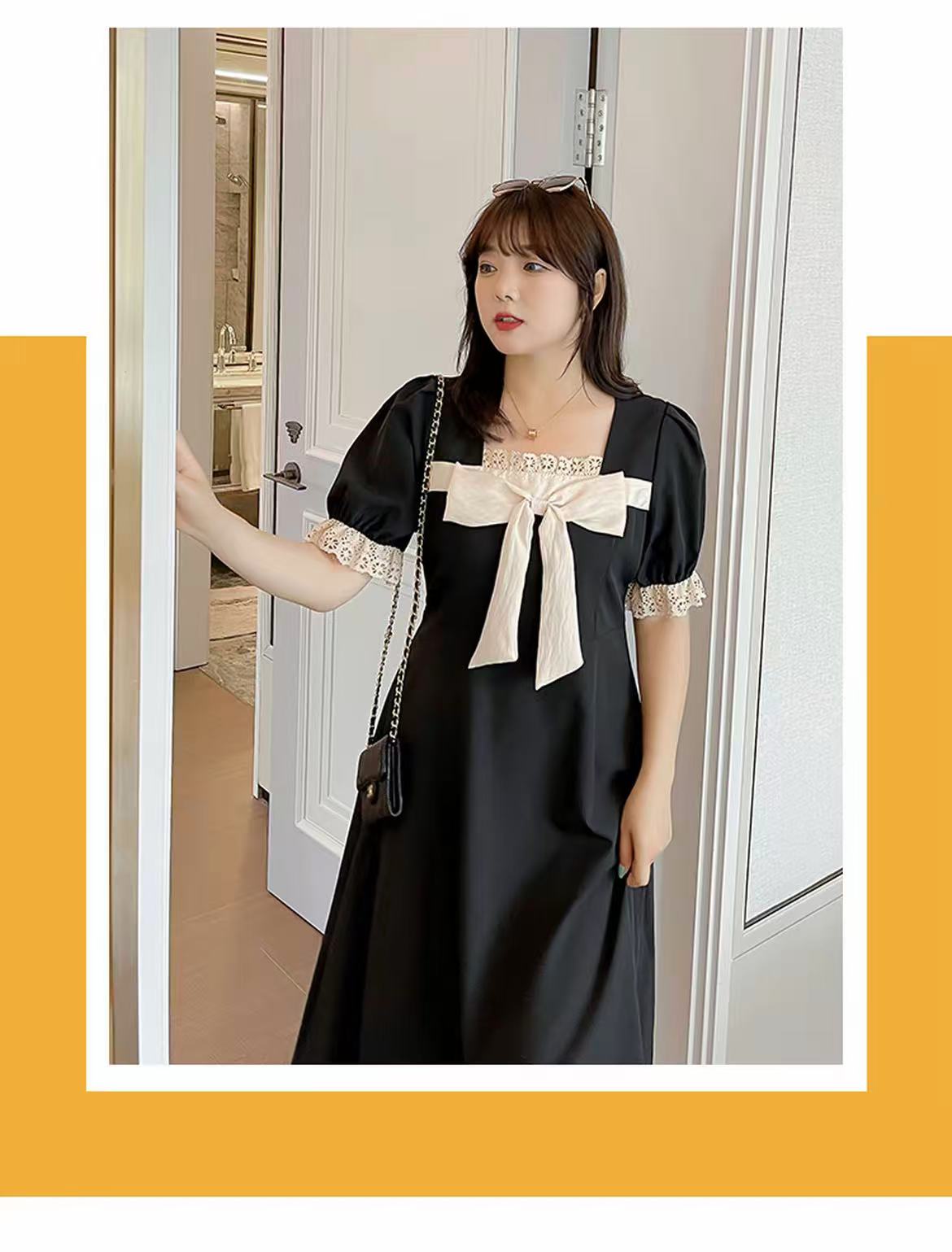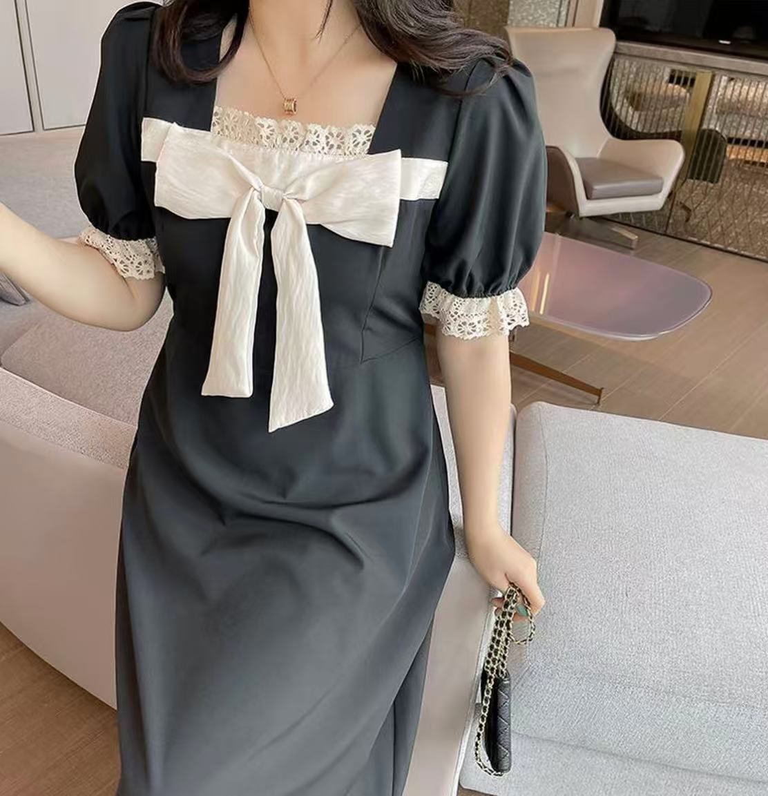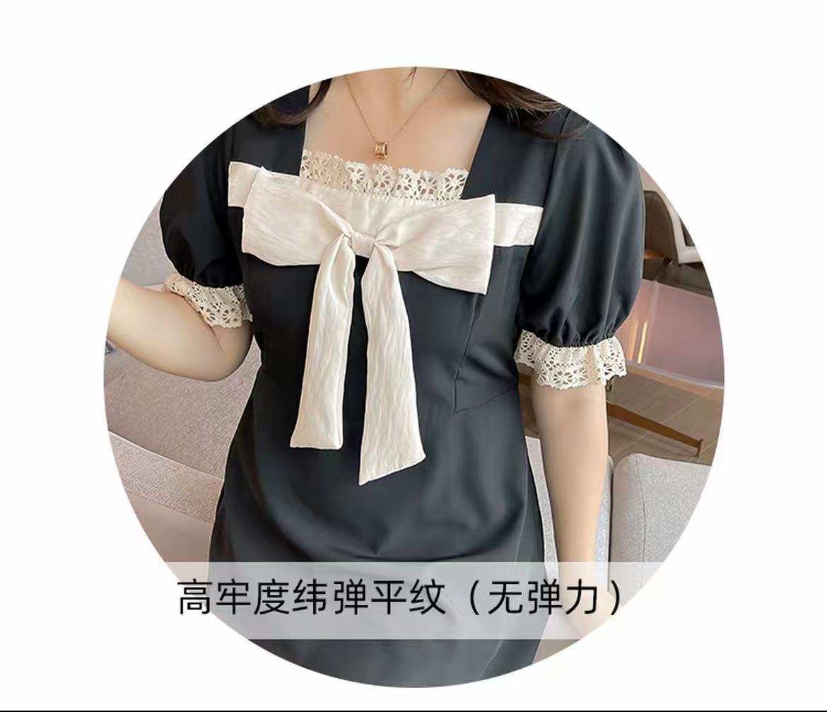 【诗铭洛可】XCX203连衣裙方领拼蕾丝蝴蝶结短袖裙B21-1