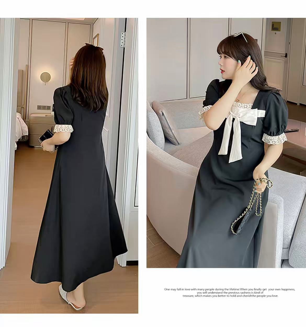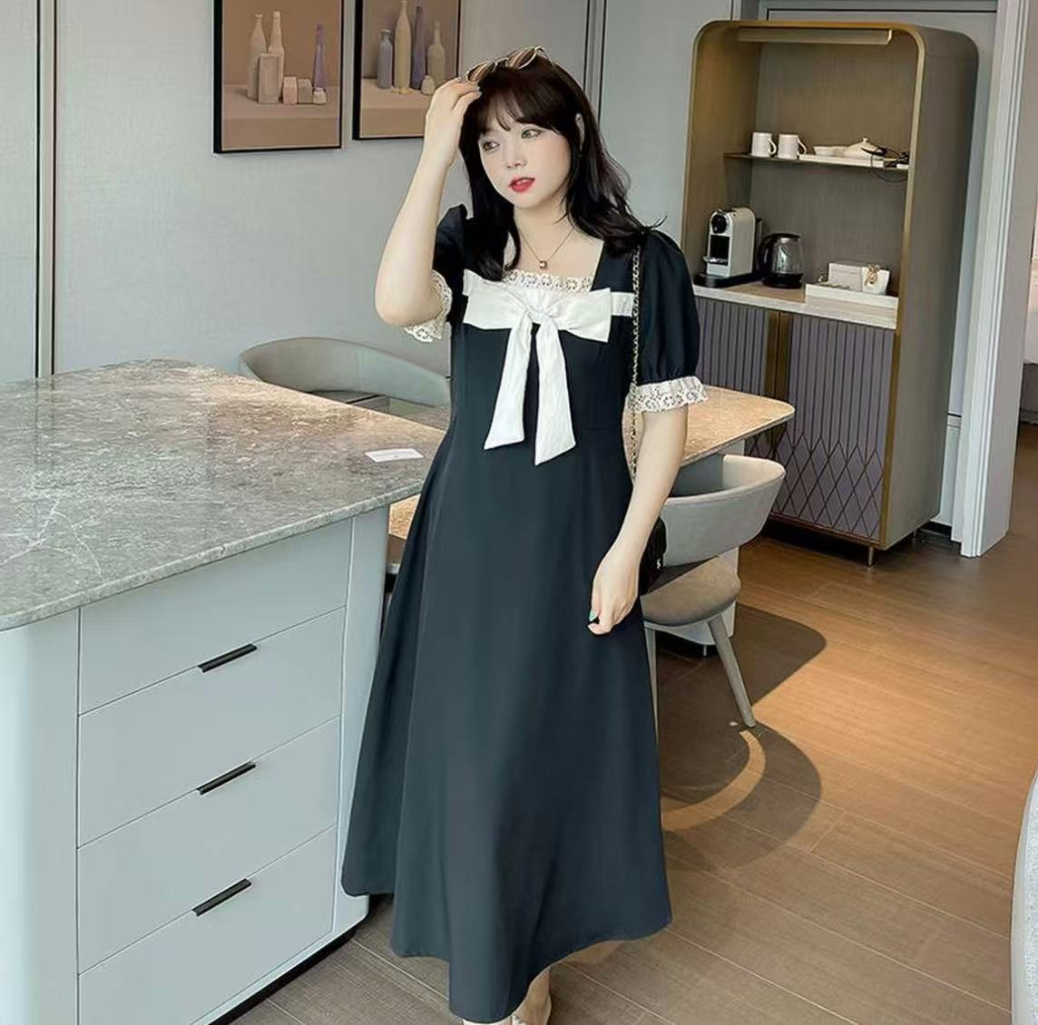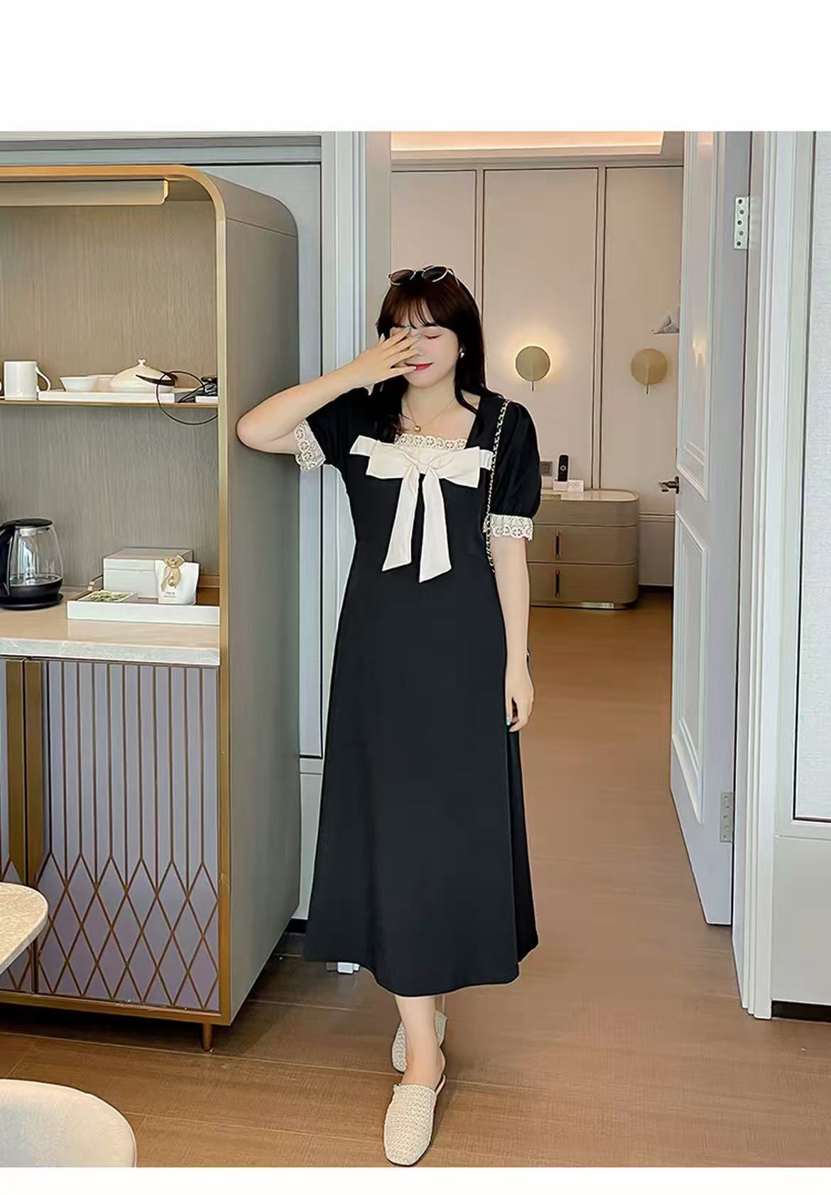 【诗铭洛可】XCX203连衣裙方领拼蕾丝蝴蝶结短袖裙B21-1