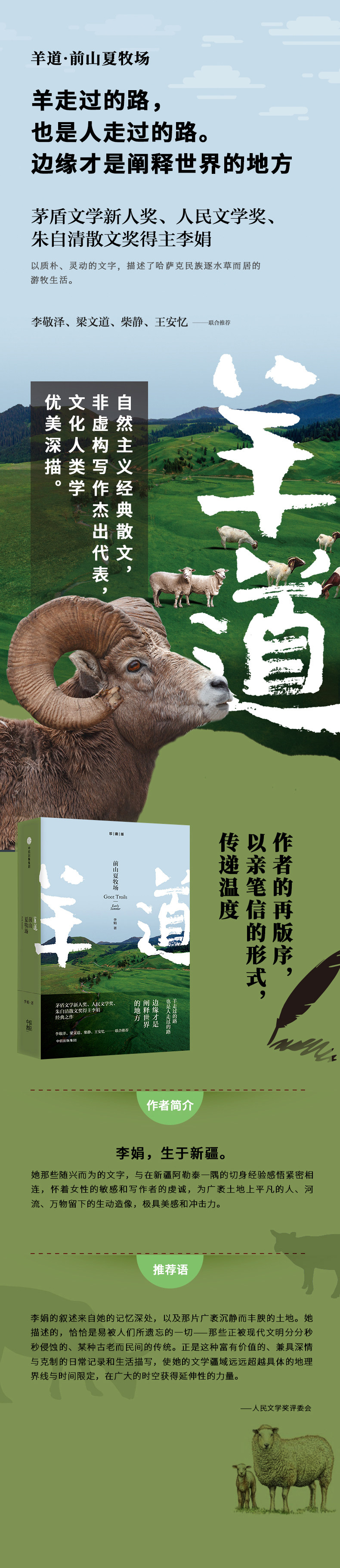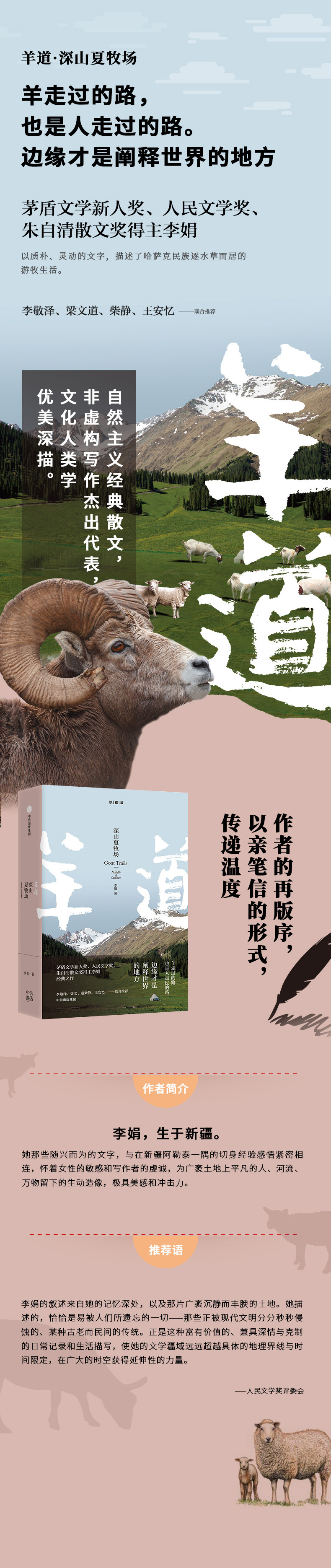 羊道是飞于山河之上和隐于草芥之中的文字,李娟在此证明她的宽广绵长。她以未经损伤的完美钝感在羊道中确立了齐物论的世界:万事万物皆是新鲜庞大,人间小事同于世界大战。阅读这个世界,让人纠结于心智上的优越与羞惭。——李敬泽