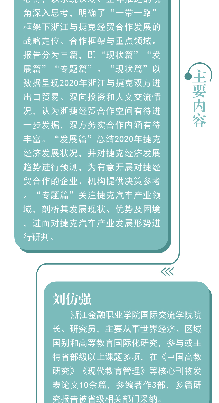 周俊子:经济学博士,浙江金融职业学院捷克研究中心学术研究部主任、副研究员,主要从事国际贸易理论与政策、国别和区域、世界经济环境与趋势研究,参与或主持国家、省、市各级课题30余项,出版和参编著作7部,在《管理世界》《经济地理》等核心刊物发表多篇学术论文,多篇研究报告获得省领导批示。