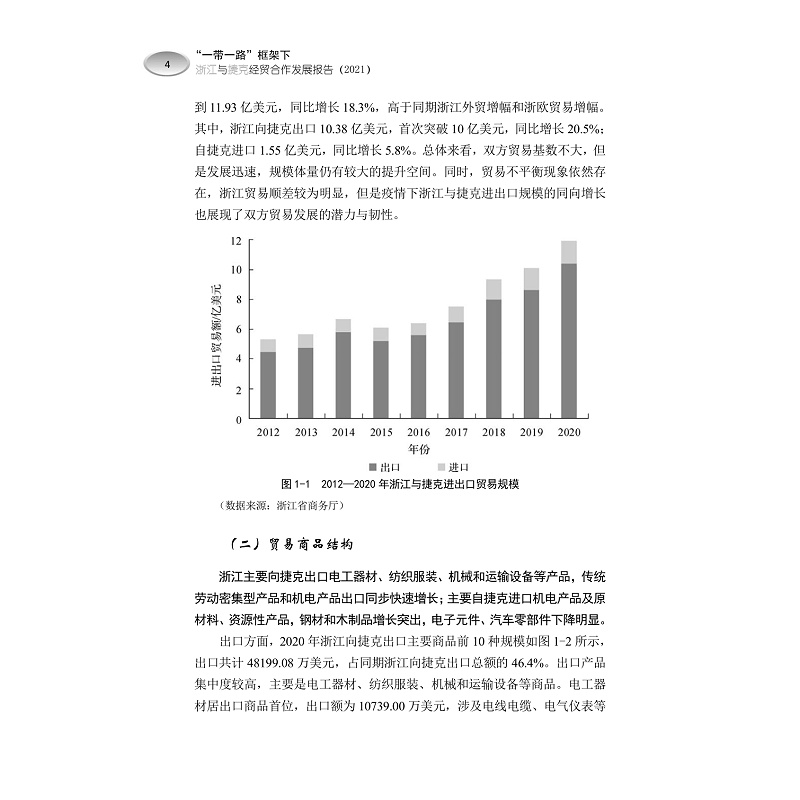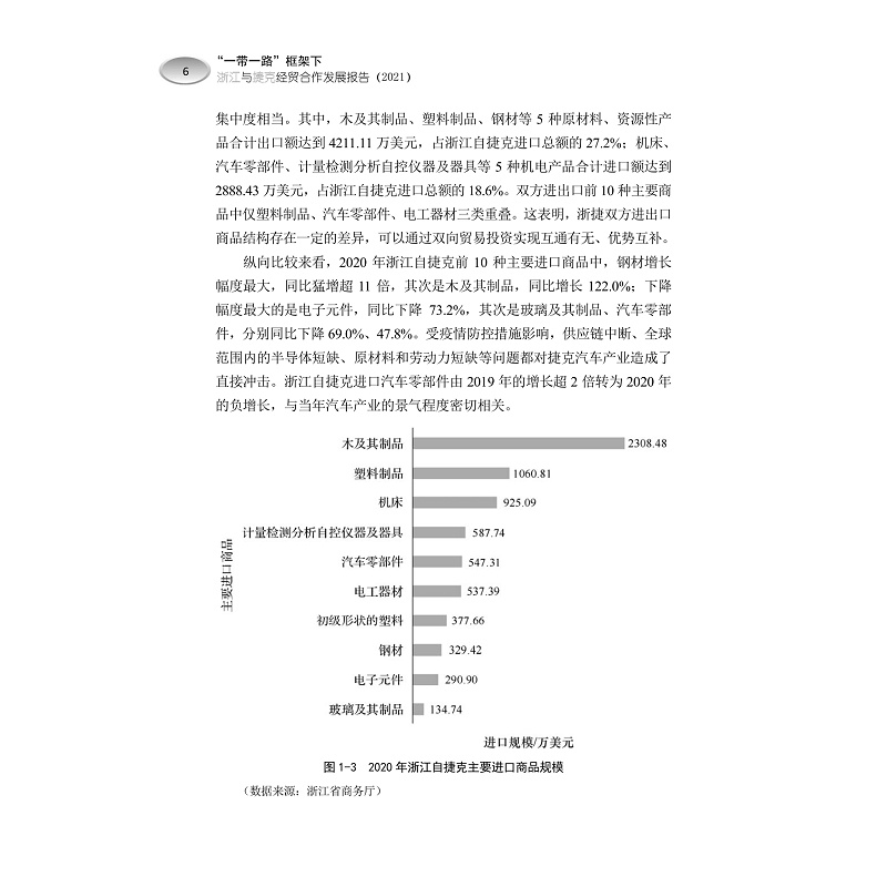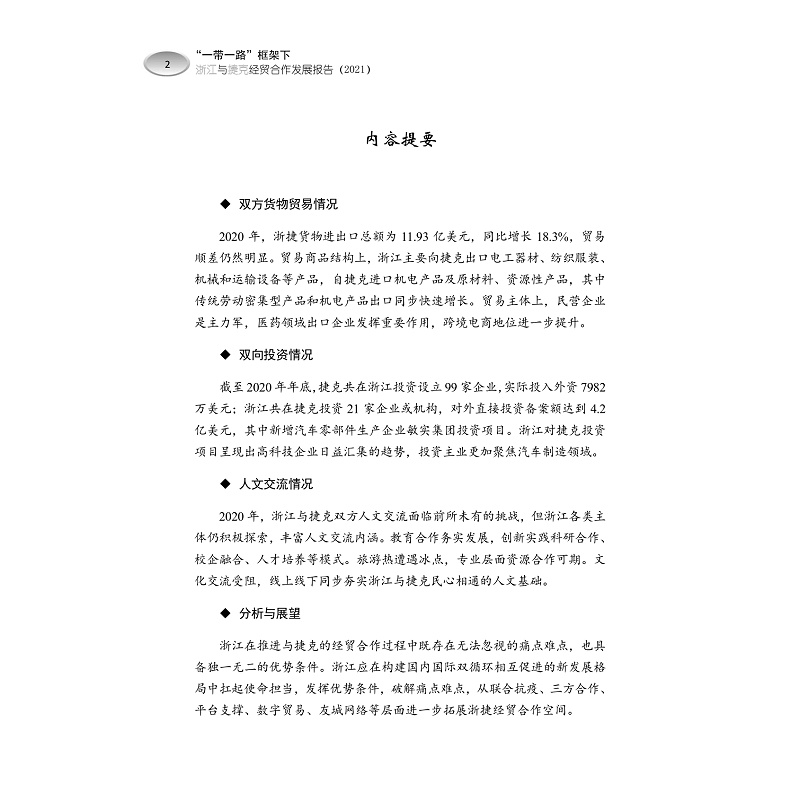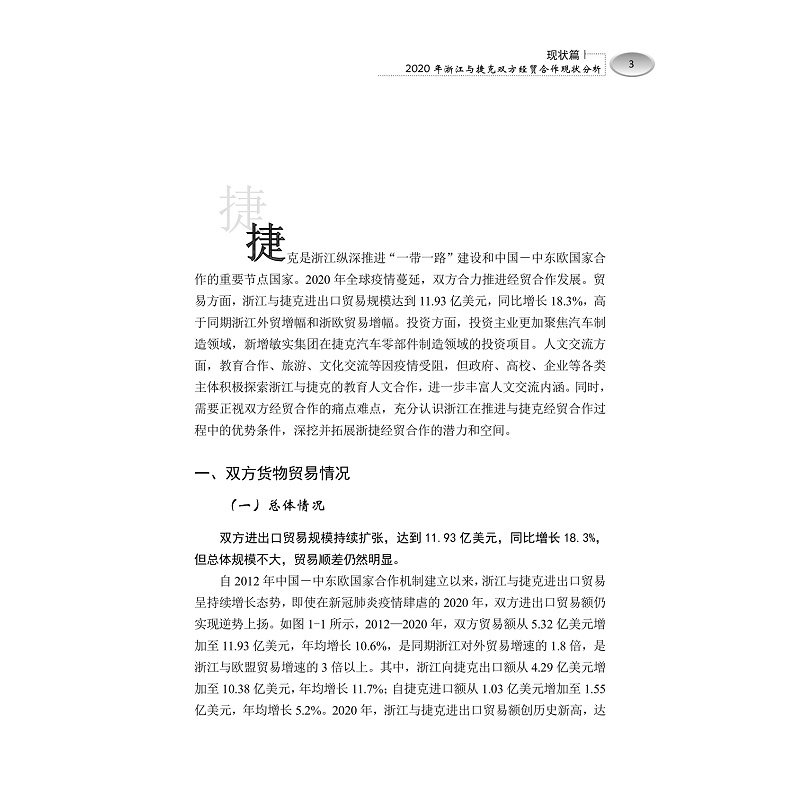 本书聚焦中国浙江与捷克,从浙江与捷克2020年的贸易投资发展现状入手,结合企业一线考察调研的心得,以系统谋划、整体推进的视角深入思考,明确了“一带一路”框架下浙江与捷克经贸合作发展的战略定位、合作框架与重点领域。报告分为三篇,即“现状篇”“发展篇”“专题篇”。“现状篇”以数据呈现2020年浙江与捷克双方进出口贸易、双向投资和人文交流情况,认为浙捷经贸合作空间有待进一步发掘,双方务实合作内涵有待丰富。“发展篇”总结2020年捷克经济发展状况,并对捷克经济发展趋势进行预测,为有意开展对捷经贸合作的企业、机构提供决策参考。“专题篇”关注捷克汽车产业领域,剖析其发展现状、优势及困境,进而对捷克汽车产业发展形势进行研判。