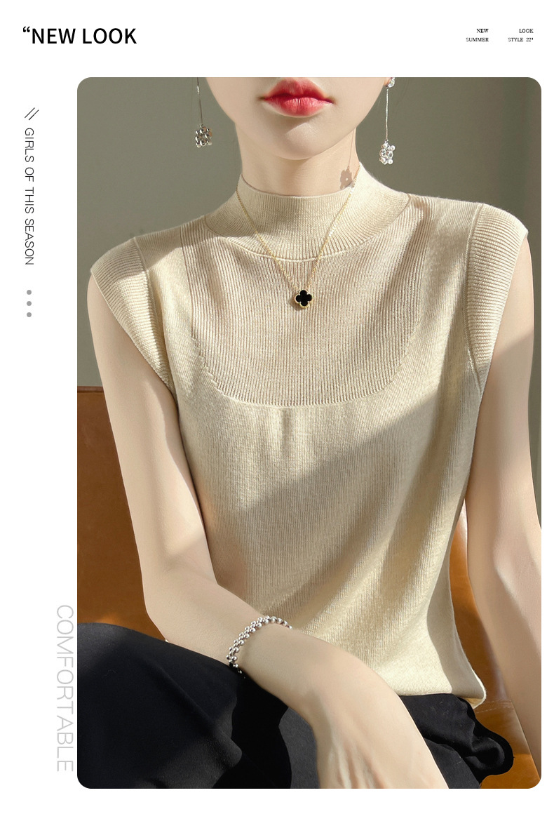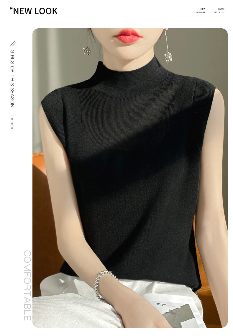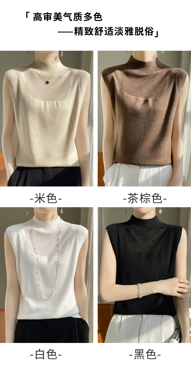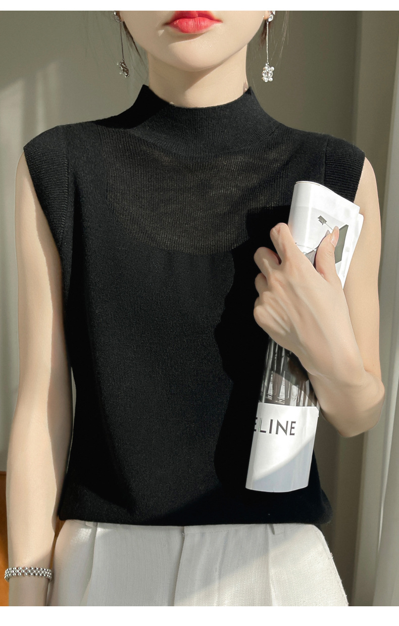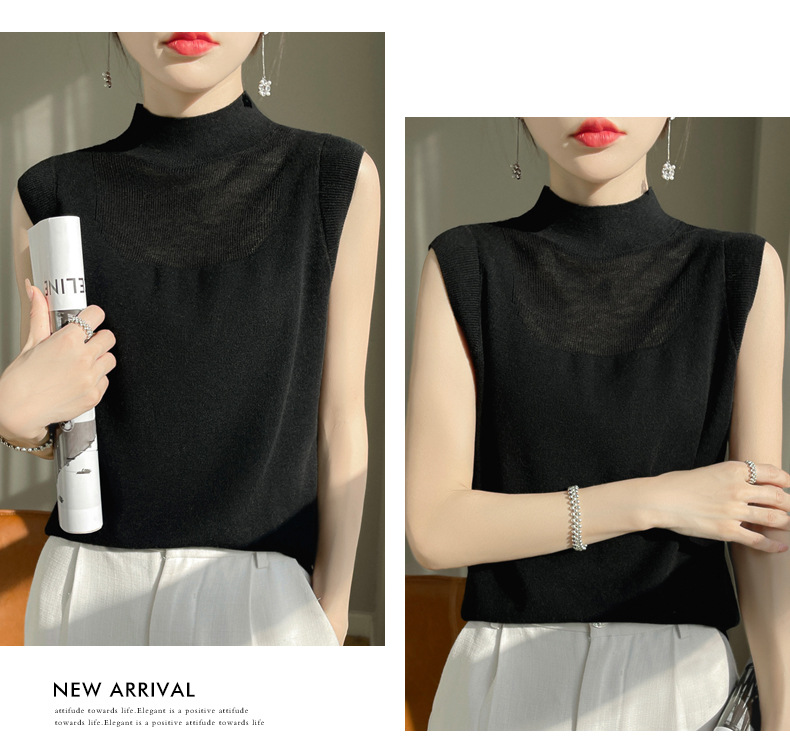 QHJY-1002精纺羊毛背心女内搭砍袖打底衫薄款纯色夏季无袖上衣镂空t恤半高