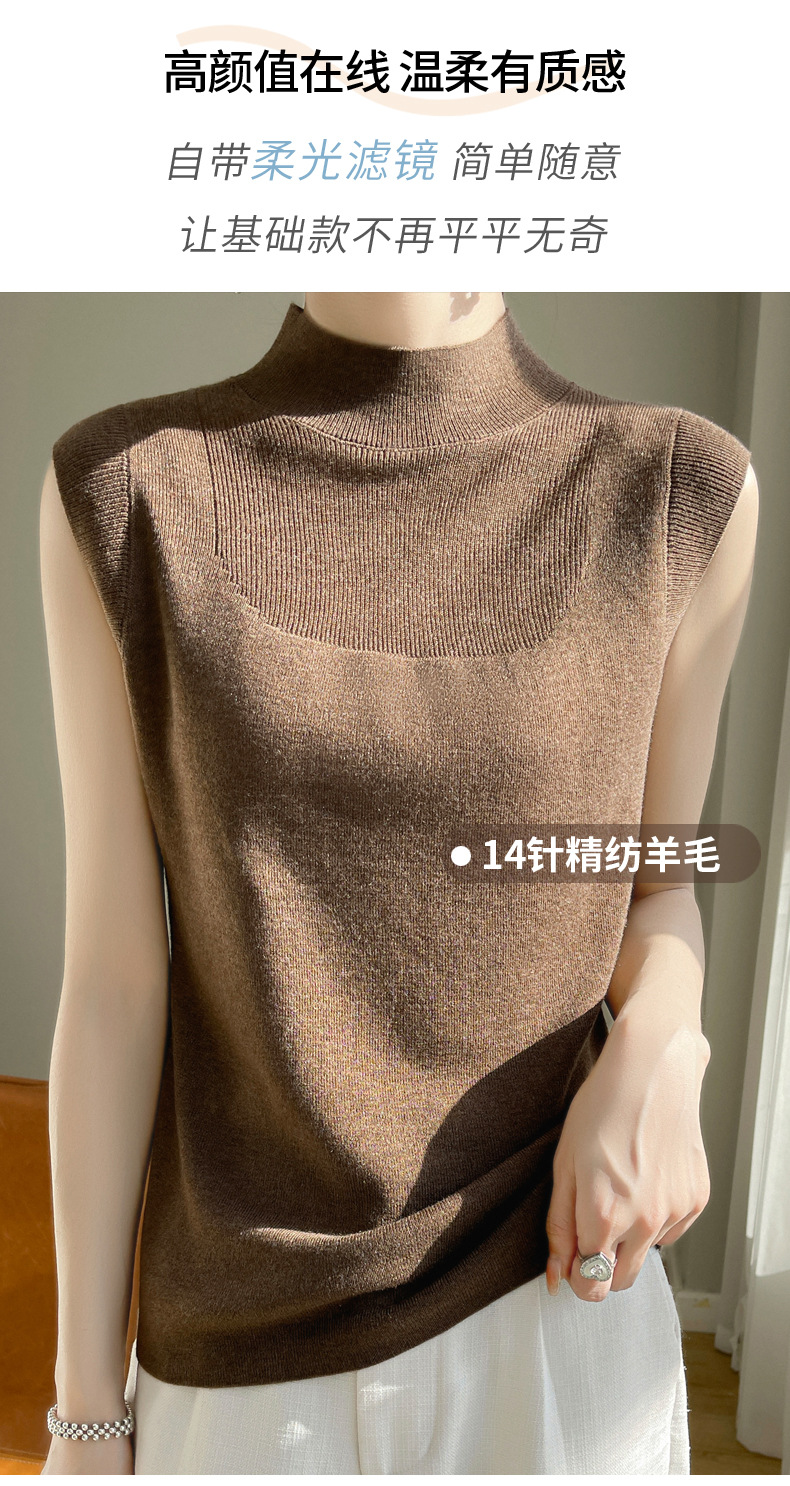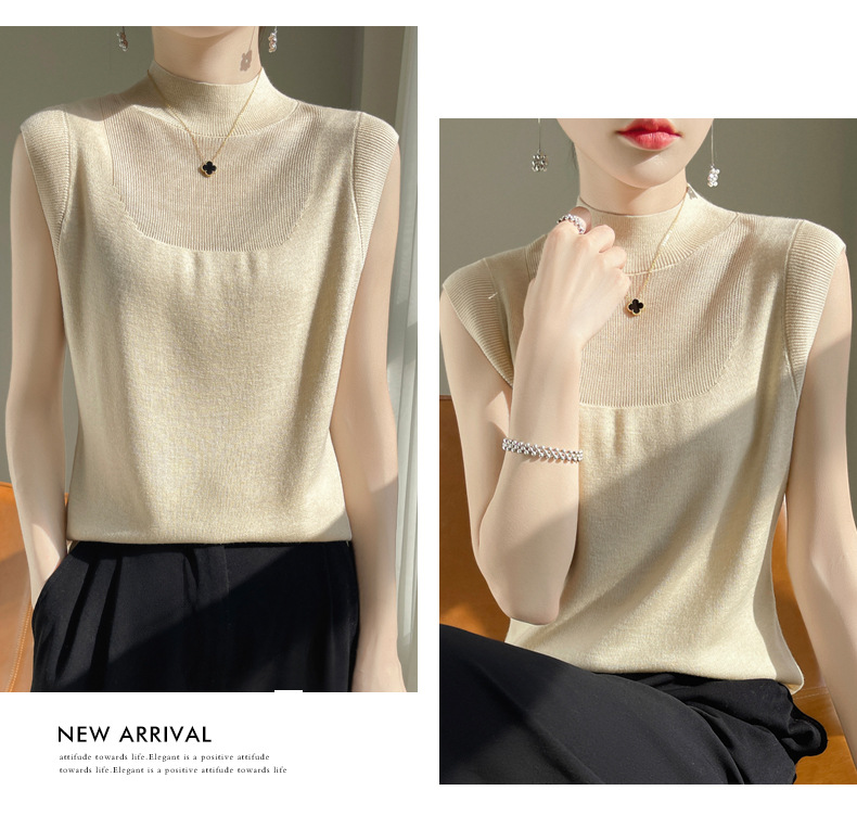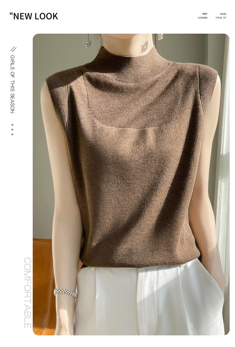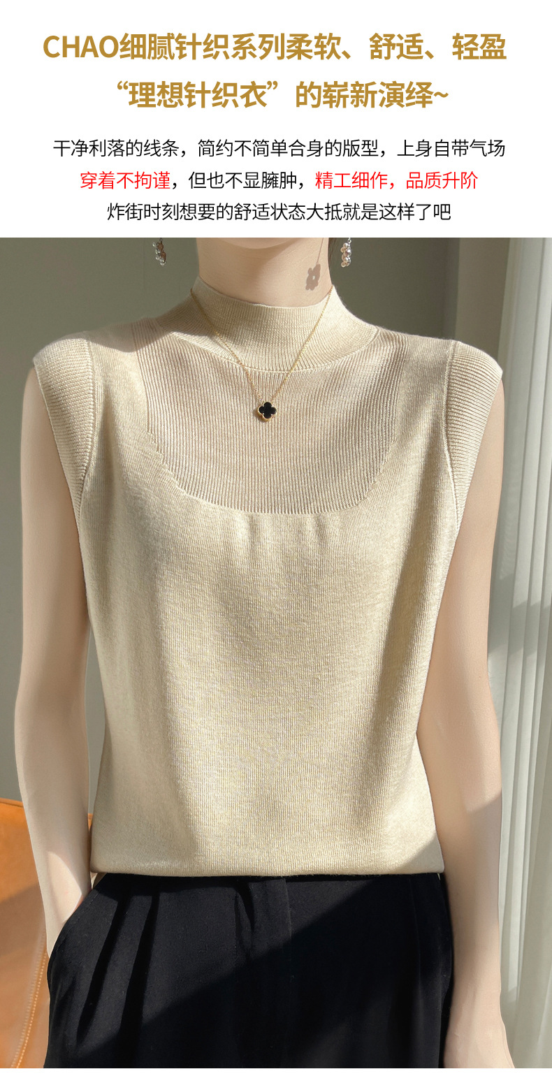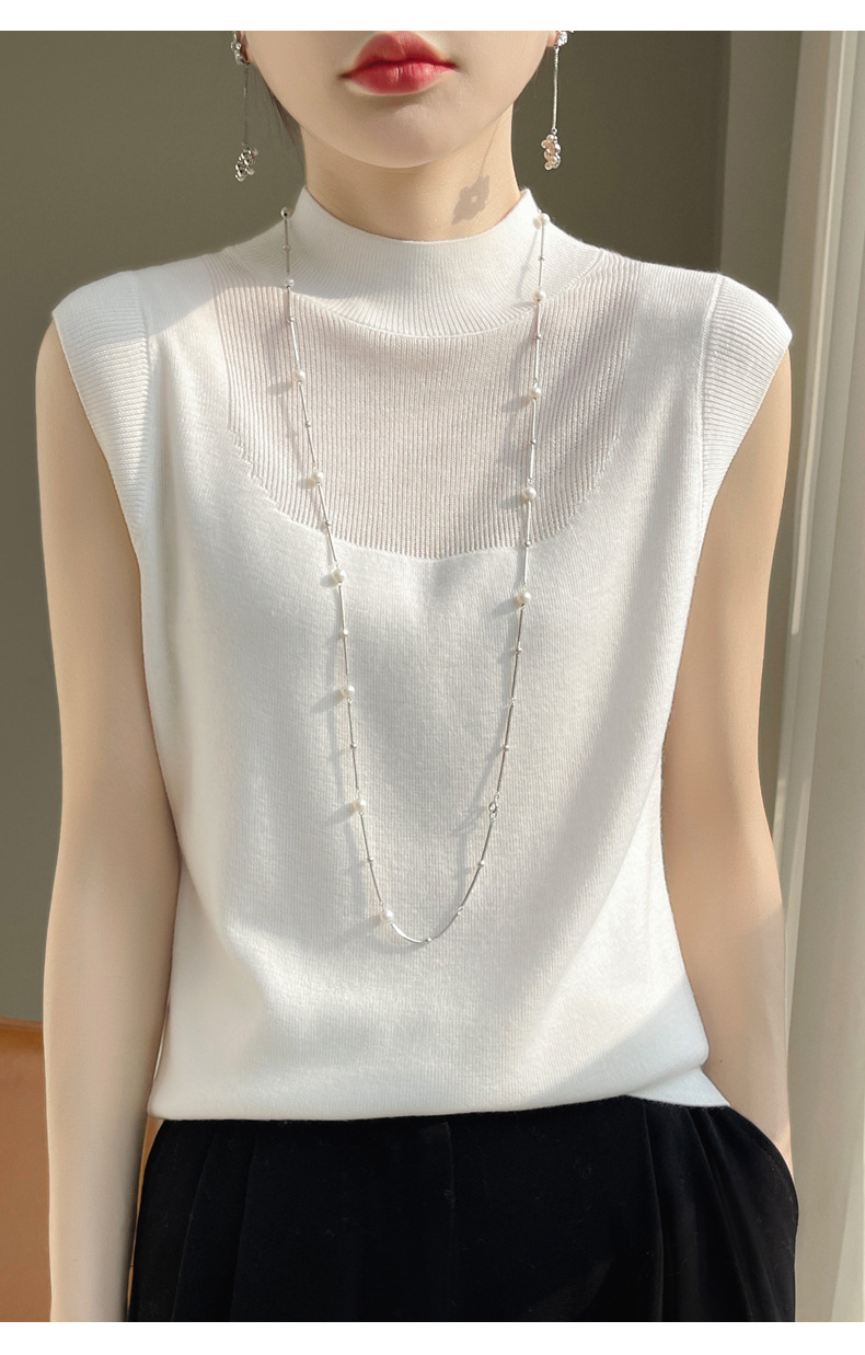 QHJY-1002精纺羊毛背心女内搭砍袖打底衫薄款纯色夏季无袖上衣镂空t恤半高