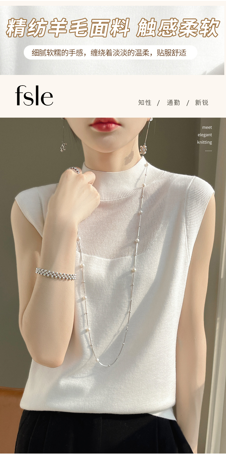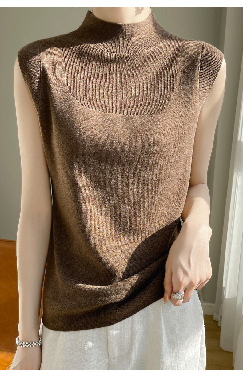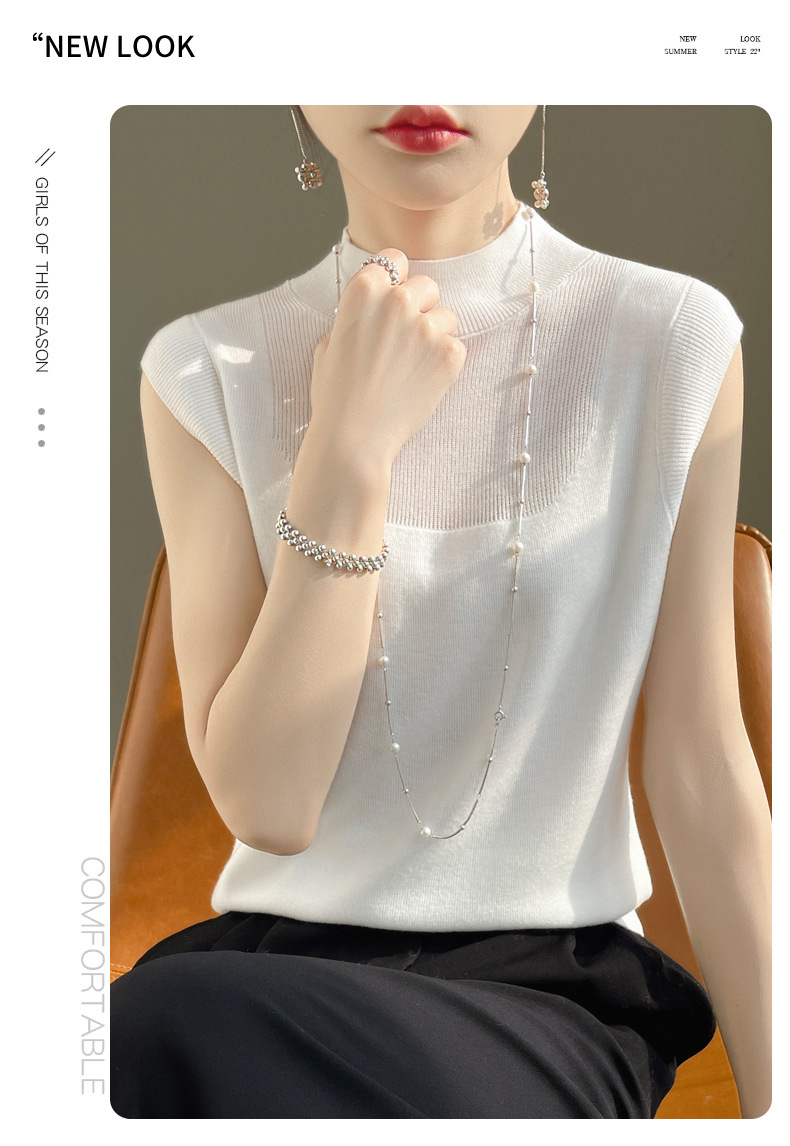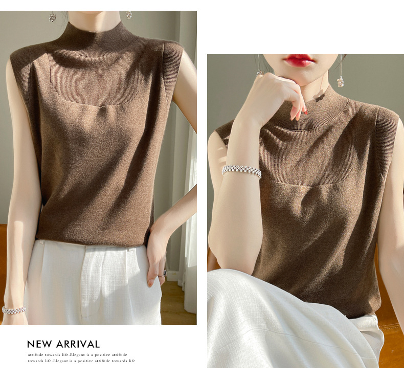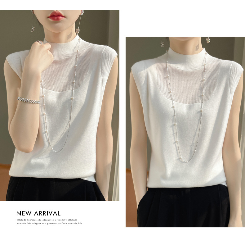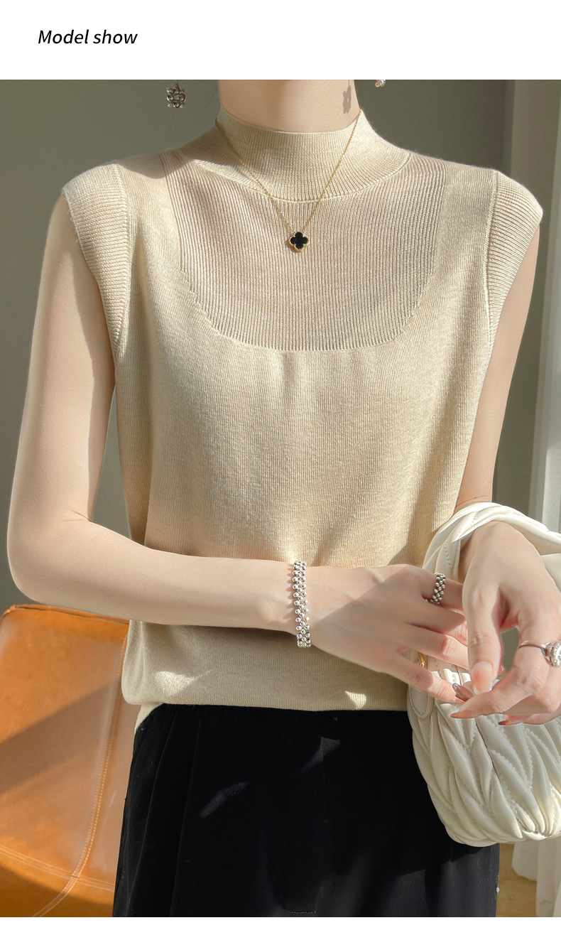 QHJY-1002精纺羊毛背心女内搭砍袖打底衫薄款纯色夏季无袖上衣镂空t恤半高