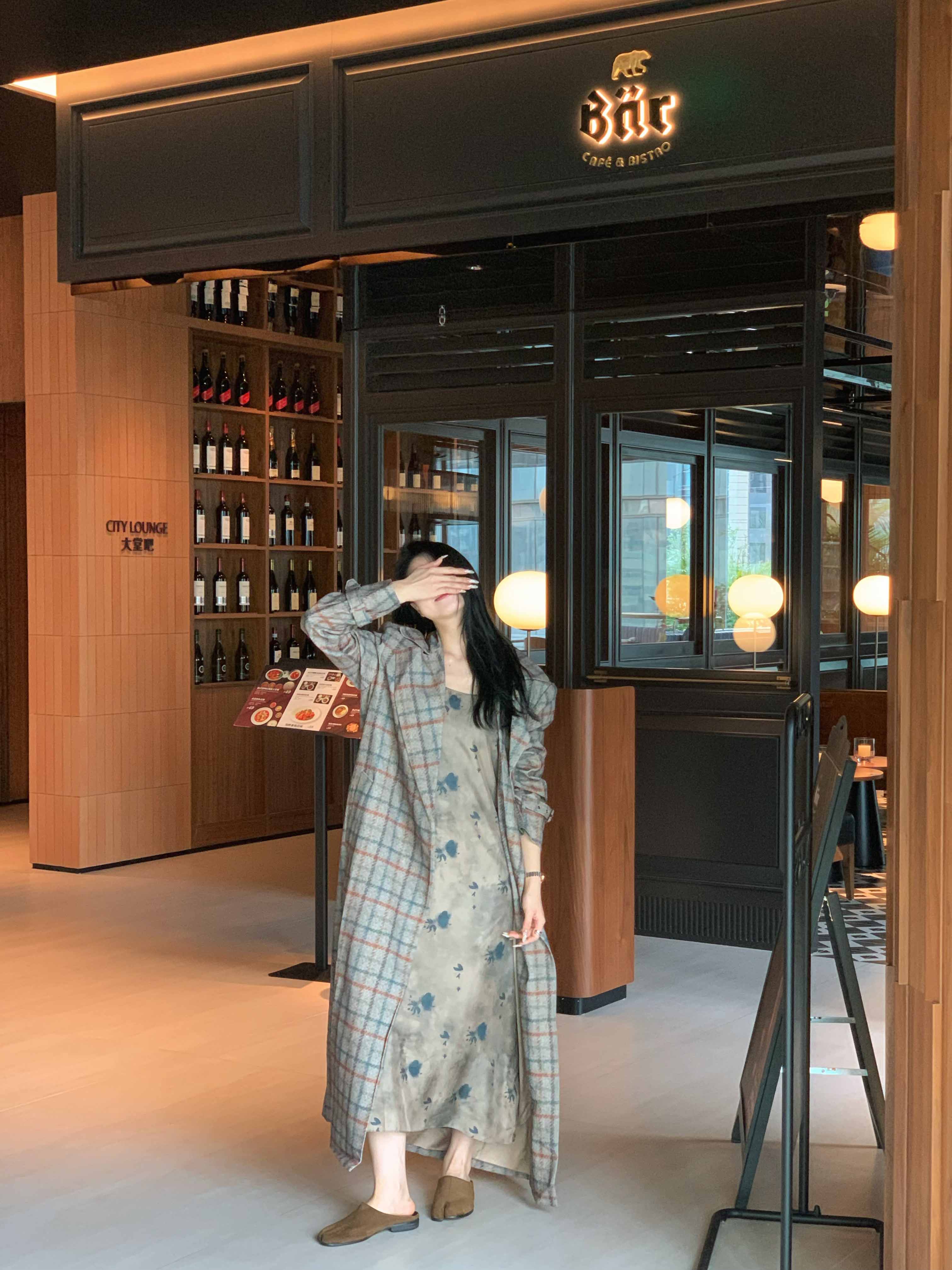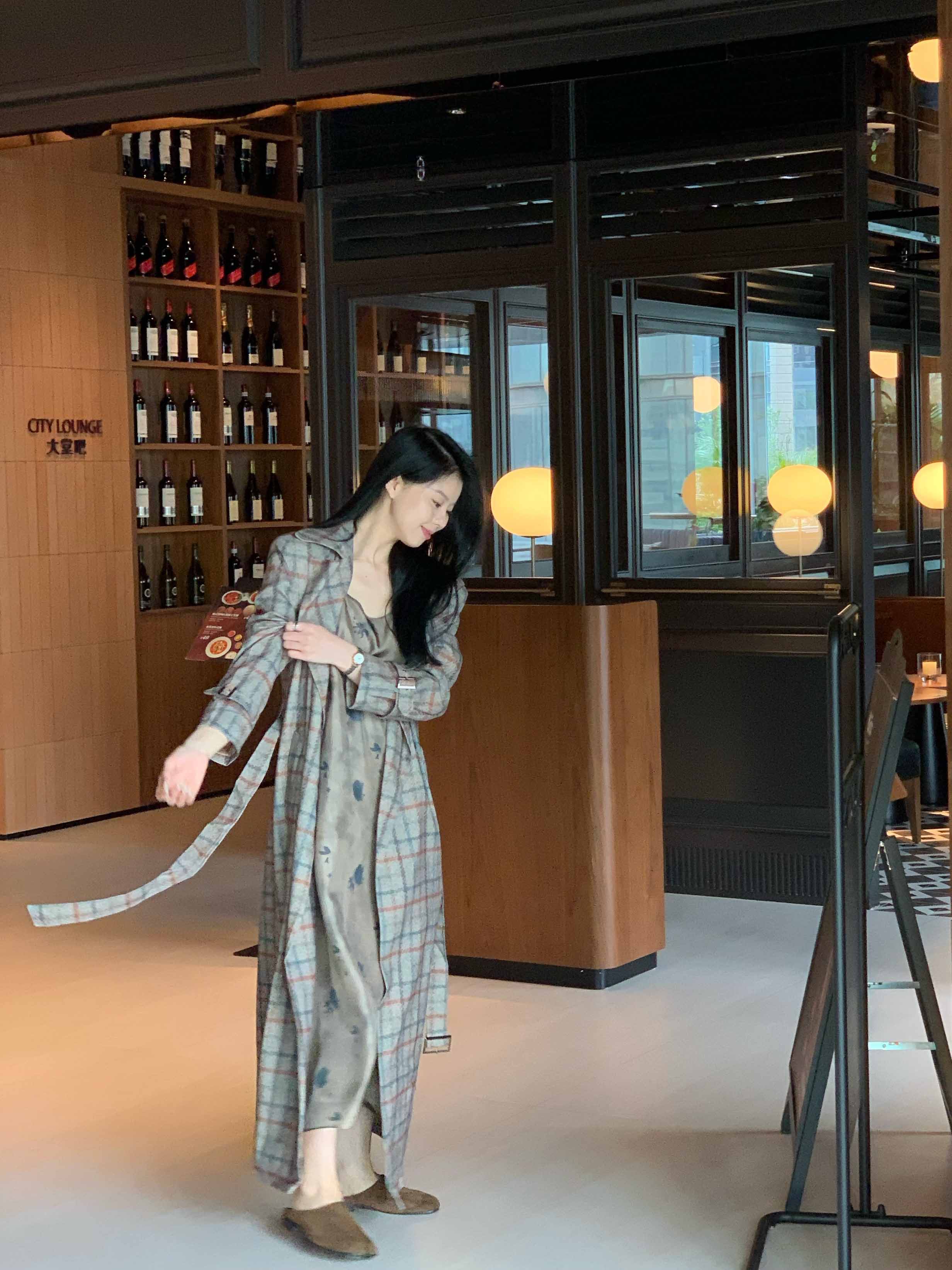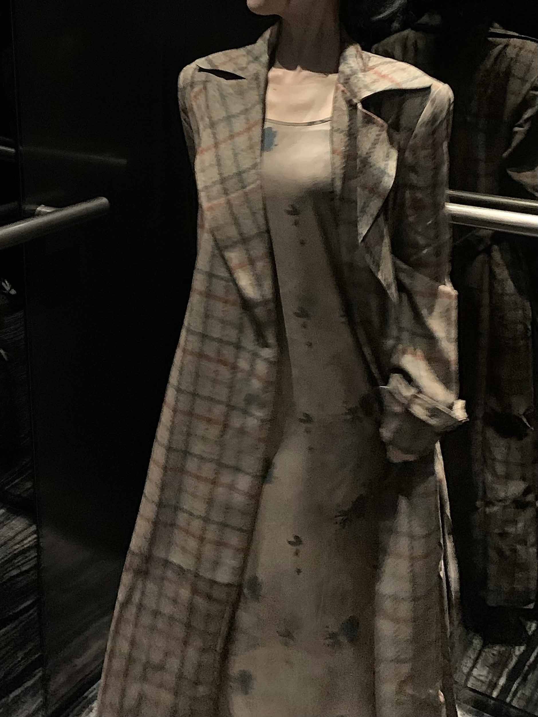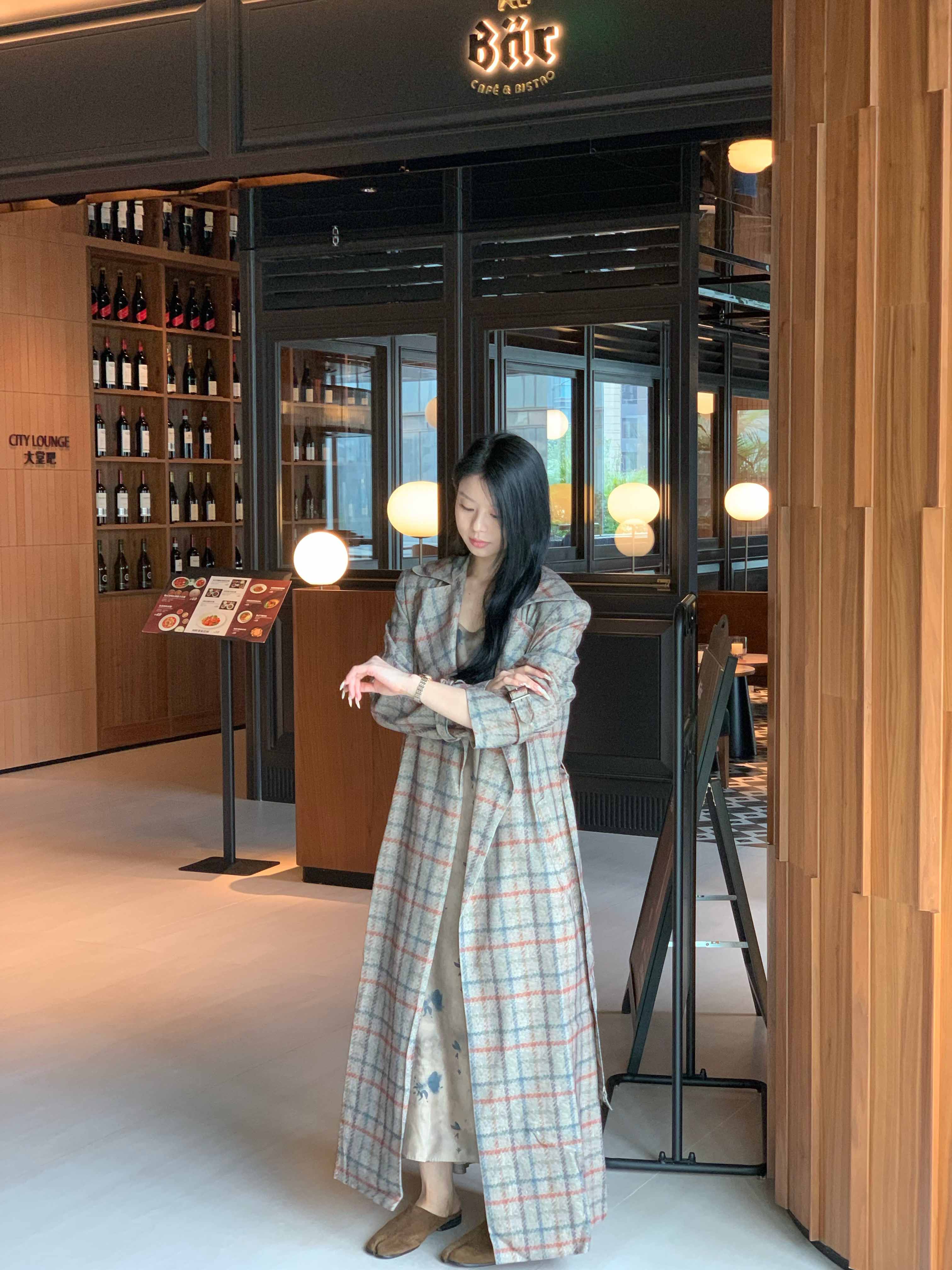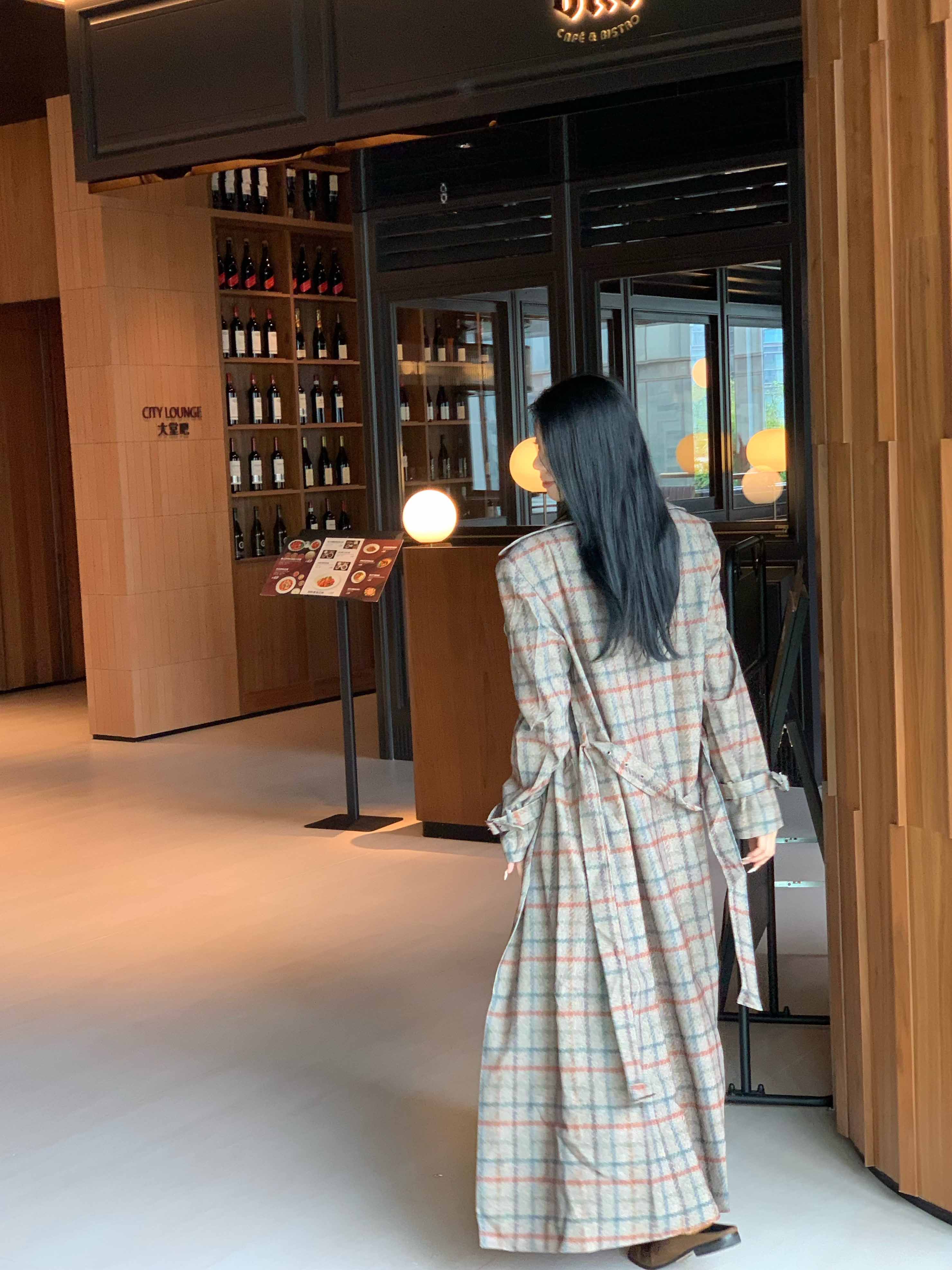 顺丰包邮洛诗琳35155复古英伦风长款慵懒格纹风衣女6044
