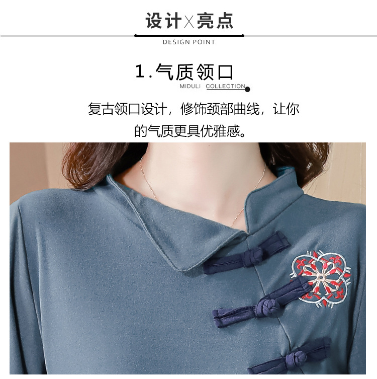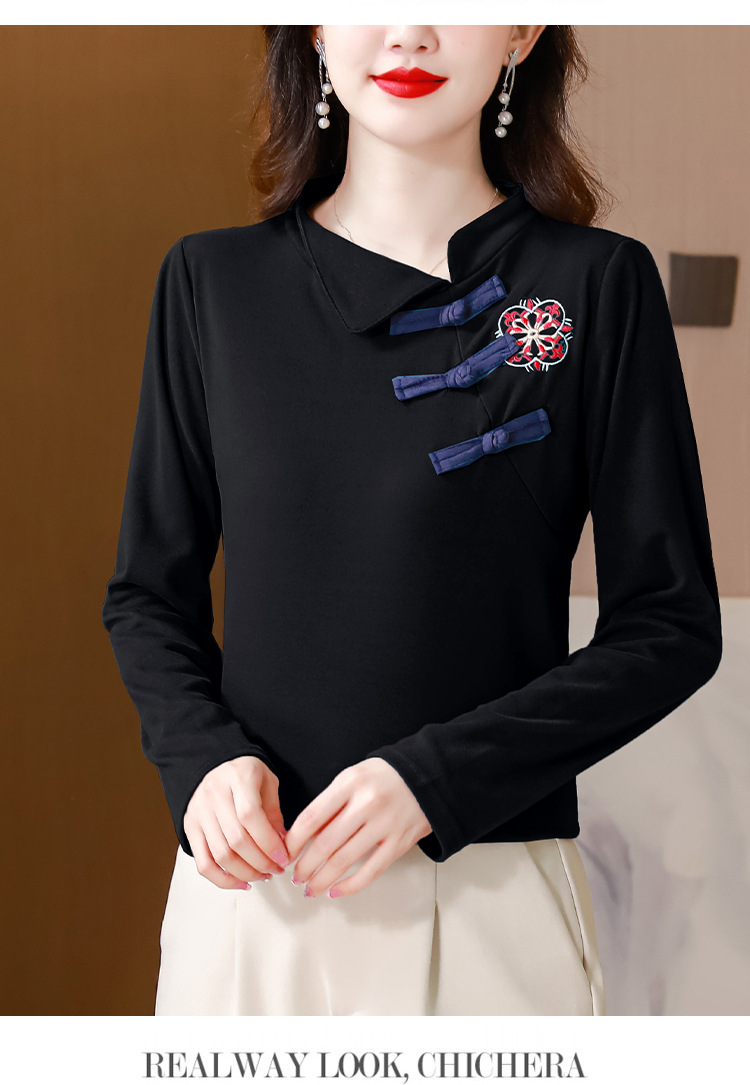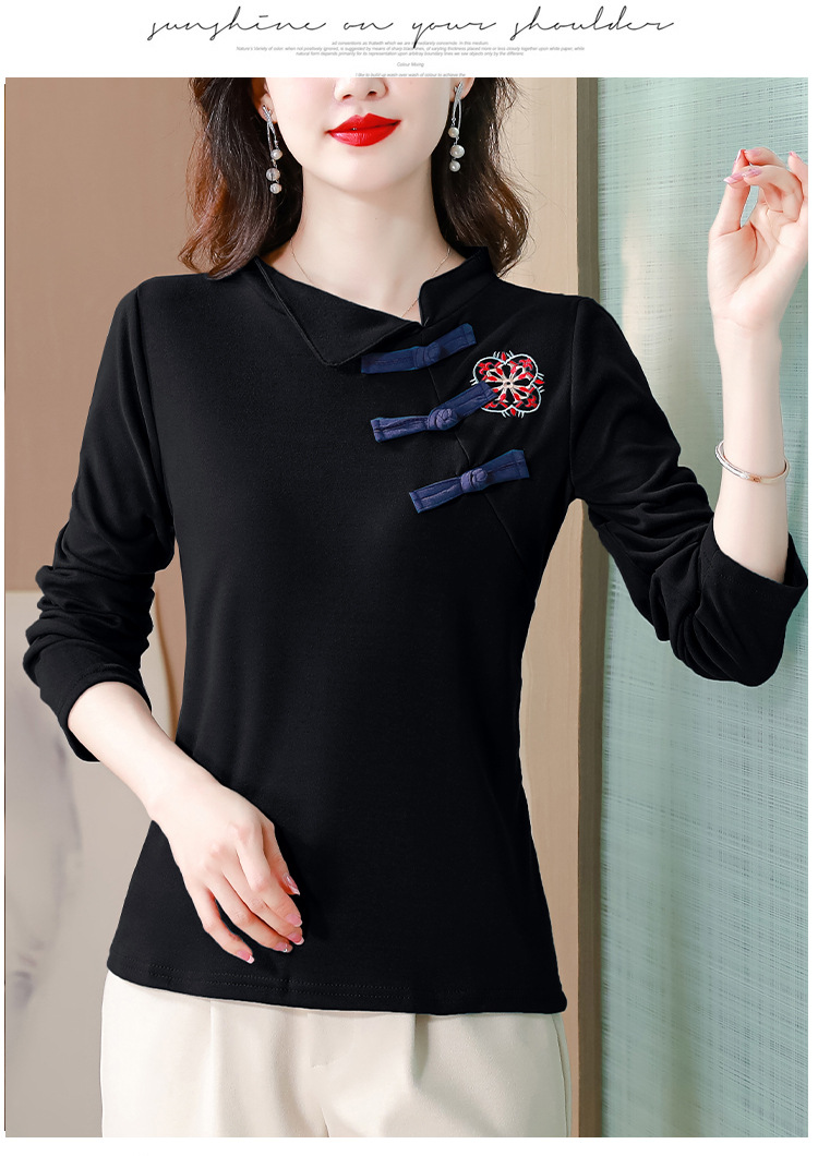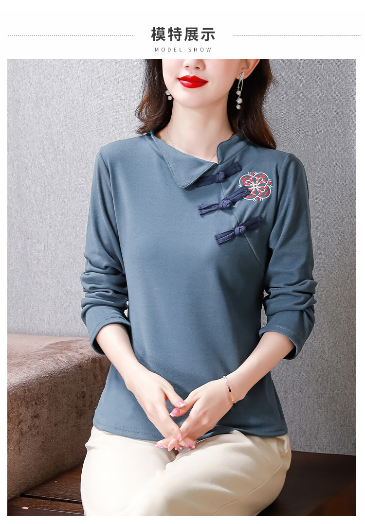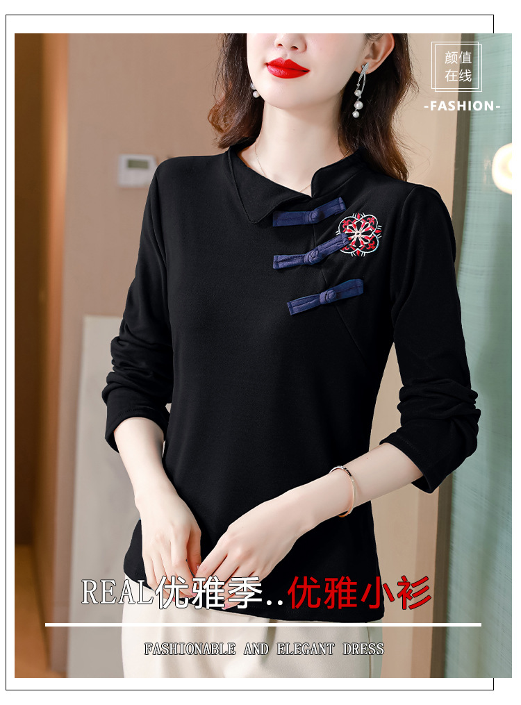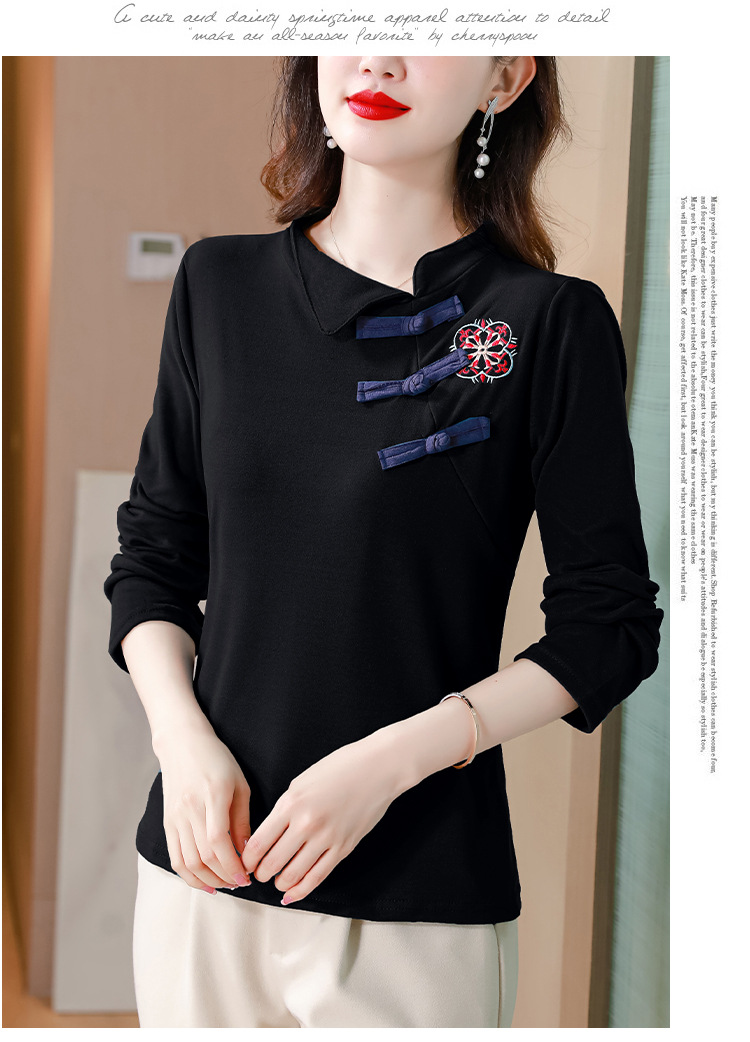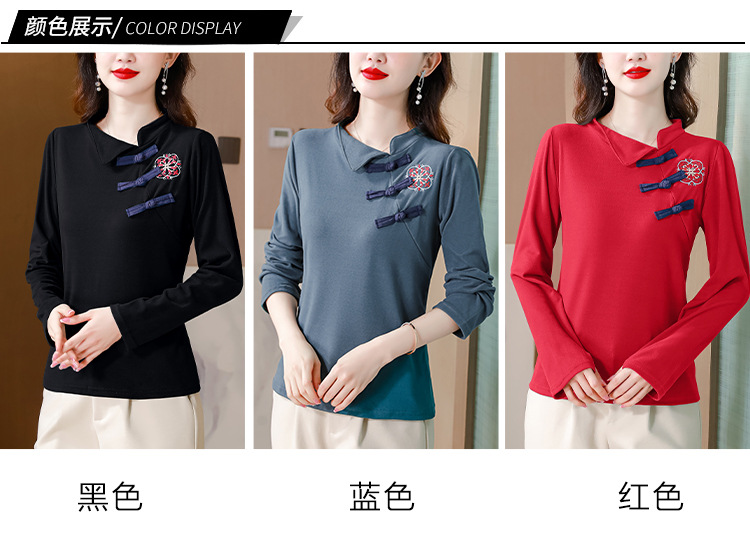 KQLA83N6654 文艺复古盘扣刺绣长袖打底衫女秋装2023新款大码宽松显瘦长袖T恤