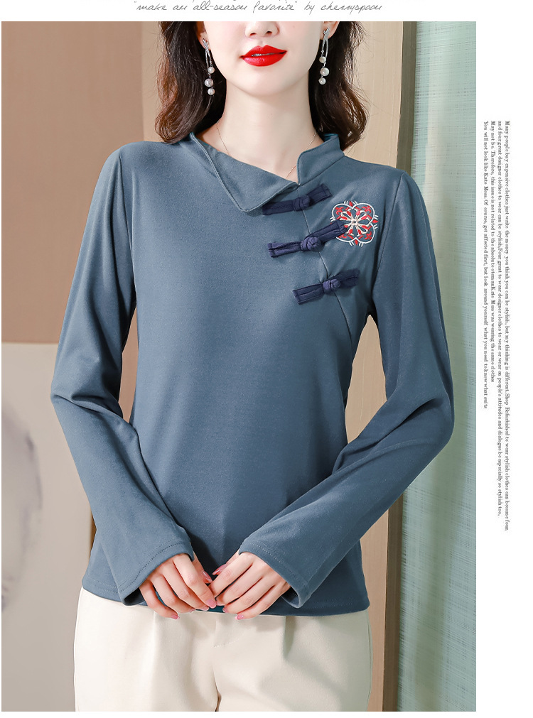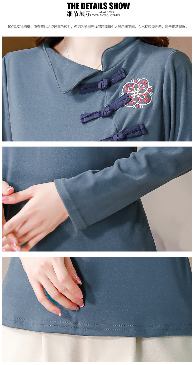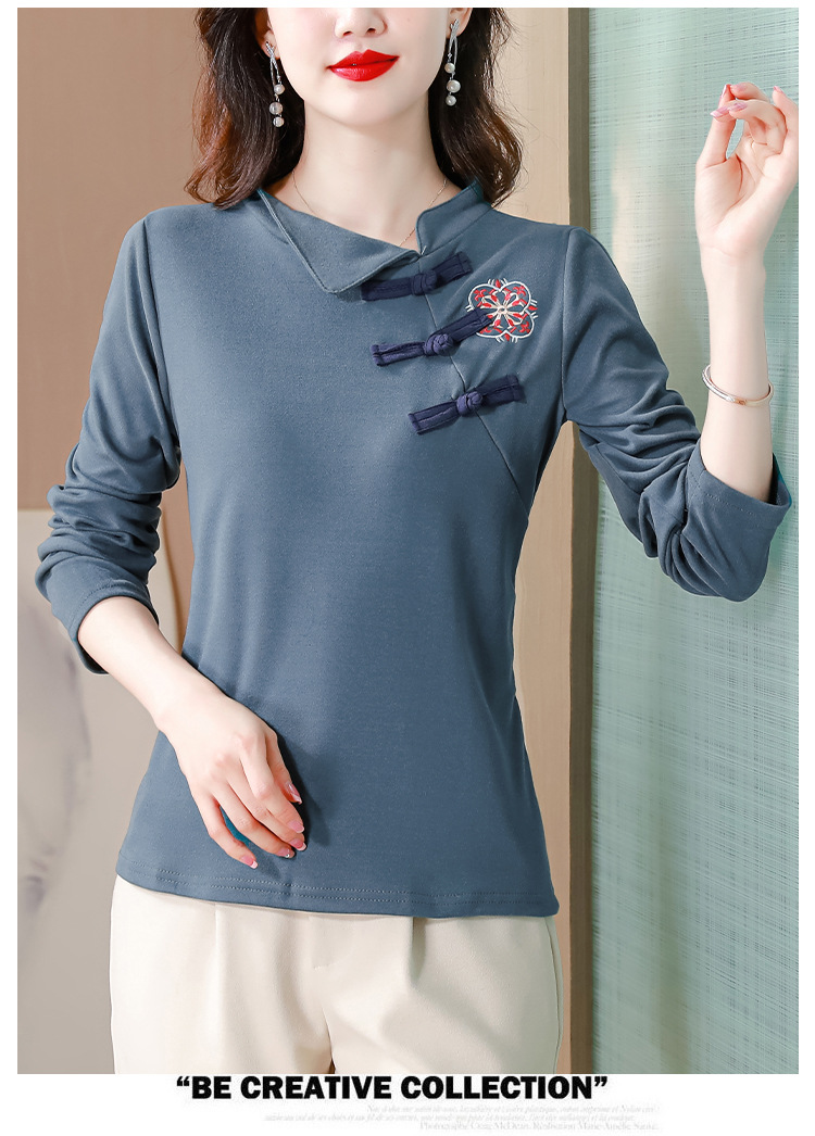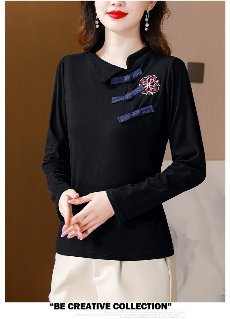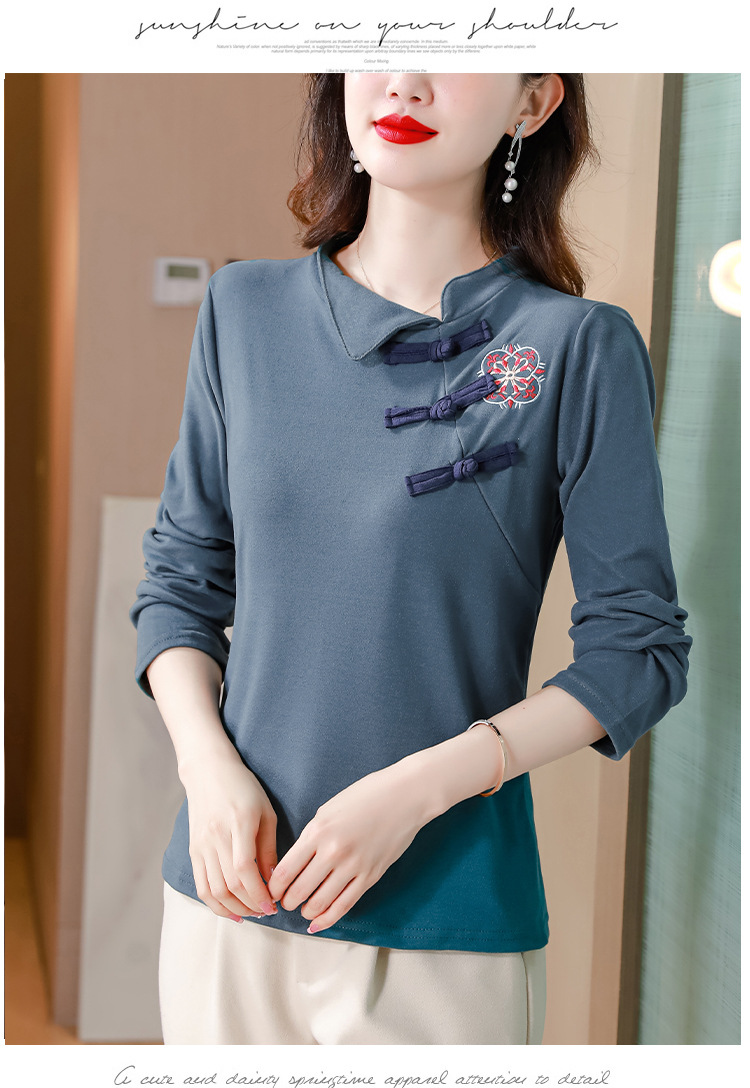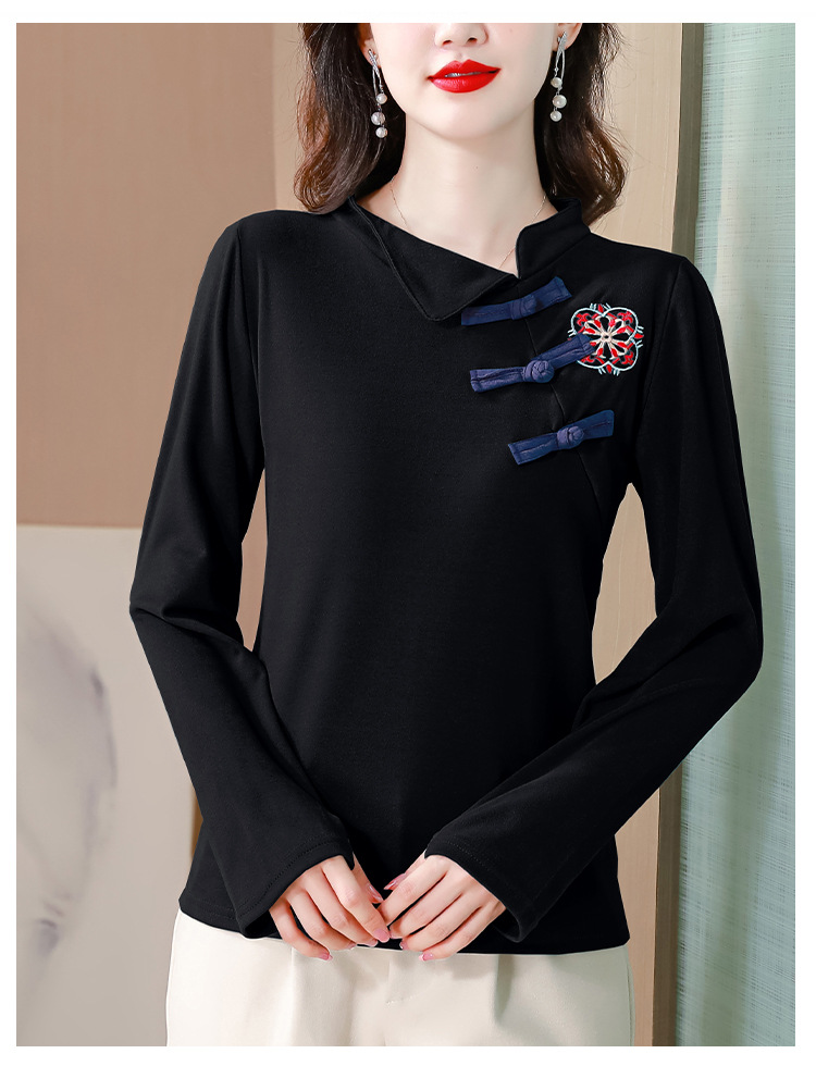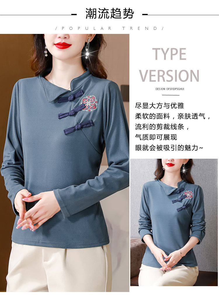 KQLA83N6654 文艺复古盘扣刺绣长袖打底衫女秋装2023新款大码宽松显瘦长袖T恤