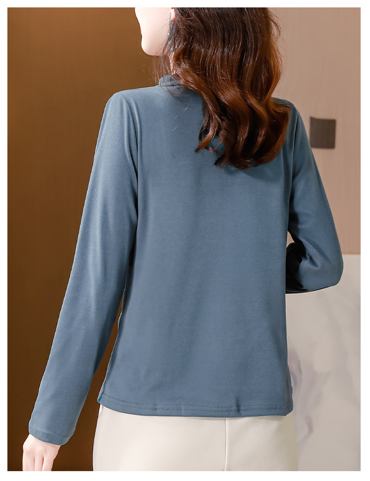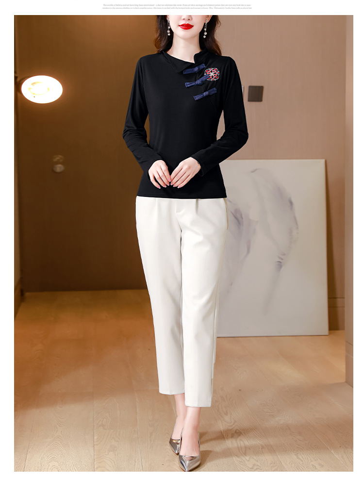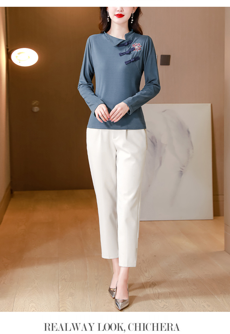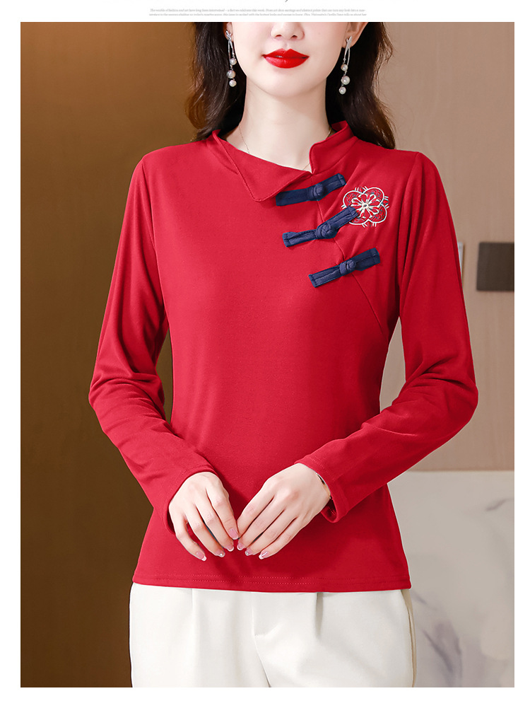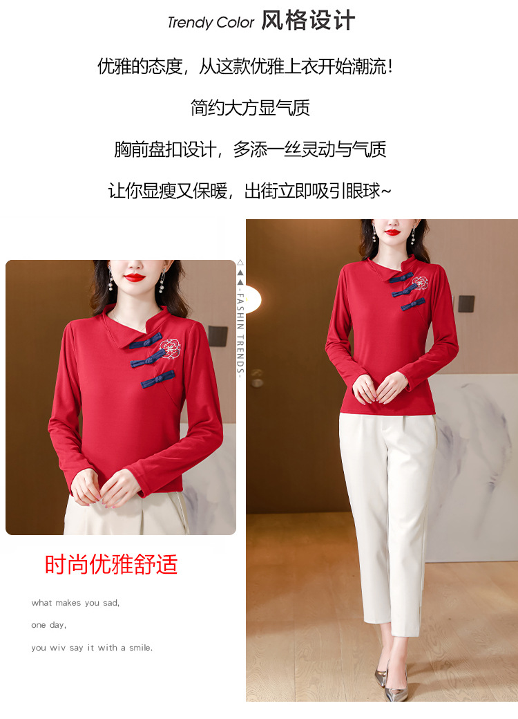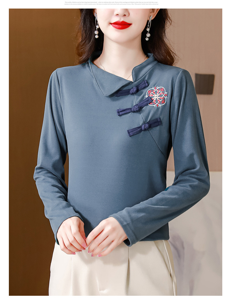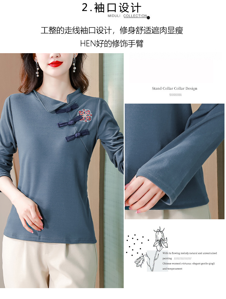 KQLA83N6654 文艺复古盘扣刺绣长袖打底衫女秋装2023新款大码宽松显瘦长袖T恤