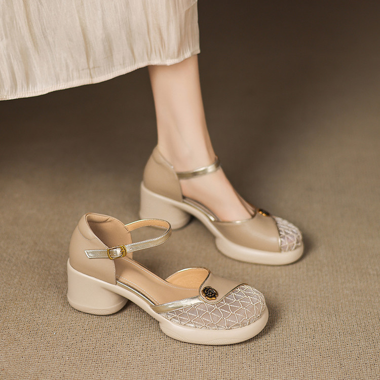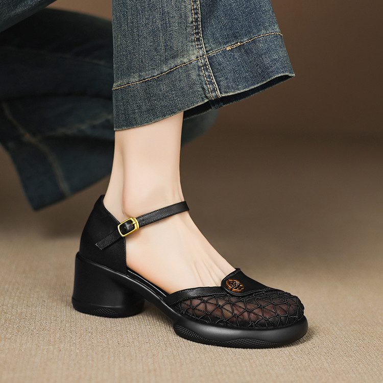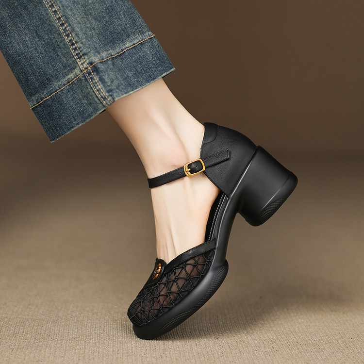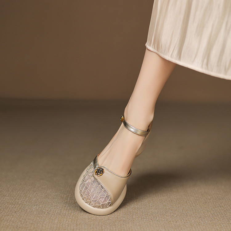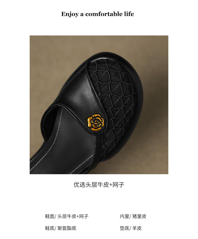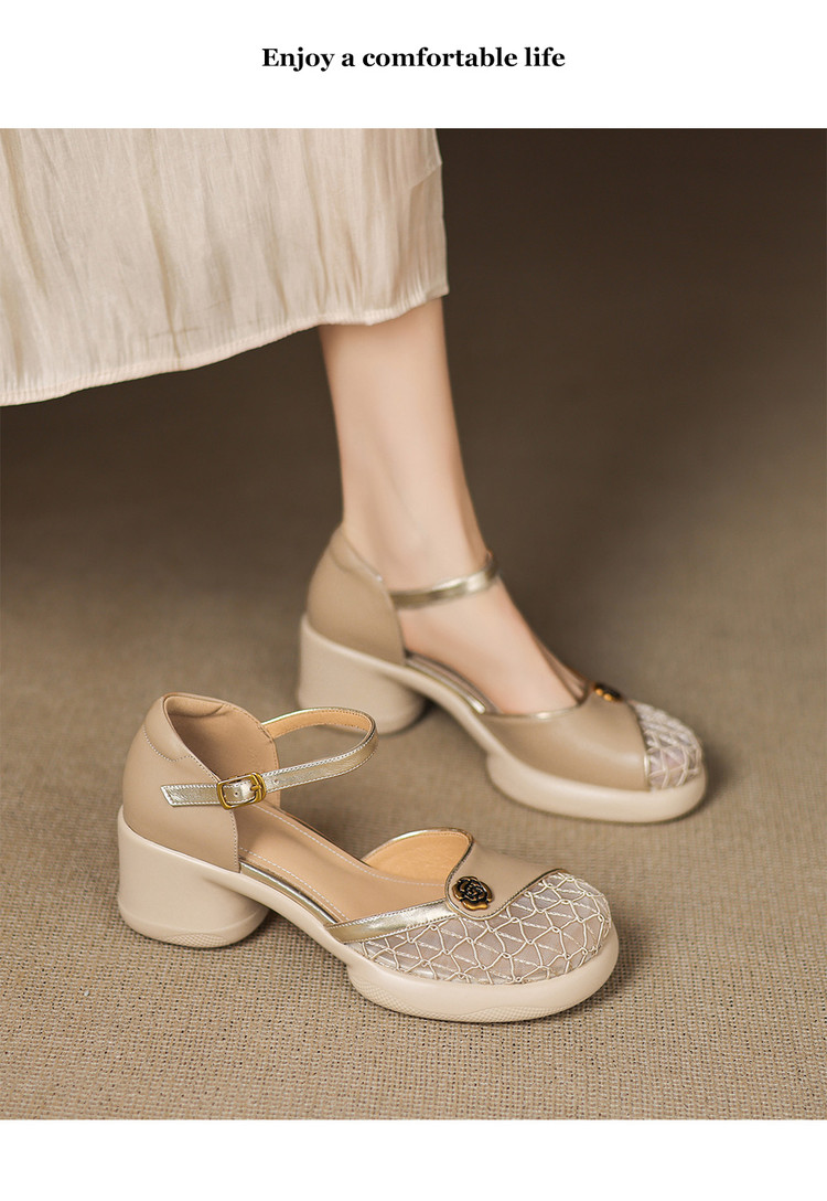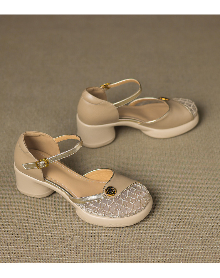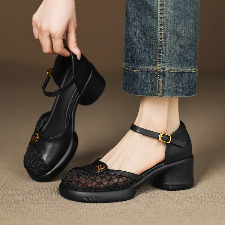 【预售5天】轻软舒适!仙女风透气网纱粗跟包头凉鞋女新款真皮百搭厚底高跟鞋ZYY&A1228