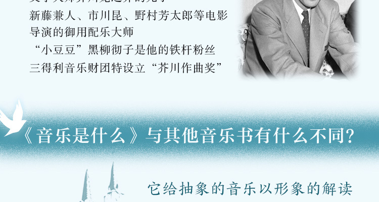 《音乐是什么》由音乐评论家、《爱乐》前主编曹利群审校并热情推荐。比同系列作品《如何听懂音乐》《极简音乐史》更好读,更清晰,更贴近现代。作者是日本电影配乐的一代大师,曾跟众多知名导演合作,更受到黑柳彻子等人喜爱。本书兼具大众和专业特色,设计清新优美。