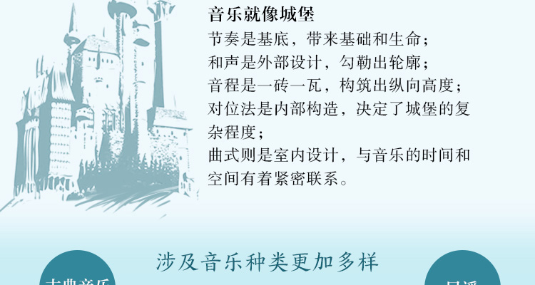 音乐像一座城堡。节奏是基底,带来基础和生命;和声是外部设计,勾勒出轮廓;音程是一砖一瓦,构筑出纵向高度;对位法是内部构造,决定了城堡的复杂程度;曲式则是室内设计,与音乐的时间和空间有着紧密联系。