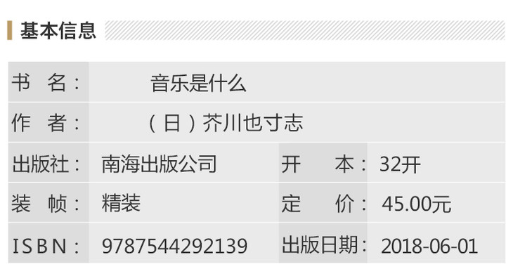 《音乐是什么》是文学大师芥川龙之介之子、现代音乐大师芥川也寸志写给大家的音乐入门书。音乐到底是什么?一本小书给你的解答,畅销日本四十余年,至今仍雄踞各大音乐书籍排行榜。