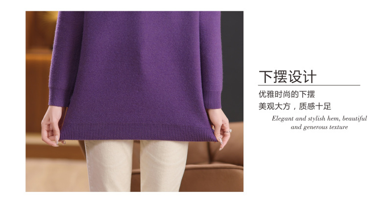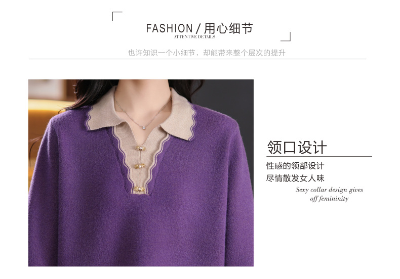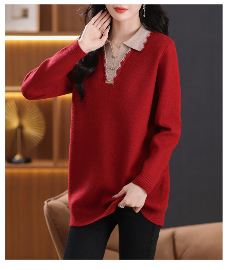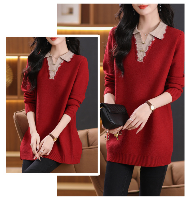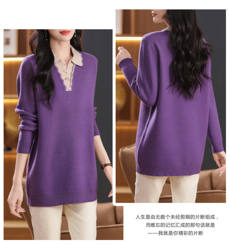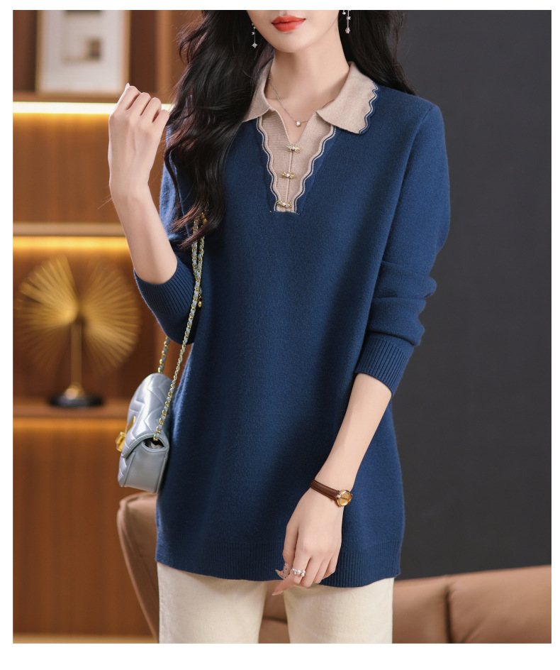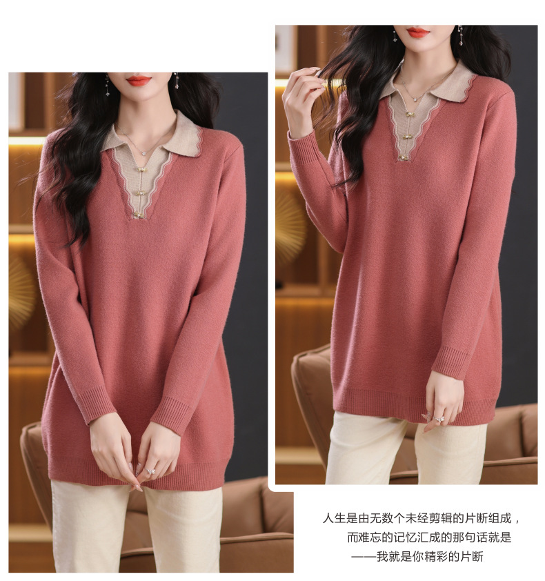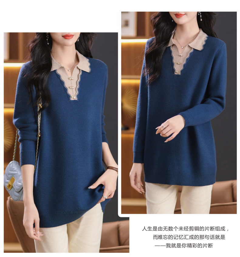 CC-5-6115翻领拼色中长款毛衣女2024秋冬新款大码宽松休闲针织衫百搭打底衫