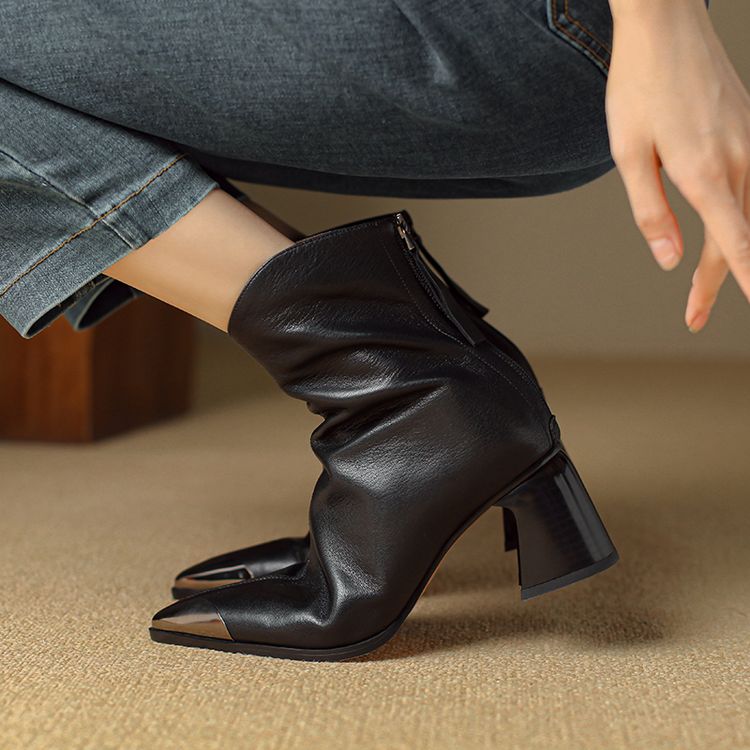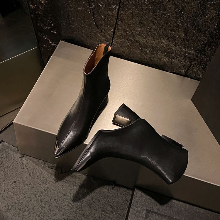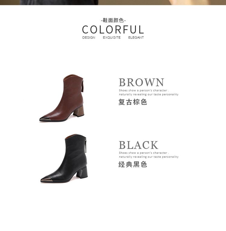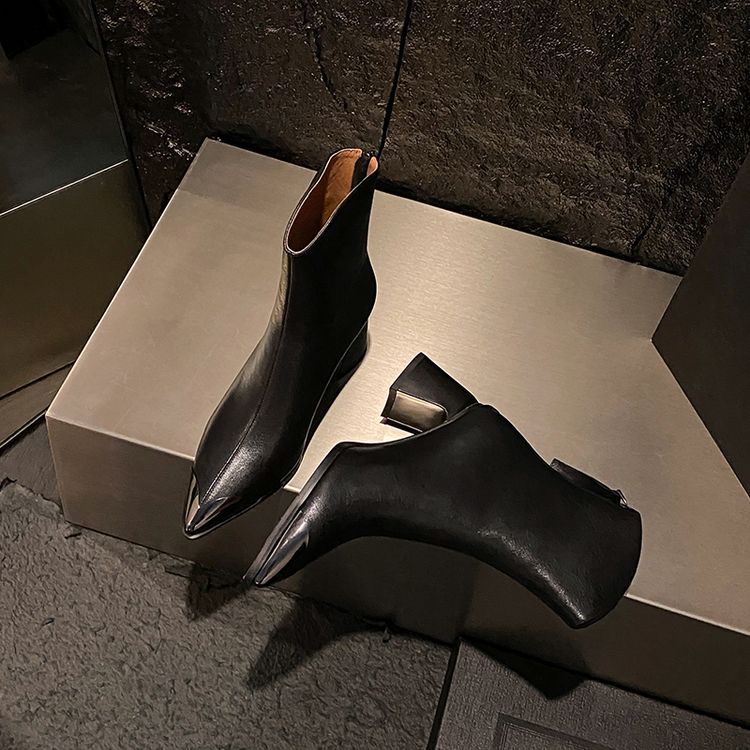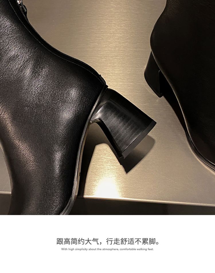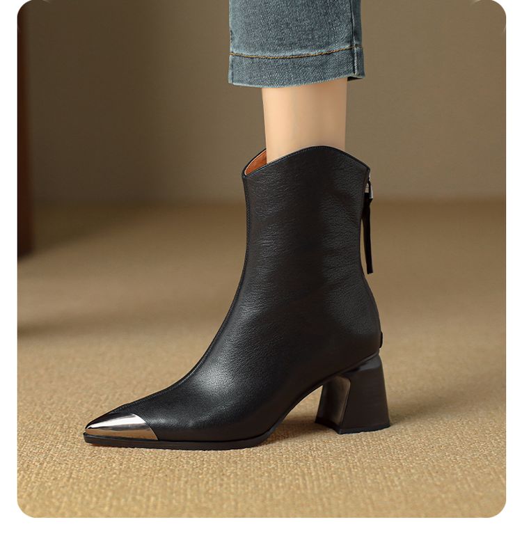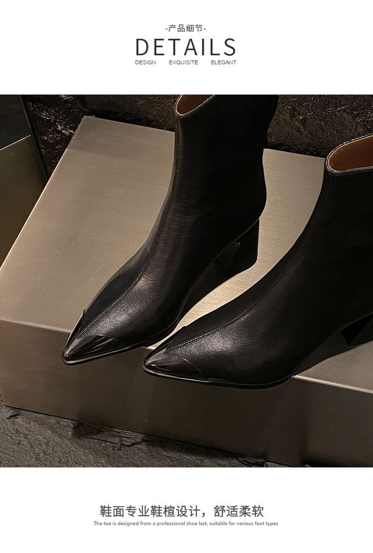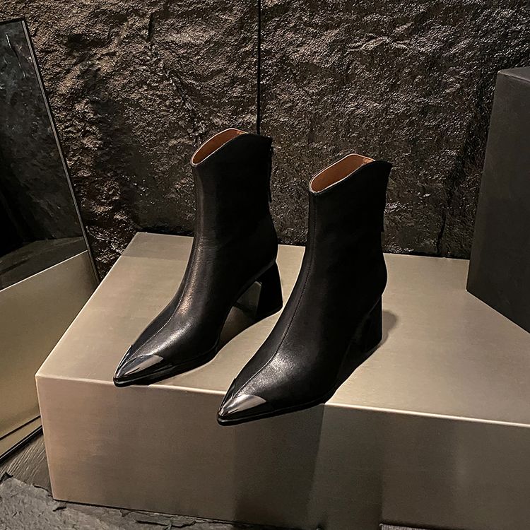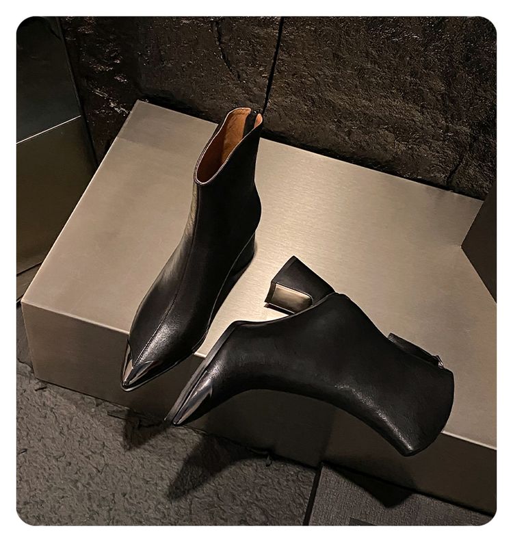 【预售5天】欧美复古风金属尖头气质短靴秋冬季新款后拉链时尚粗跟骑士皮靴KNTNX&KT3025-1