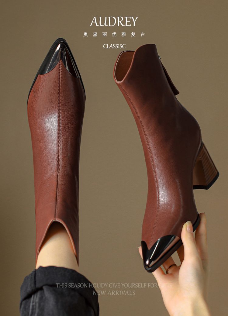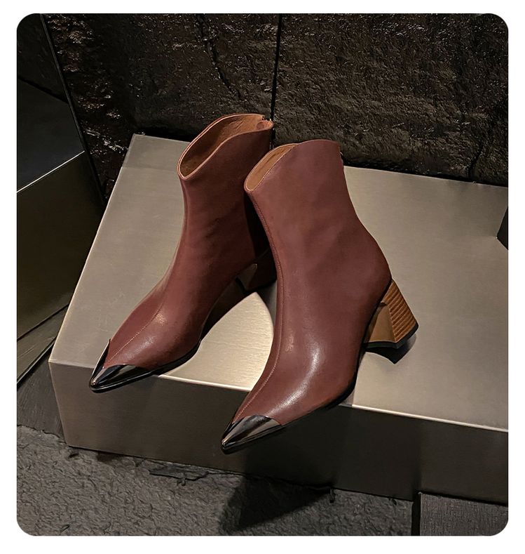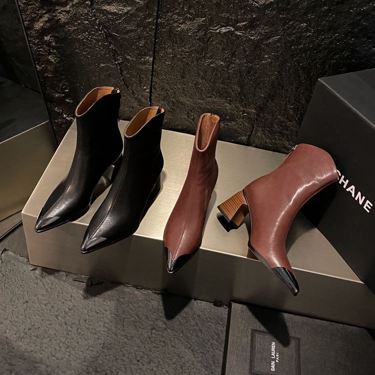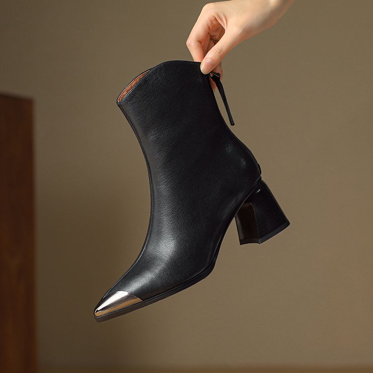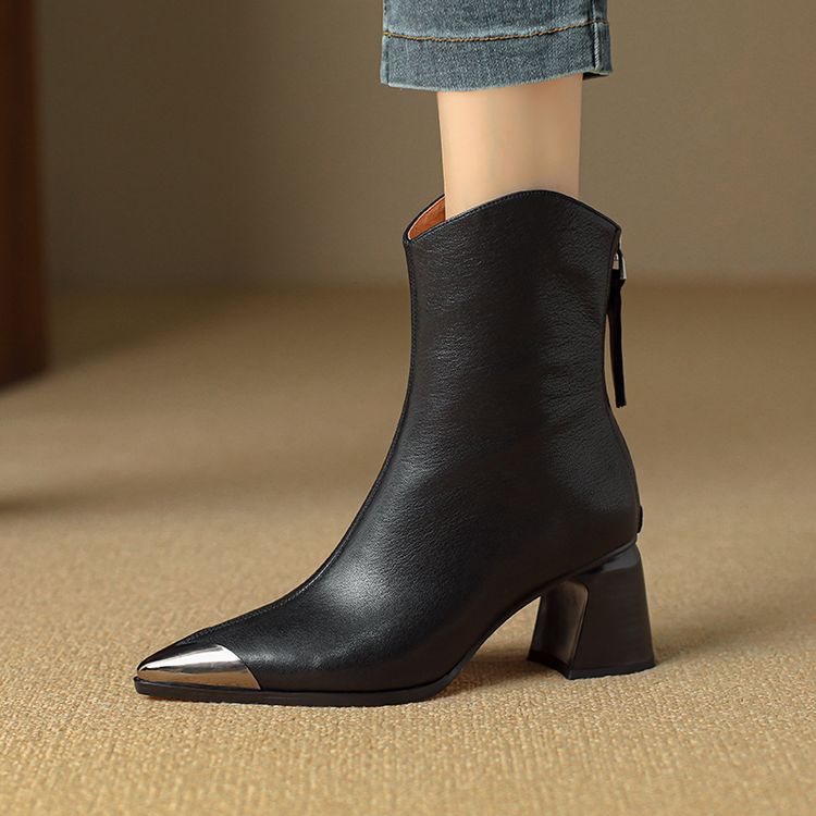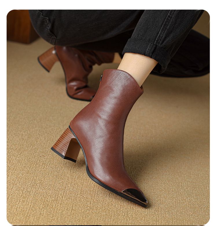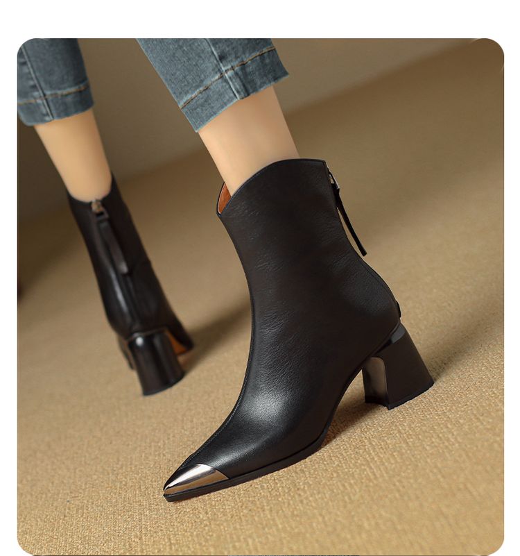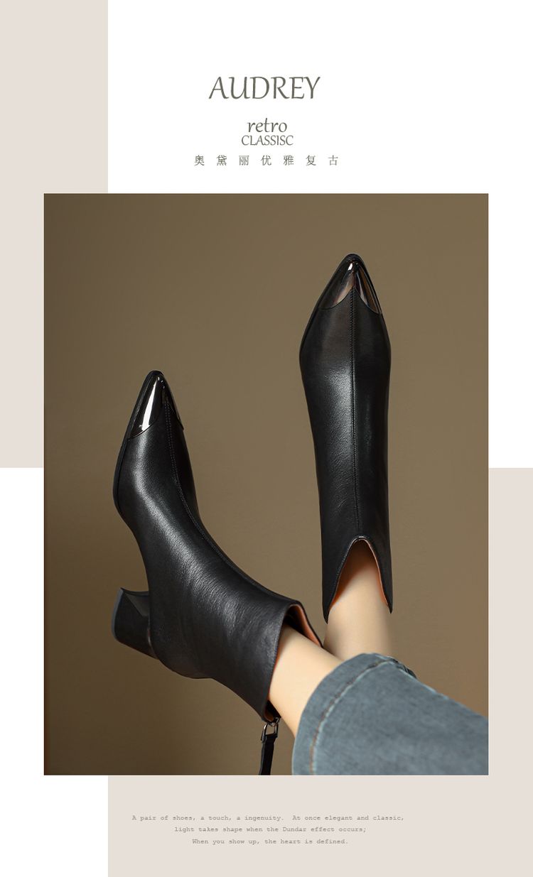 【预售5天】欧美复古风金属尖头气质短靴秋冬季新款后拉链时尚粗跟骑士皮靴KNTNX&KT3025-1
