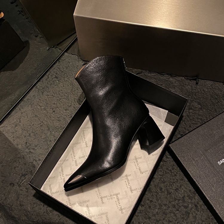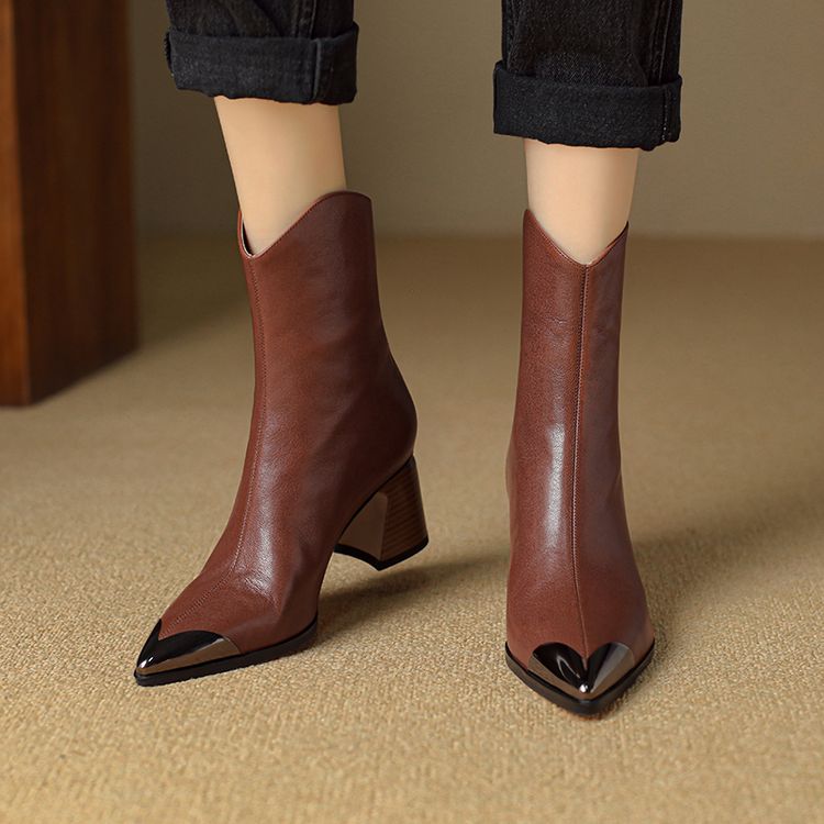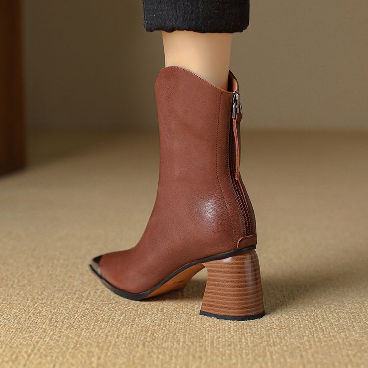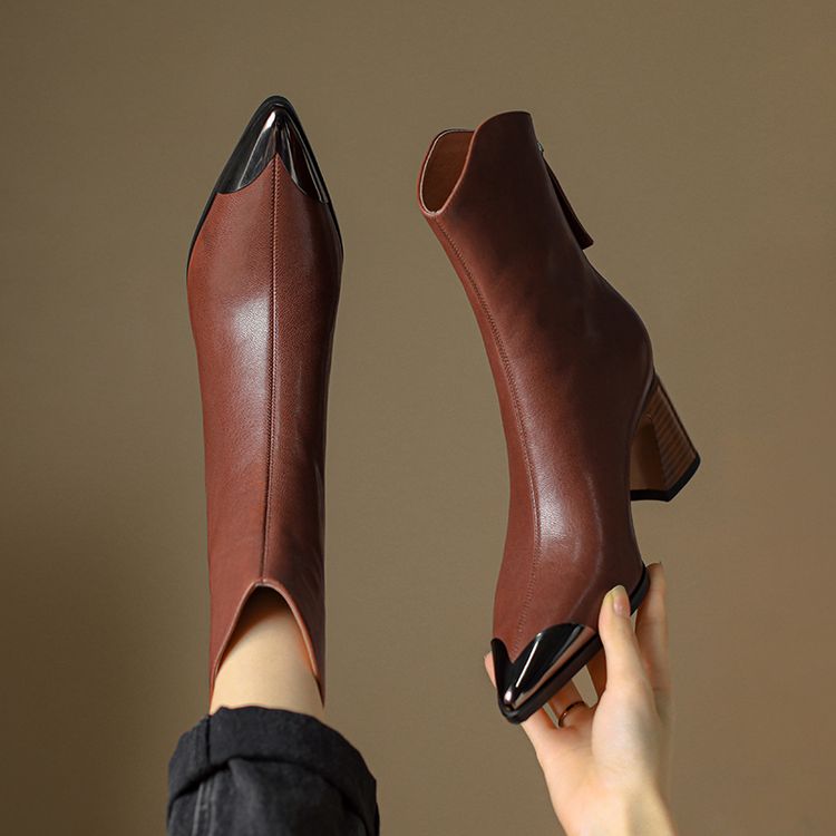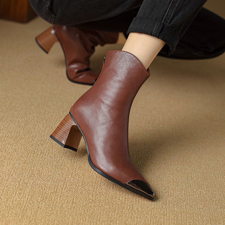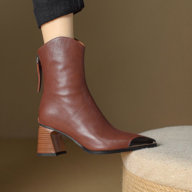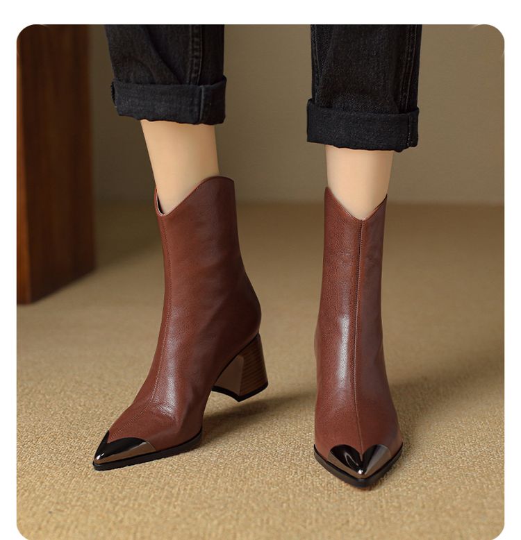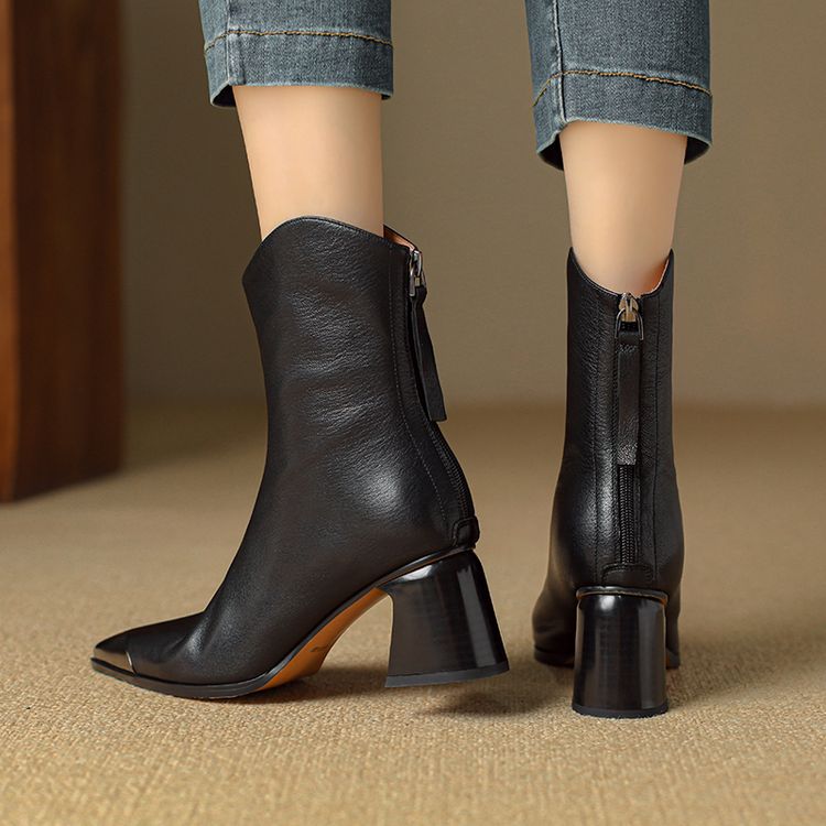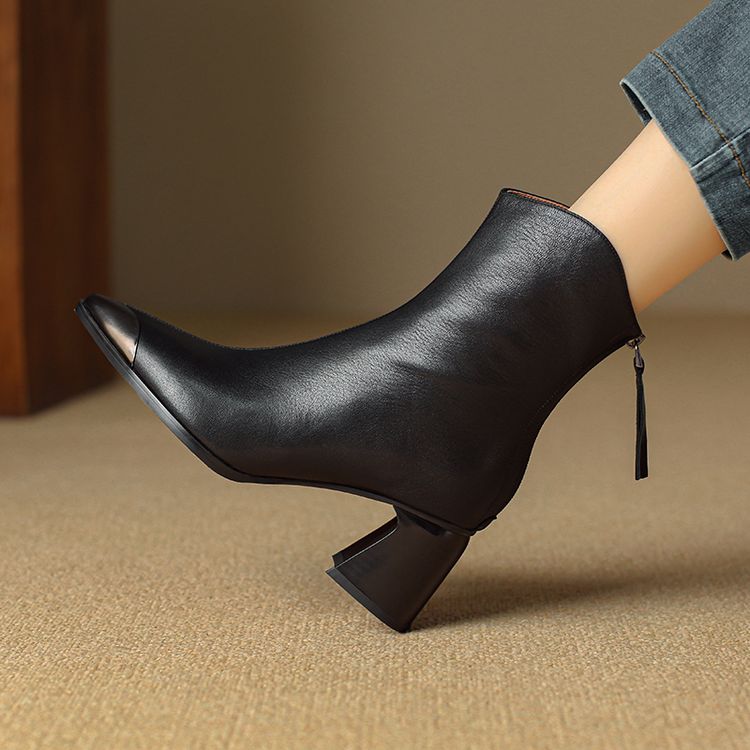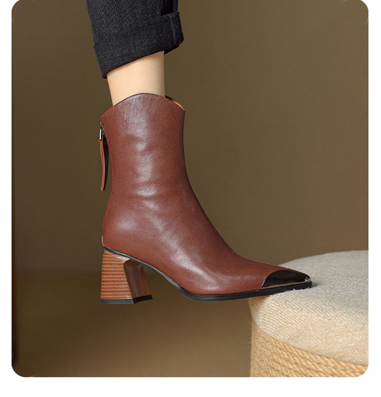 【预售5天】欧美复古风金属尖头气质短靴秋冬季新款后拉链时尚粗跟骑士皮靴KNTNX&KT3025-1