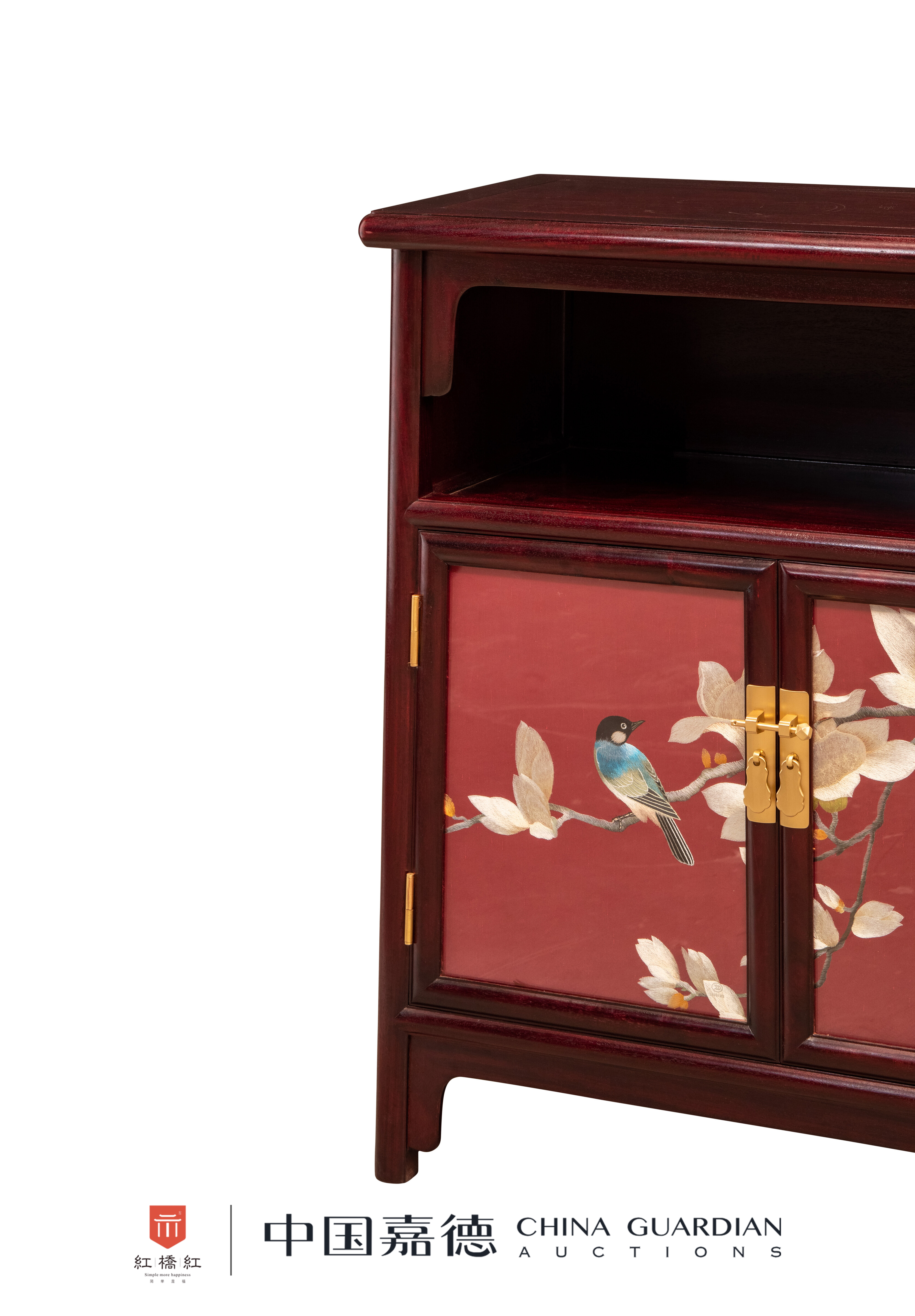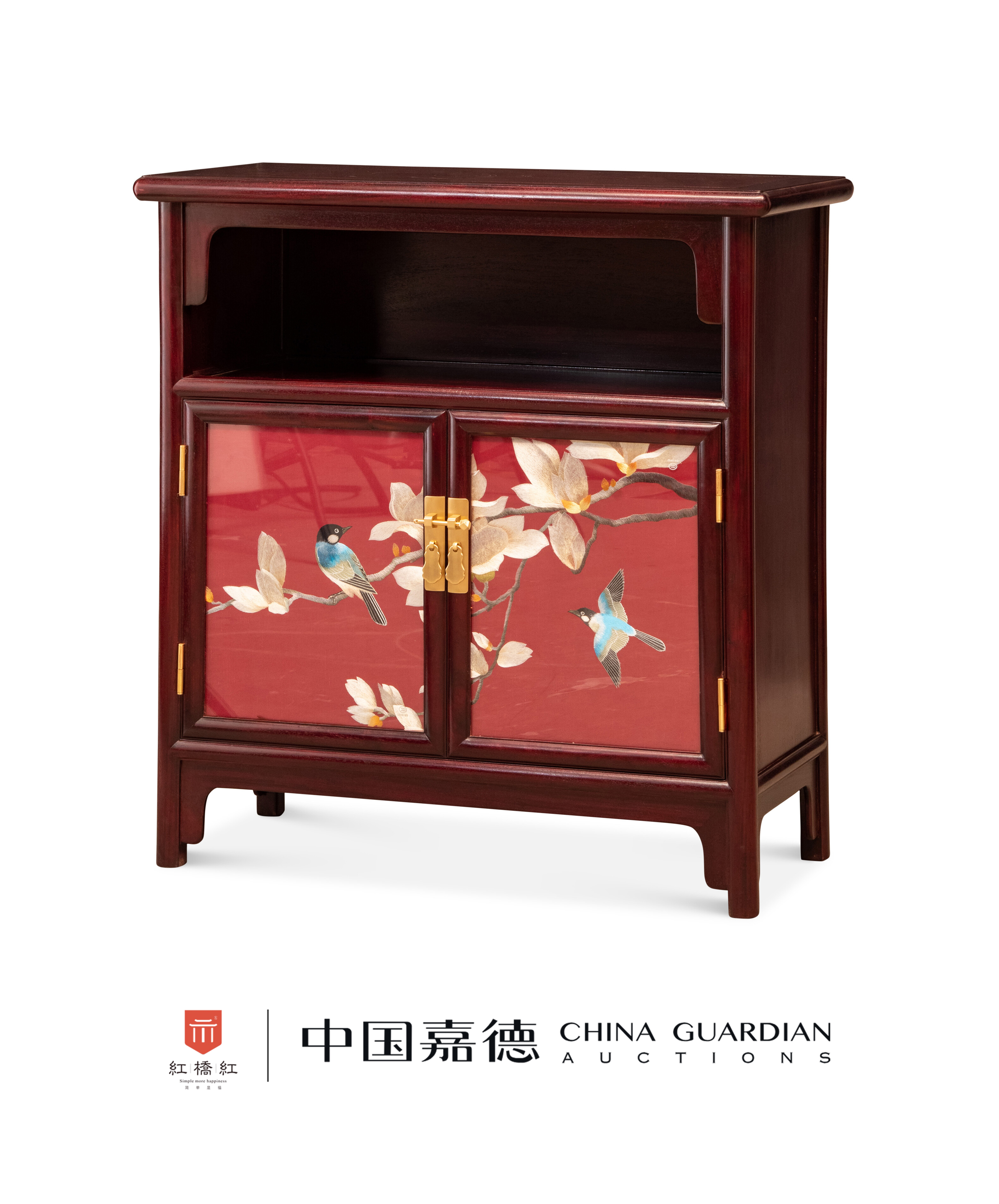 此柜可置于玄关,以赞比亚紫檀制作。圆角柜式样,整体A字形。上面为亮格,顶端饰刀牙板。亮格下为双开门,门板饰花鸟图,玉兰绽放,花开富贵,红色彰显吉祥寓意。门内空敞。腿足间安光素刀牙板,起到加固的作用。